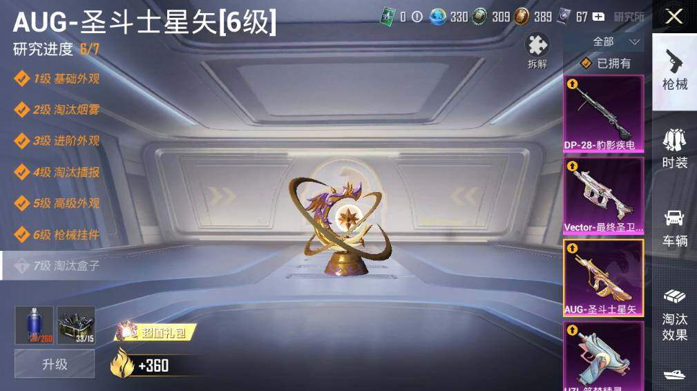 【粉色枪皮等级】:AKM-梦之光华(五级),SCAR-L-梦幻火箭(五级),AUG-圣斗士星矢(六级),UZI-筑梦精灵(四级),Vector-最终圣卫者(三级),DP-28-豹影疾电(五级)