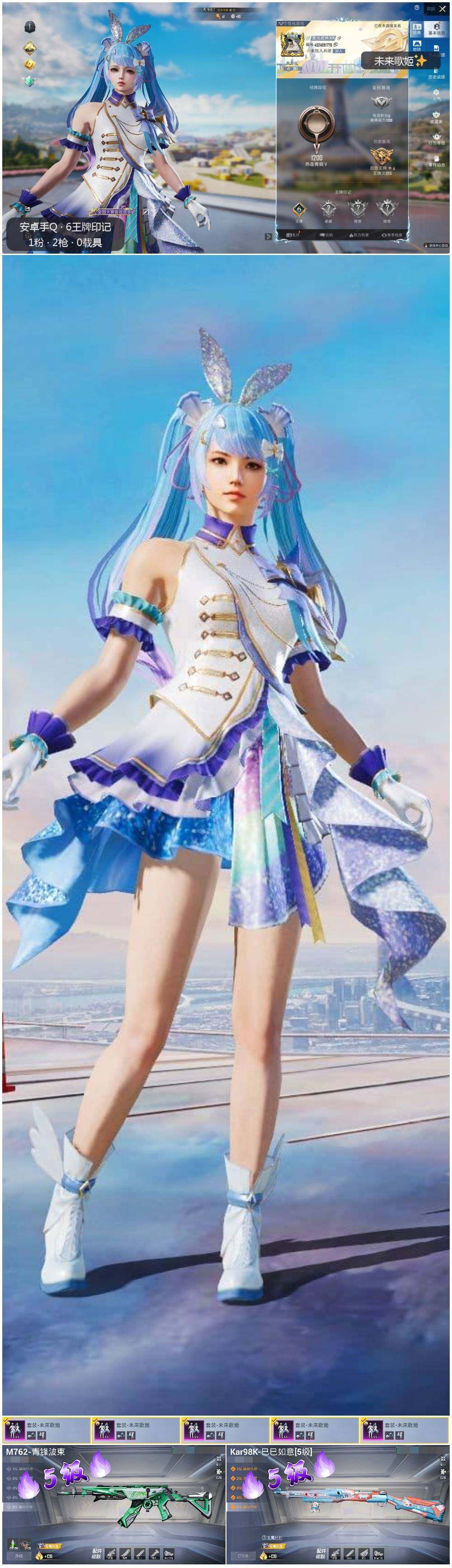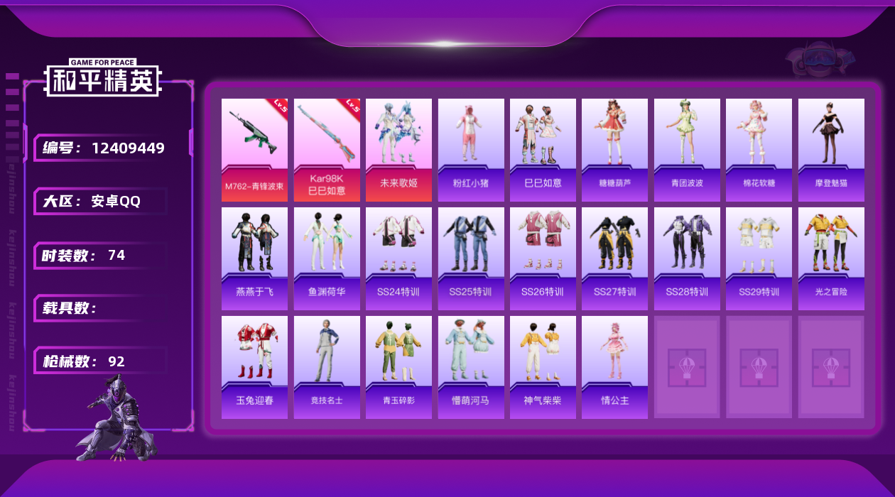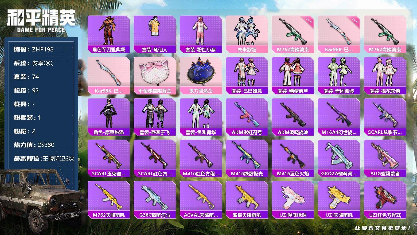 [12409449]【特价急出/详情看图】:安卓 手Q-1粉装-2特效枪-2.5w热力值-6王牌印记-74套装-92枪皮【热门品类】:角色-军刀雅典娜,套装-龟仙人,套装-粉红小猪【粉色套装】:粉装-未来歌姬【粉色枪皮等级】:M762-青锋波束(五级),Kar98K-巳巳如意(五级)