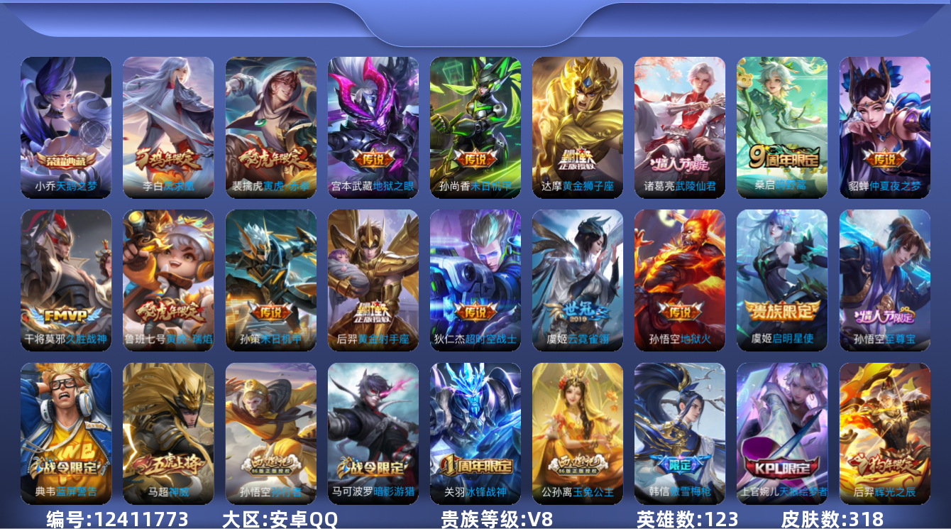 [12411773]【商品标题】:安卓Q-V0-尊贵铂金II段位-123英雄-318皮肤-1典藏-0珍品无双-0无双-0珍品传说-16传说-93史诗