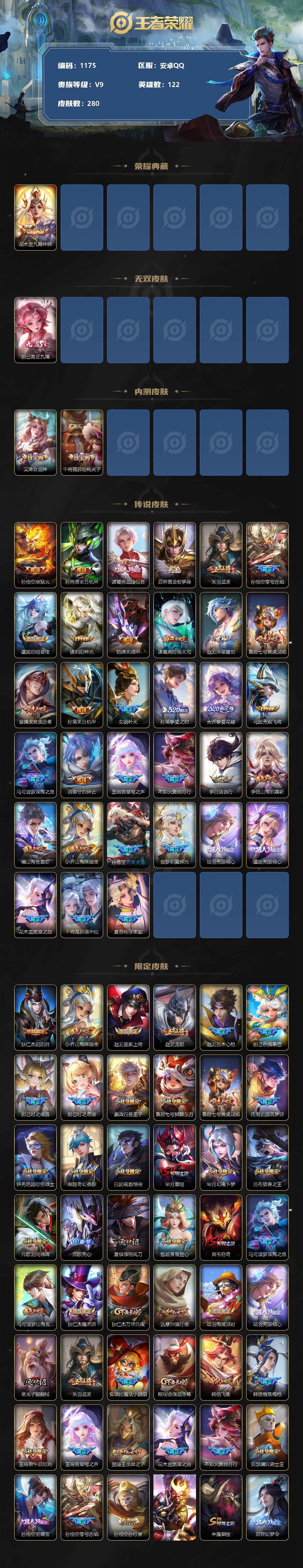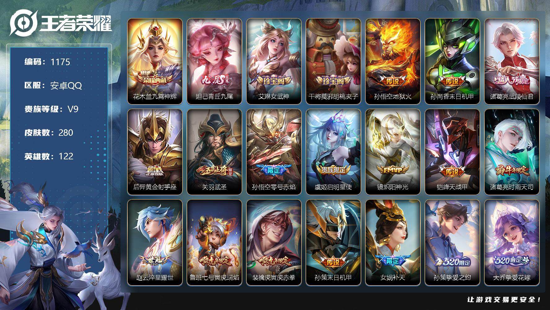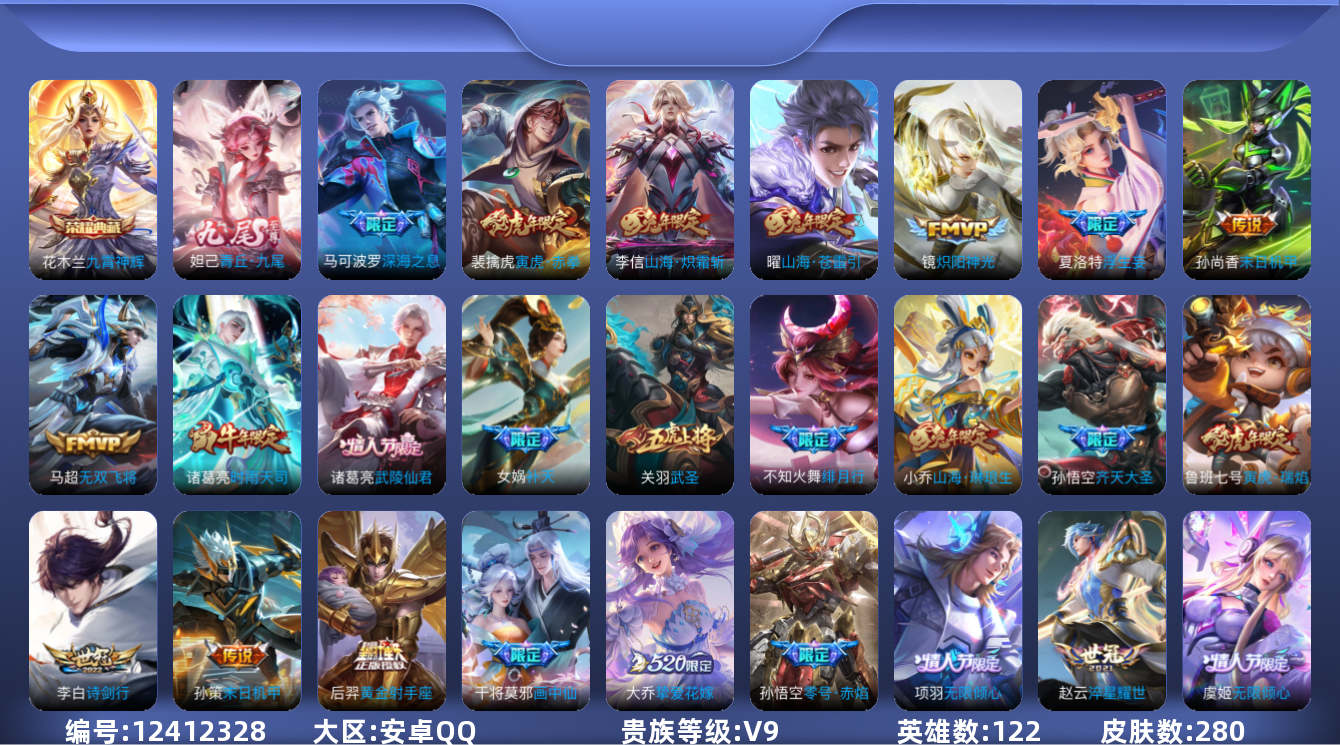 [12412328]【商品标题】:安卓Q-V9-荣耀黄金I段位-122英雄-280皮肤-1典藏-0珍品无双-1无双-0珍品传说-33传说-83史诗