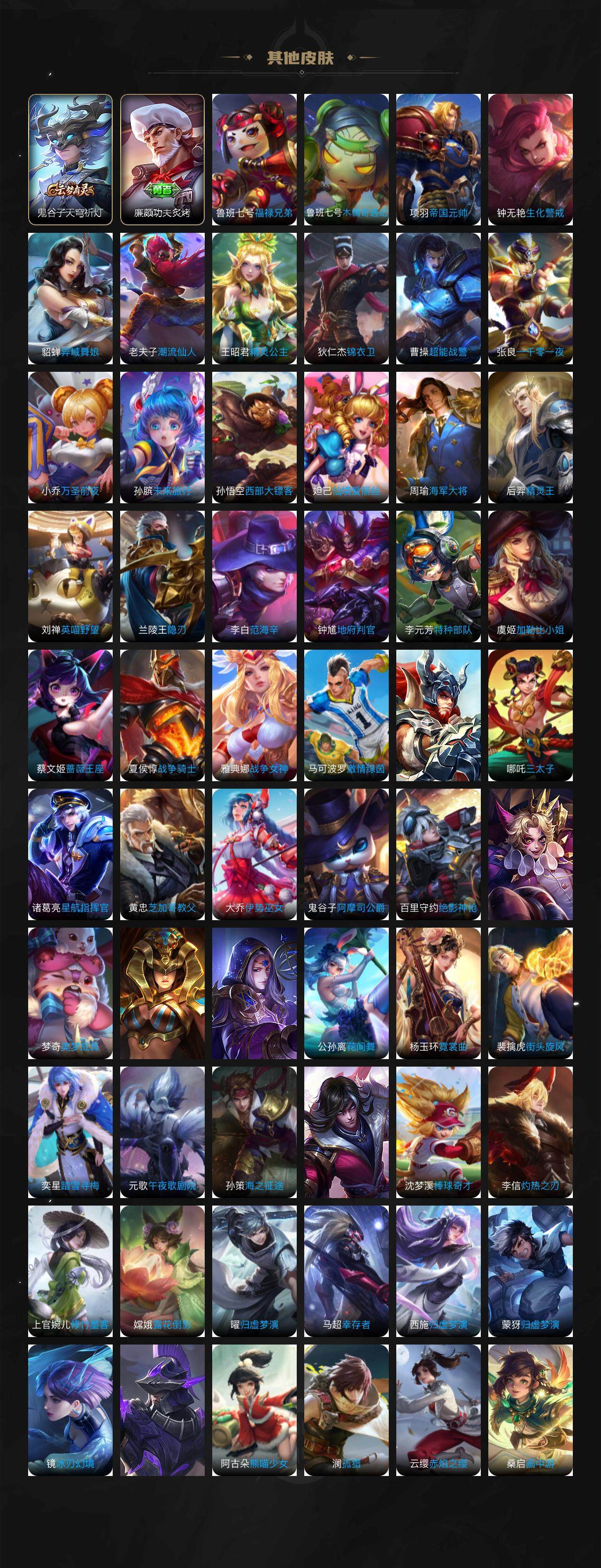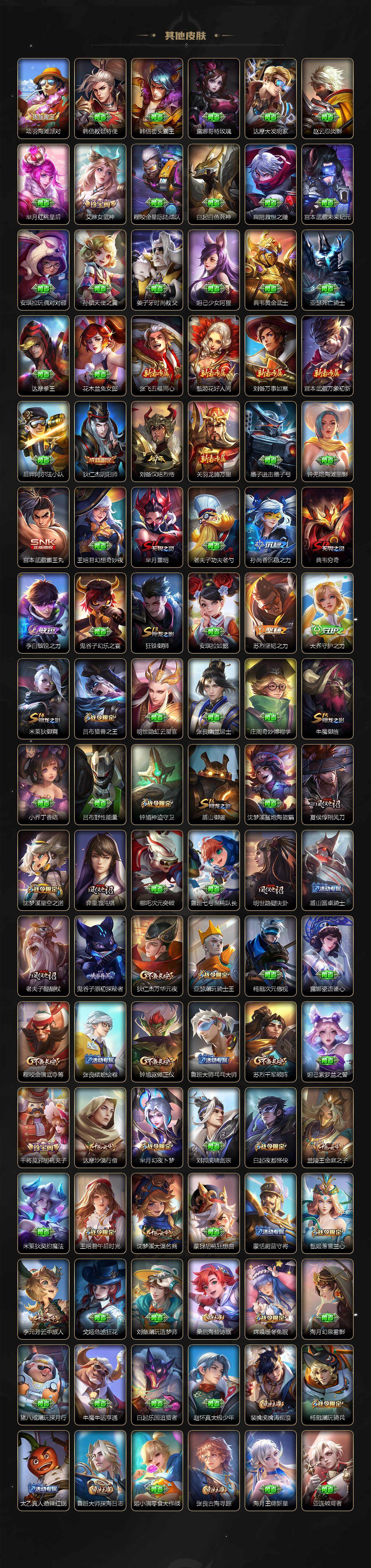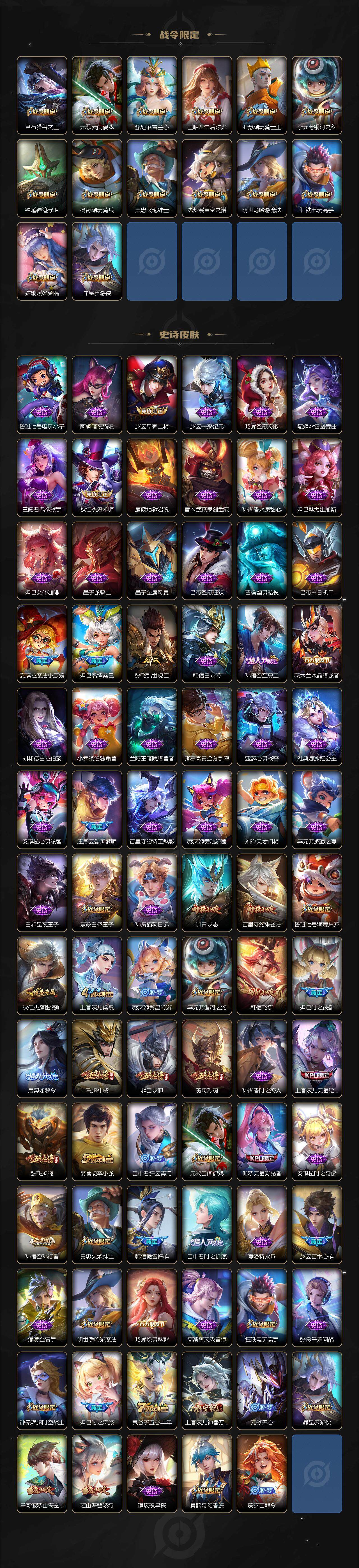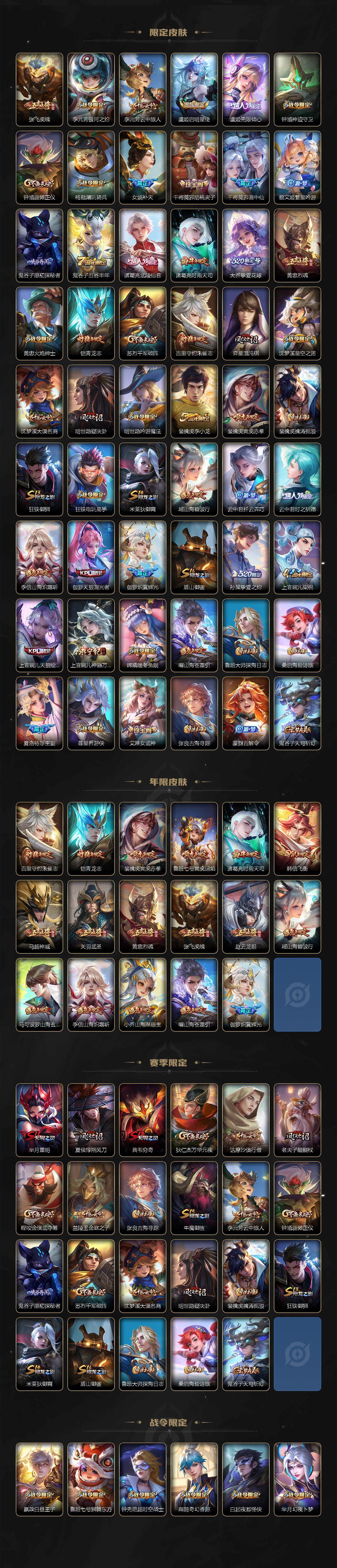 【限定皮肤】:狄仁杰阴阳师,小乔山海琳琅生,赵云皇家上将,赵云龙胆,赵云百木心枪,妲己热情桑巴,妲己时之彼端,妲己时之奇旅,嬴政白昼王子,鲁班七号狮舞东方,鲁班七号寅虎瑞焰,庄周云端筑梦师,钟无艳超时空战士,扁鹊奇幻香踪,白起夜都怪侠,芈月重明,芈月幻夜卜梦,吕布猎兽之王,元歌云间偶戏,元歌无心,夏侯惇朔风刀,甄姬落雪兰心,典韦穷奇,马可波罗深海之息,马可波罗山海玄木吟,狄仁杰魔术师,狄仁杰万华元夜,达摩沙漠行僧,项羽海滩派对,项羽无限倾心,老夫子醍醐杖,关羽武圣,安琪拉魔法小厨娘,程咬金演武夺筹,韩信飞衡,韩信傲雪梅枪,王昭君午后时光,王昭君星穹之声,兰陵王金庭之子,花木兰燃星之曲,不知火舞绯月行,亚瑟潮玩骑士王,孙悟空至尊宝,孙悟空零号赤焰,孙悟空孙行者,孙悟空齐天大圣,牛魔御旌,后羿如梦令,张飞虎魄,李元芳银河之约,李元芳云中旅人,虞姬启明星使,虞姬无限倾心,钟馗神迹守卫,钟馗驱傩正仪,杨戬潮玩骑兵,女娲补天,干将莫邪胡桃夹子,干将莫邪画中仙,蔡文姬繁星吟游,鬼谷子原初探秘者,鬼谷子五谷丰年,诸葛亮武陵仙君,诸葛亮时雨天司,大乔挚爱花嫁,黄忠烈魂,黄忠火炮绅士,铠青龙志,苏烈千军破阵,百里守约朱雀志,弈星混沌棋,沈梦溪星空之诺,沈梦溪大漠名商,明世隐疑决卦,明世隐吟游魔法,裴擒虎李小龙,裴擒虎寅虎赤拳,裴擒虎擒涛扼浪,狂铁御狮,狂铁电玩高手,米莱狄御霄,瑶山海碧波行,云中君纤云弄巧,云中君时之祈愿,李信山海炽霜斩,伽罗天狼溯光者,伽罗炽翼辉光,盾
