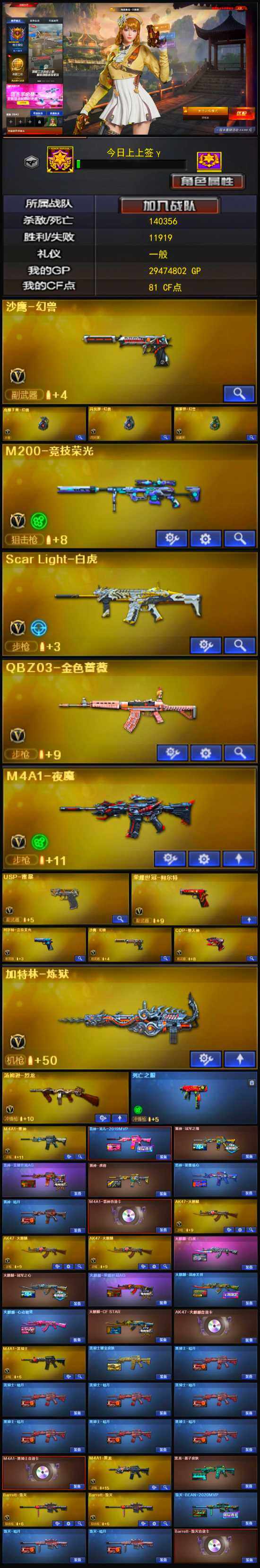 【热门武器】:QBZ03-金色蔷薇,Scar Light-白虎,M200-竞技荣光,死亡之眼,荣耀世冠-火麒麟,荣耀世冠-雷神,荣耀世冠-柯尔特,M4A1-黑骑士,汤姆逊-烈龙,加特林-炼狱,毁灭-孙三炮,裁决-雪莉杨,USP-雷暴,COP-堕天神,沙鹰-修罗,荣耀世冠-龙啸,高爆手雷-幻兽