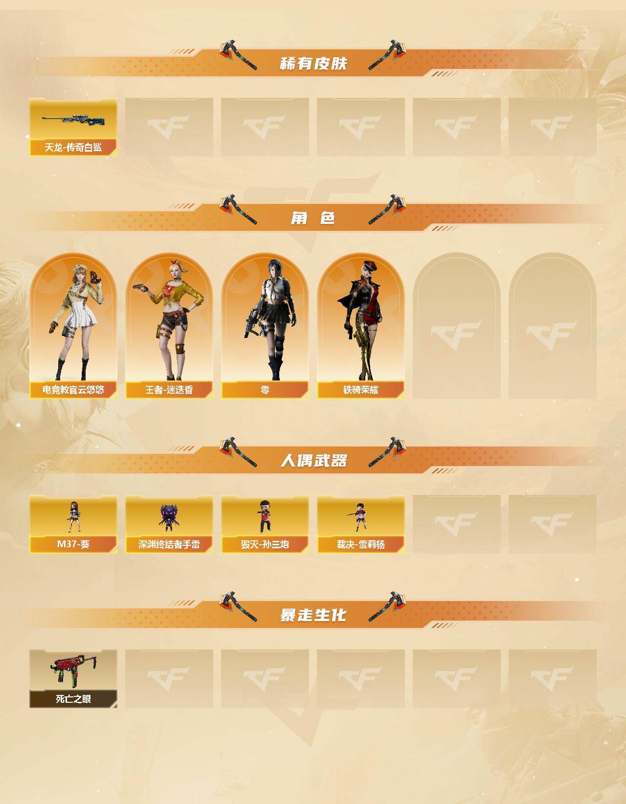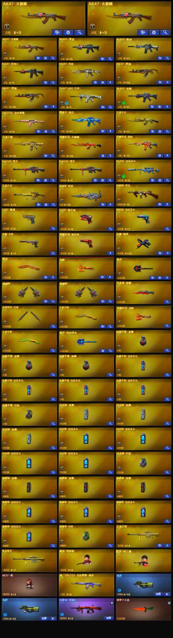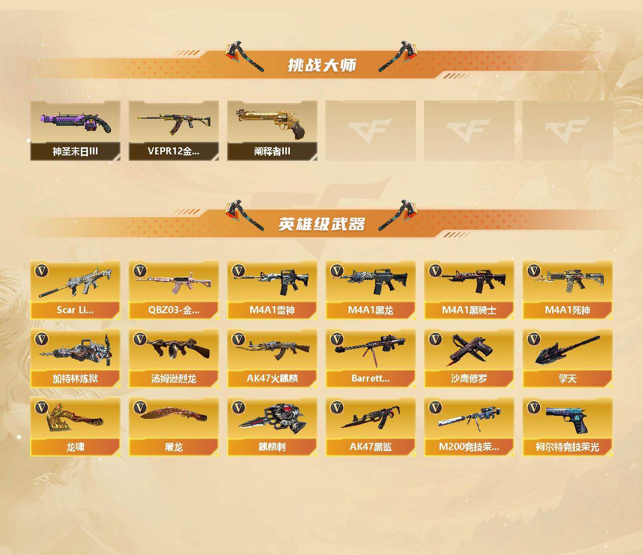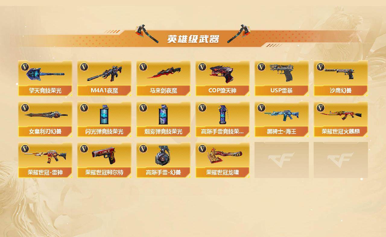 【英雄级武器】:M200-竞技荣光,柯尔特-竞技荣光,擎天-竞技荣光,高爆手雷-竞技荣光*4,烟雾弹-竞技荣光*4,闪光弹-竞技荣光*4,M4A1-夜魔,马来剑-夜魔,COP-堕天神,USP-雷暴,沙鹰-幻兽,女皇利刃-幻兽,荣耀世冠-火麒麟,荣耀世冠-雷神,荣耀世冠-柯尔特,荣耀世冠-龙啸,QBZ03-金色蔷薇,Scar Light-白虎,M4A1-雷神,M4A1-黑龙,M4A1-黑骑士,M4A1-死神,加特林-炼狱,汤姆逊-烈龙,AK47-火麒麟*3,Barrett-毁灭*2,AK47-黑鲨*2,黑骑士-海王,沙鹰-修罗,麒麟刺*2,擎天,龙啸,屠龙,高爆手雷-幻兽