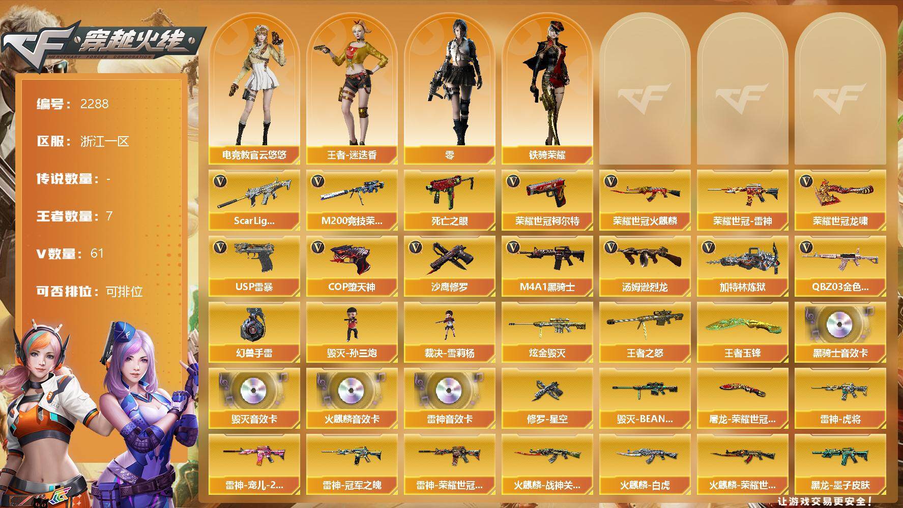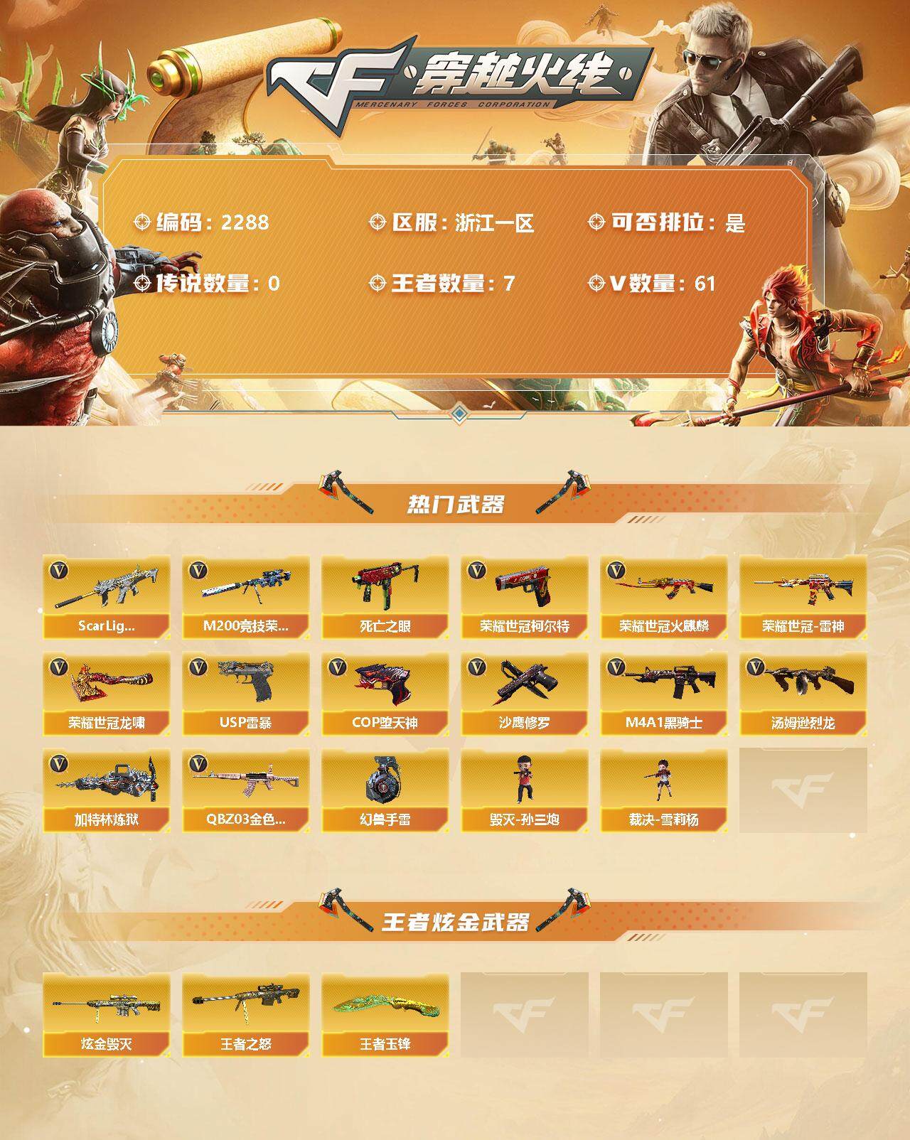 [12412337]【商品标题】:浙江一区-61V-7王者-1炫金 【热门武器】:QBZ03-金色蔷薇,Scar Light-白虎,M200-竞技荣光,死亡之眼,荣耀世冠-火麒麟,荣耀世冠-雷神,荣耀世冠-柯尔特,M4A1-黑骑士,汤姆逊-烈龙,加特林-炼狱,毁灭-孙三炮,裁决-雪莉杨,USP-雷暴,COP-堕天神,沙鹰-修罗,荣耀世冠-龙啸,高爆手雷-幻兽 【王者炫金武器】:炫金毁灭,王者之怒,王者玉锋 【音效卡】:AK47-火麒麟音效卡,M4A1-雷神音效卡,M4A1-黑骑士音效卡,Barrett-毁灭音效卡 【稀有皮肤】:雷神-能量核心,雷神-虎将,雷神-冠军之魄,雷神-宠儿-2019MVP,雷神-荣耀世冠AG,火麒麟-冠军之心,火麒麟-战神关羽,火麒麟-白虎,火麒麟-荣耀世冠AG,火麒麟-心动糖果,黑骑士-暗月*7,黑龙-墨子皮肤,毁灭-暗月*2,毁灭-BEAN-2020MVP,AWM-天龙-传奇70KG,AWM-天龙-传奇白鲨,修罗-星空,天神-暗月,屠龙-荣耀世冠AG 【角色】:王者-迷迭香,零,电竞教官-云悠悠,铁骑荣耀 【人偶武器】:毁灭-孙三炮,裁决-雪莉杨,M37-葵,深渊终结者手雷 【暴走生化】:死亡之眼 【挑战大师】:神圣爆裂者-末日III,阐释者III,VEPR-12-金魔 【英雄级武器】:M200-竞技荣光,柯尔特-竞技荣光,擎天-竞技荣光,高爆手雷-竞技荣光*4,烟雾弹-竞技荣光*4,闪光弹-竞技荣光*4,M4A1-夜魔,马来剑-夜魔,COP-堕天神,USP-雷暴,沙鹰-幻兽,女皇利刃-幻兽,荣耀世冠-火麒麟,荣耀世冠-雷神,荣耀世冠-柯尔特,荣耀世冠-龙啸,QBZ03-金色蔷薇,Scar Light-白虎,M4A1-雷神,M4A1-黑龙,M4A1-黑骑士,M4A1-死神,加特林-炼狱,汤姆逊-烈龙,AK47-火麒麟*3,Barrett-毁灭*2,AK47-黑鲨*2,黑骑士-海王,沙鹰-修罗,麒麟刺*2,擎天,龙啸,屠龙,高爆手雷-幻兽 【特殊枪械】:1白虎,1黑骑士,1烈龙,1炼狱