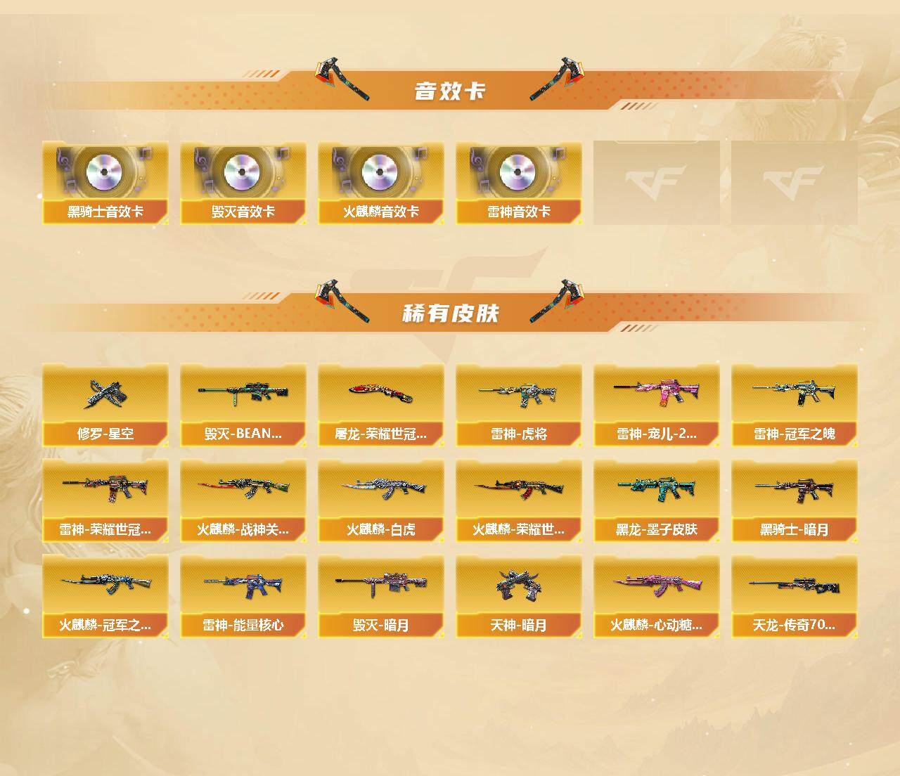 【音效卡】:AK47-火麒麟音效卡,M4A1-雷神音效卡,M4A1-黑骑士音效卡,Barrett-毁灭音效卡