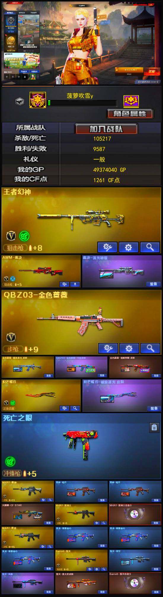 - PX_2060286-时装数: 107 枪械数: 144 战备数: 94 热门装扮: 鹰眼刺客,智耀战神 稀有枪皮: M416电玩时刻,UMP45量子极限,M762-青锋波束,GROZA-镜光银凌,AUG-暖羊咩咩,AMR-智耀战神