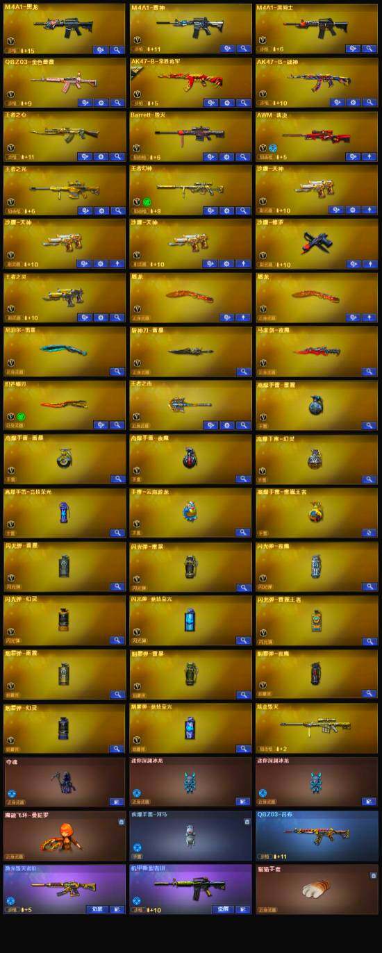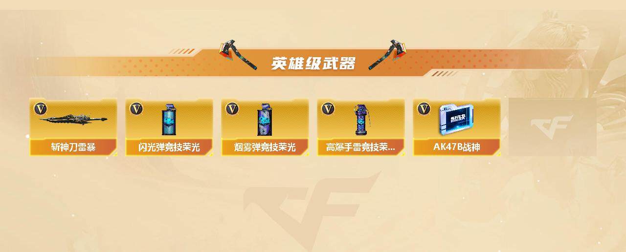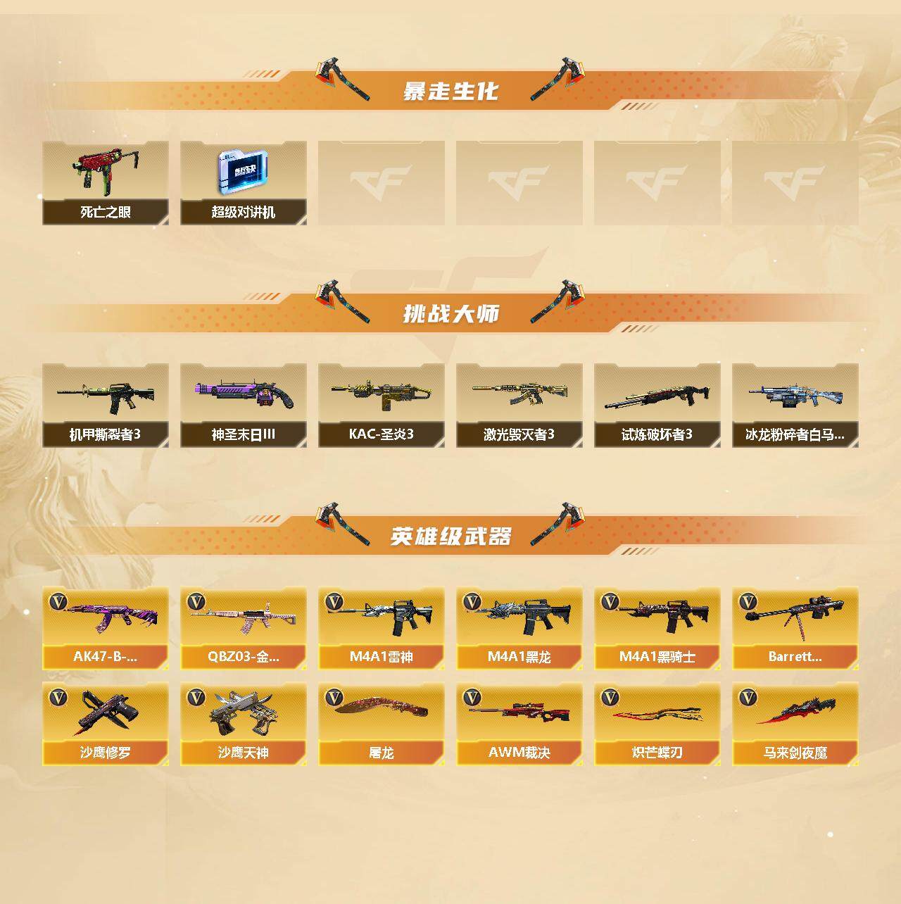 【英雄级武器】:高爆手雷-竞技荣光,烟雾弹-竞技荣光,闪光弹-竞技荣光,马来剑-夜魔,斩神刀-雷暴,QBZ03-金色蔷薇,M4A1-雷神,M4A1-黑龙,M4A1-黑骑士,Barrett-毁灭,AWM-裁决,AK47-B-战神,AK47-B-常胜将军,沙鹰-天神*3,沙鹰-修罗,炽芒蝶刃,屠龙*2