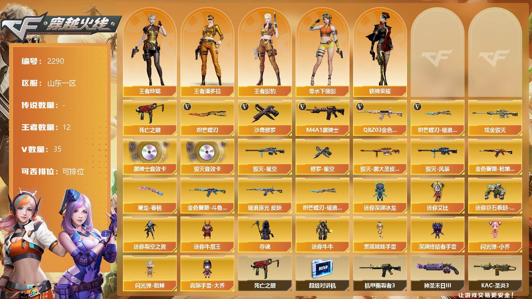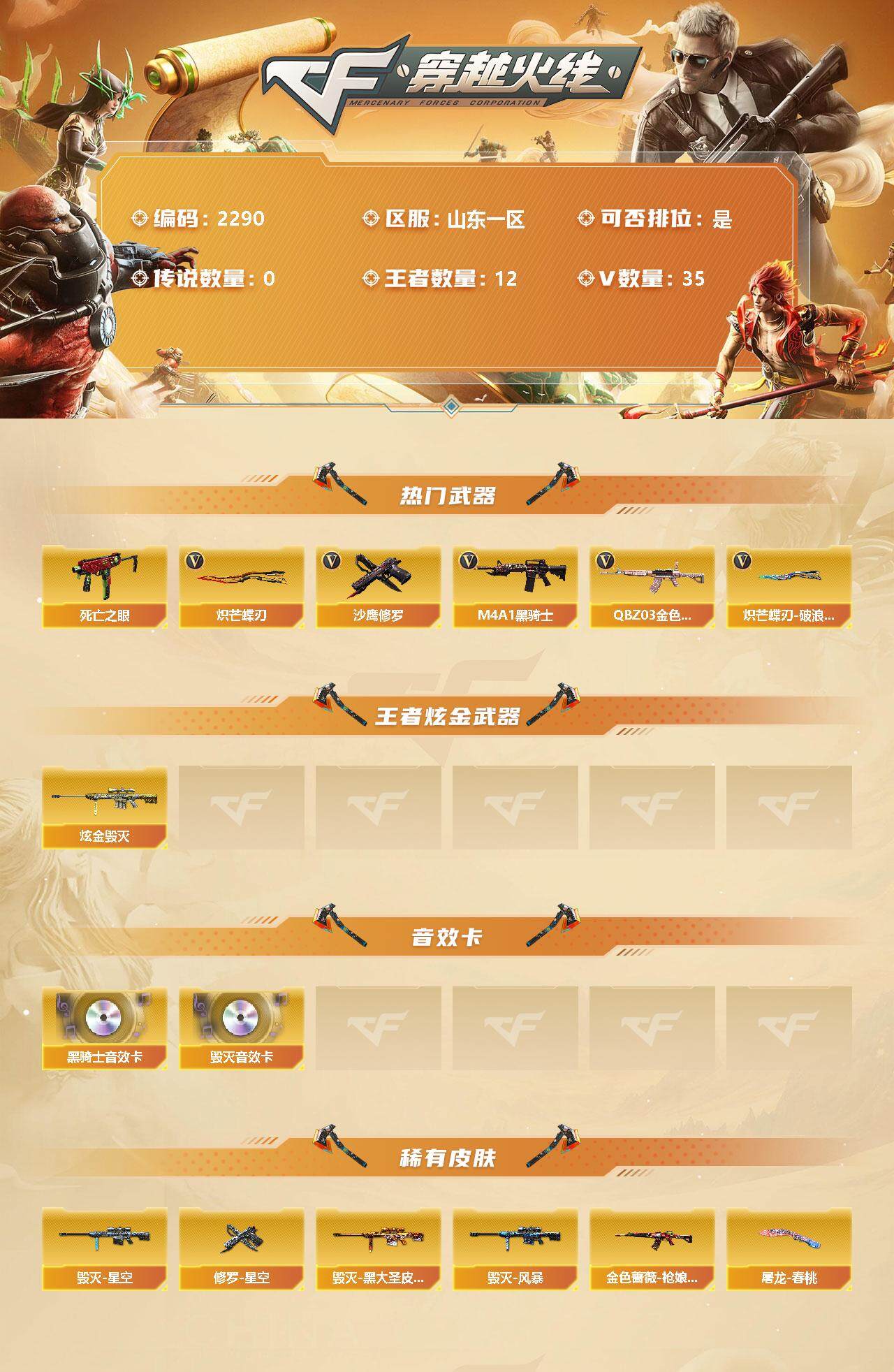 [12412354]【商品标题】:山东一区-35V-12王者-1炫金 【热门武器】:QBZ03-金色蔷薇,死亡之眼,M4A1-黑骑士,沙鹰-修罗,炽芒蝶刃,炽芒蝶刃-破浪逐光 皮肤 【王者炫金武器】:炫金毁灭 【音效卡】:M4A1-黑骑士音效卡,Barrett-毁灭音效卡 【稀有皮肤】:金色蔷薇-枪娘阿敏 皮肤,QBZ03-金色蔷薇-斗鱼皮肤,金色蔷薇-破浪逐光 皮肤,毁灭-星空,毁灭-黑大圣皮肤,毁灭-风暴,修罗-星空*2,炽芒蝶刃-破浪逐光 皮肤,屠龙-春桃 皮肤 【角色】:王者玲珑,王者影豹,王者潘多拉,零-水下丽影,铁骑荣耀 【人偶武器】:迷你深渊冰龙*2,迷你艾比,迷你巨石泰坦-魔花研究所,迷你裂空之翼,迷你牛魔王,夺魂,迷你牛牛*3,灵狐娃娃手雷,深渊终结者手雷*3,闪光弹-小乔,闪光弹-貂蝉,高爆手雷-大乔 【暴走生化】:死亡之眼,超级对讲机 【挑战大师】:机甲撕裂者III,神圣爆裂者-末日III,KAC-圣炎切割者III,试炼破坏者III,激光毁灭者III,冰龙粉碎者-白马银枪*2 【英雄级武器】:高爆手雷-竞技荣光,烟雾弹-竞技荣光,闪光弹-竞技荣光,马来剑-夜魔,斩神刀-雷暴,QBZ03-金色蔷薇,M4A1-雷神,M4A1-黑龙,M4A1-黑骑士,Barrett-毁灭,AWM-裁决,AK47-B-战神,AK47-B-常胜将军,沙鹰-天神*3,沙鹰-修罗,炽芒蝶刃,屠龙*2 【特殊枪械】:1黑骑士