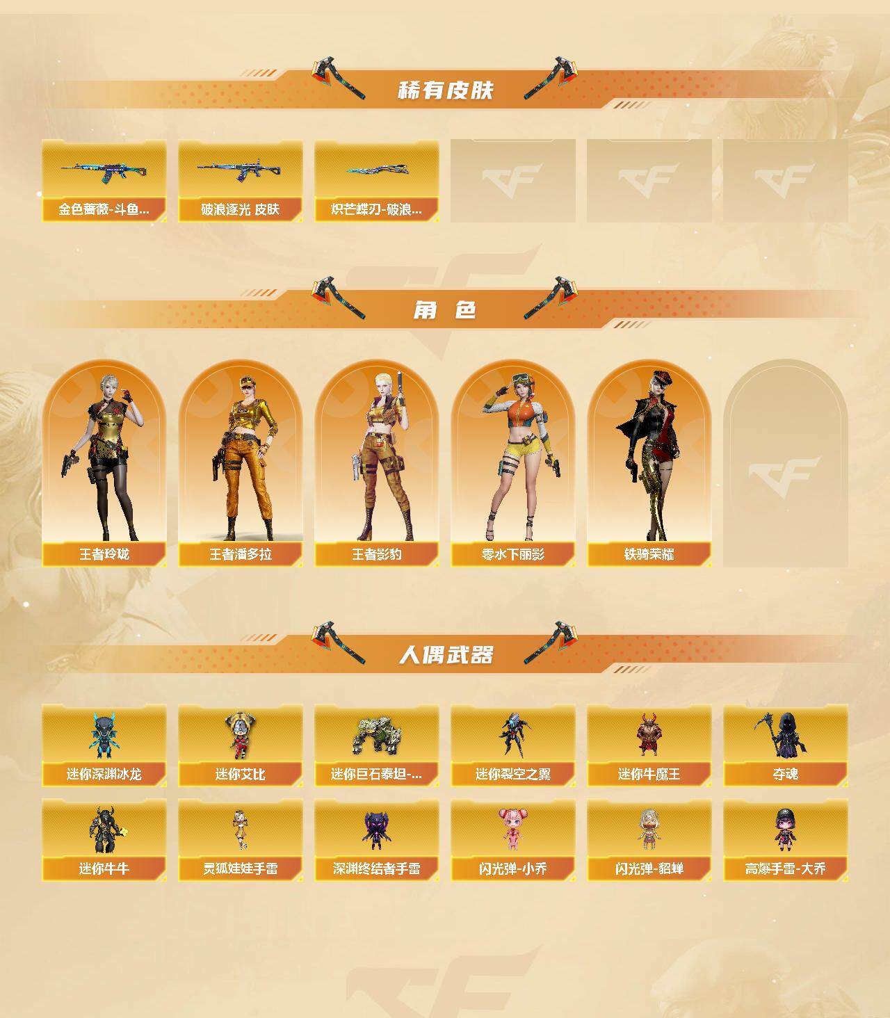 【人偶武器】:迷你深渊冰龙*2,迷你艾比,迷你巨石泰坦-魔花研究所,迷你裂空之翼,迷你牛魔王,夺魂,迷你牛牛*3,灵狐娃娃手雷,深渊终结者手雷*3,闪光弹-小乔,闪光弹-貂蝉,高爆手雷-大乔