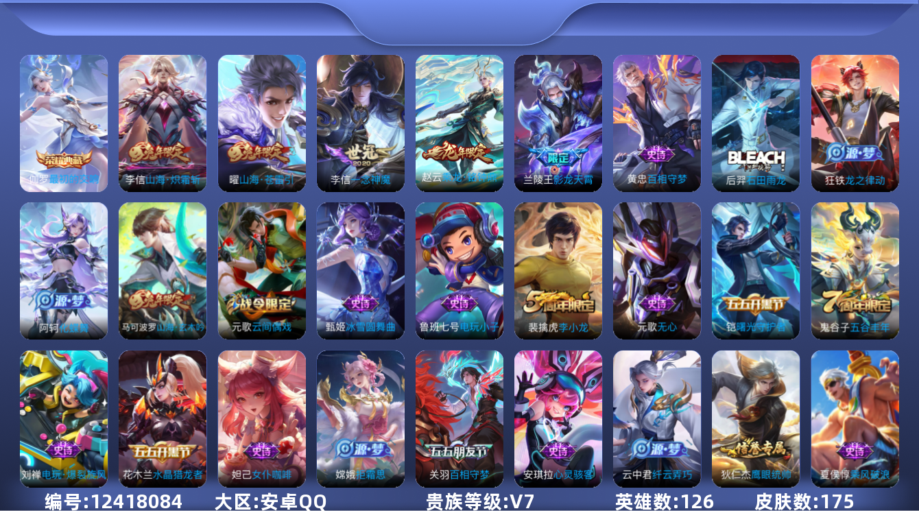 [12418084]【商品标题】:安卓Q-V6-最强王者段位-125英雄-173皮肤-0典藏-0珍品无双-0无双-0珍品传说-5传说-47史诗