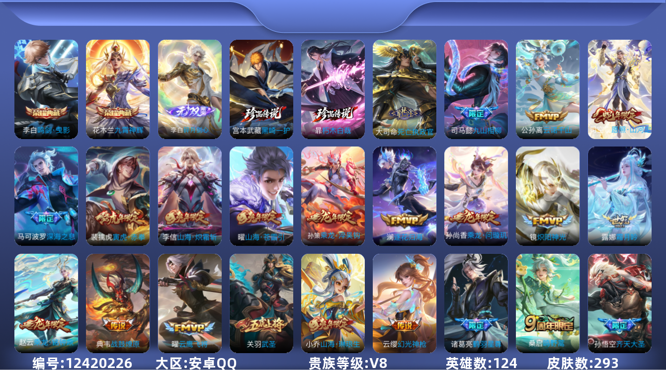 [12420226]【商品标题】:安卓Q-V4-至尊星耀I段位-123英雄-285皮肤-2典藏-0珍品无双-0无双-0珍品传说-22传说-93史诗