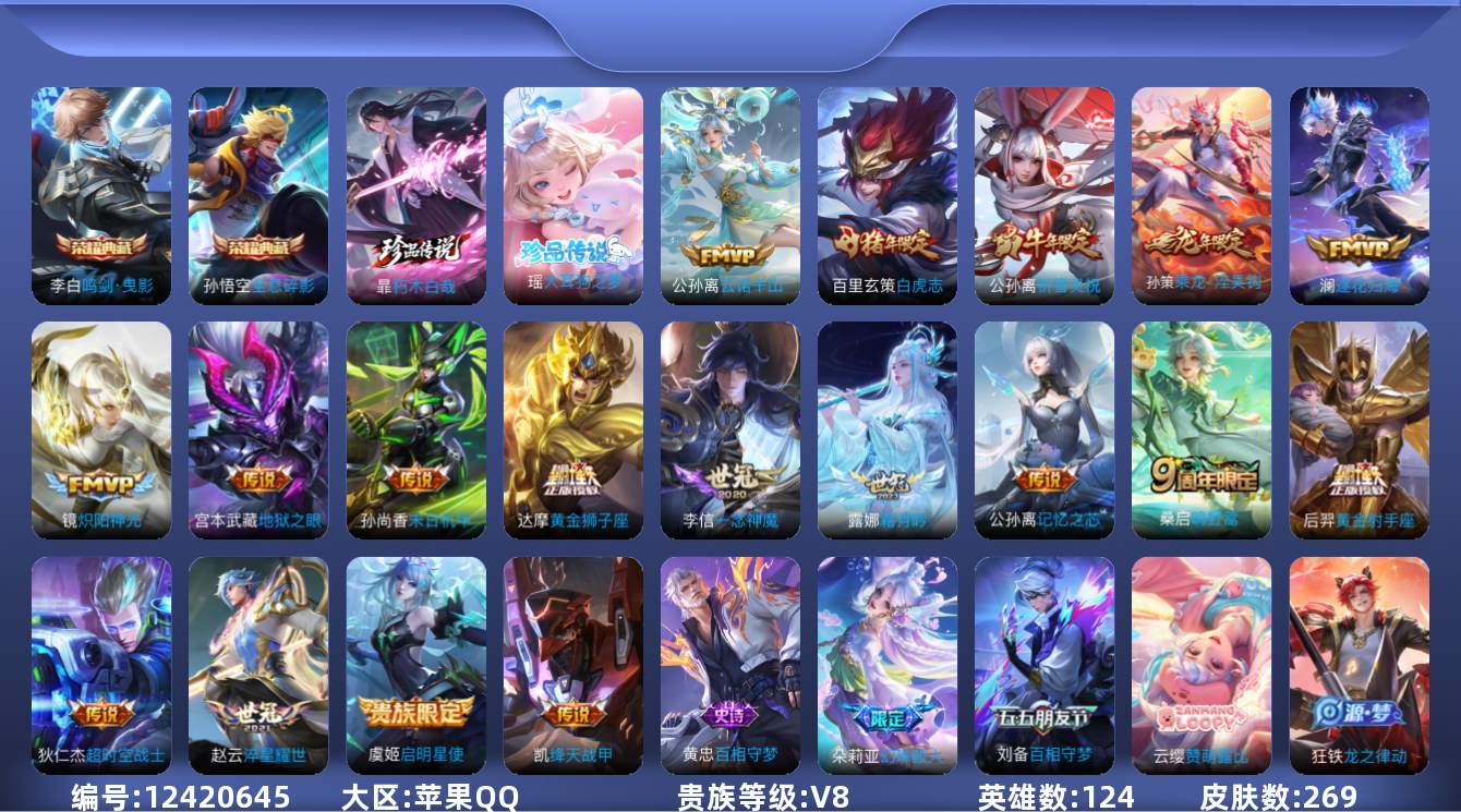 [12420645]【商品标题】:苹果Q-V8-永恒钻石III段位-124英雄-269皮肤-2典藏-0珍品无双-0无双-2珍品传说-18传说-84史诗