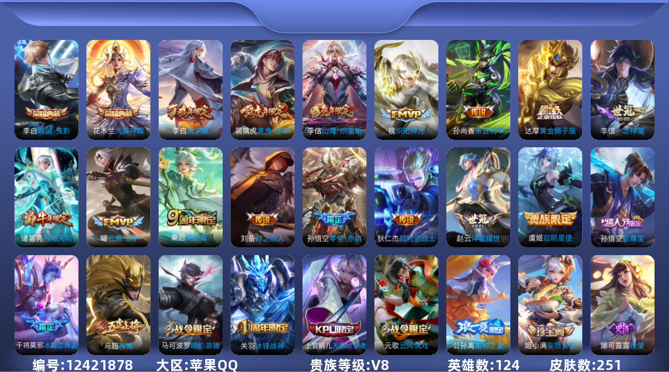 [12421878]【商品标题】:苹果Q-V8-至尊星耀II段位-124英雄-251皮肤-2典藏-0珍品无双-0无双-0珍品传说-15传说-82史诗