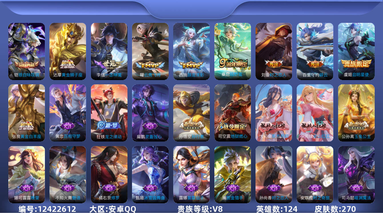 [12422612]【商品标题】:安卓Q-V8-最强王者段位-124英雄-270皮肤-1典藏-0珍品无双-0无双-0珍品传说-9传说-77史诗
