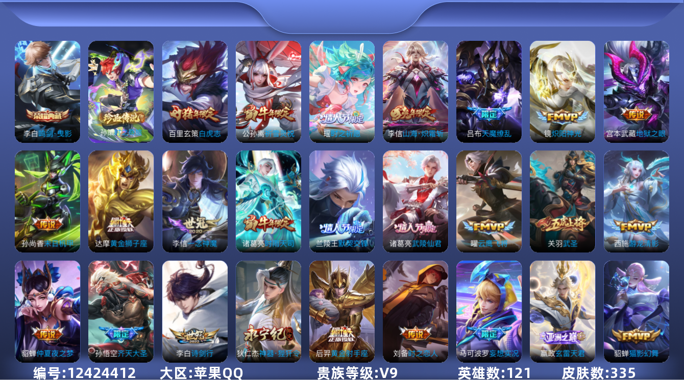 [12424412]【商品标题】:苹果Q-V9-荣耀黄金II段位-121英雄-335皮肤-1典藏-0珍品无双-0无双-1珍品传说-34传说-101史诗