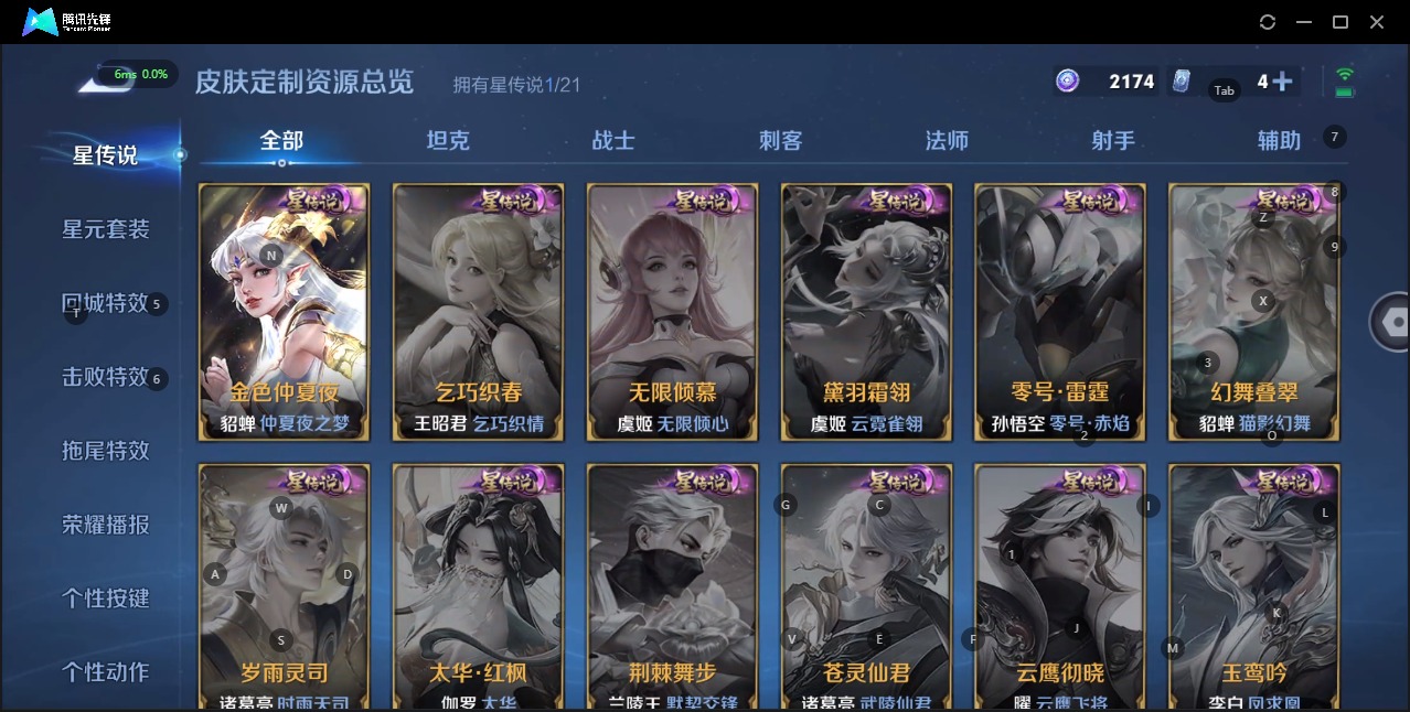 - [12075330]V6 4典藏 19传说 101英雄 119皮肤 可修改实名 优质装备:天鹅之梦(小乔典藏),星空梦想(太空人),鸣剑·曳影,全息碎影(猴子典藏),黄金射手座,云鹰飞将(小将军),绛天战甲(鸡嘴战神),久胜战神,炽阳神光,一念神魔,云霓雀翎,末日机甲-孙尚香(绿蚂蚱),地狱火,仲夏夜之梦(大飞蛾),音你心动-小乔,飞鸢探春,音你心动-周瑜,乞巧织情,时之恋人-刘备(电焊工),游龙清影(小青龙),淬星耀世,超时空战士-狄仁杰,霜月吟 限定皮:白鹤梁神女,天狼溯光者,李小龙,逐梦之影,乒乒小将 史诗皮:龙之律动,百相守梦-黄忠,遇见神鹿,电玩小子(小书包),黄金分割率,特工魅影,冰冠公主,猫狗日记-孙策,节奏热浪,修罗,女仆咖啡,天才门将,心灵骇客,功夫厨神,暗隐猎兽者,幽灵船长,舞动绿茵,地狱岩魂,纤云弄巧,缤纷独角兽,乘风破浪,逐浪之夏,鹰眼统帅,未来纪元-赵云
