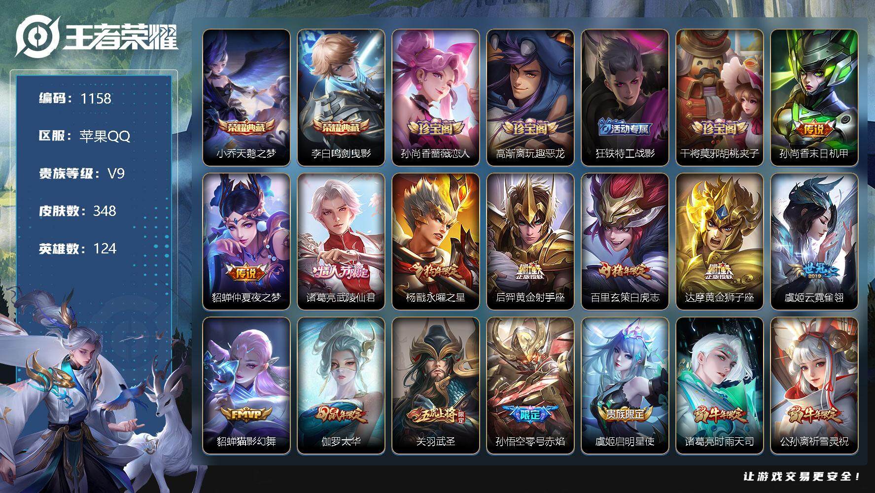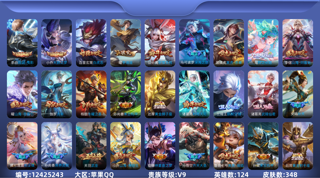 [12425243]【商品标题】:苹果Q-V9-永恒钻石V段位-124英雄-348皮肤-2典藏-0珍品无双-0无双-0珍品传说-34传说-115史诗