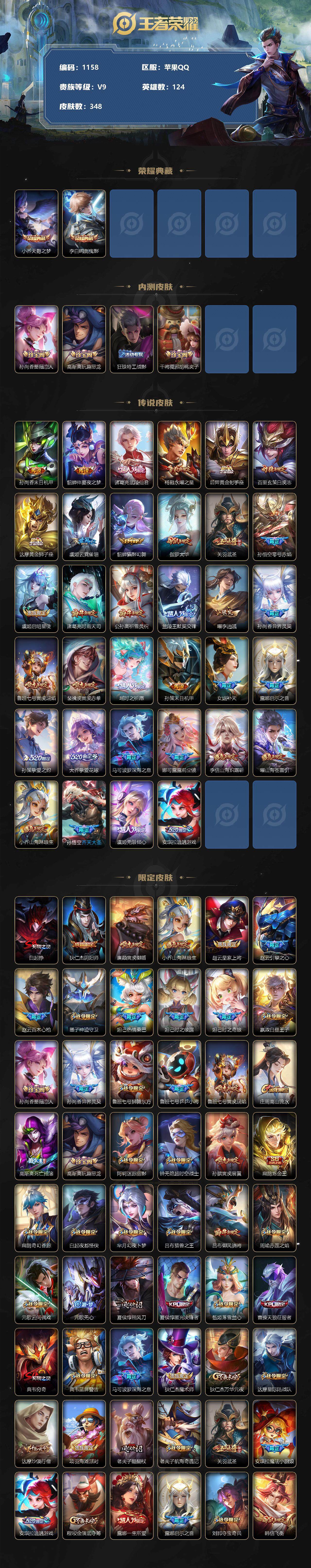 [12425243]【商品标题】:苹果Q-V9-永恒钻石V段位-124英雄-348皮肤-2典藏-0珍品无双-0无双-0珍品传说-34传说-115史诗 【荣耀典藏】:小乔天鹅之梦,李白鸣剑曳影 【内测皮肤】:孙尚香蔷薇恋人,高渐离玩趣恶龙,狂铁特工战影,干将莫邪胡桃夹子 【传说皮肤】:孙尚香末日机甲,貂蝉仲夏夜之梦,诸葛亮武陵仙君,杨戬永曜之星,后羿黄金射手座,百里玄策白虎志,达摩黄金狮子座,虞姬云霓雀翎,貂蝉猫影幻舞,伽罗太华,关羽武圣,孙悟空零号赤焰,虞姬启明星使,诸葛亮时雨天司,公孙离祈雪灵祝,兰陵王默契交锋,曜李逍遥 ,孙尚香异界灵契,鲁班七号寅虎瑞焰,裴擒虎寅虎赤拳,瑶时之祈愿,孙策末日机甲,女娲补天,露娜启示之音,孙策挚爱之约,大乔挚爱花嫁,马可波罗深海之息,娜可露露前尘镜,李信山海炽霜斩,曜山海苍雷引,小乔山海琳琅生,孙悟空齐天大圣,虞姬无限倾心,安琪拉追逃游戏 【限定皮肤】:白起狰,狄仁杰阴阳师,廉颇寅虎御盾,小乔山海琳琅生,赵云皇家上将,赵云引擎之心,赵云百木心枪,墨子神迹守卫,妲己热情桑巴,妲己时之彼端,妲己时之奇旅,嬴政白昼王子,孙尚香蔷薇恋人,孙尚香异界灵契,鲁班七号狮舞东方,鲁班七号乒乒小将,鲁班七号寅虎瑞焰,庄周高山流水,高渐离死亡摇滚,高渐离玩趣恶龙,阿轲迷踪丽影,钟无艳超时空战士,孙膑寅虎展翼,扁鹊炼金王,扁鹊奇幻香踪,白起夜都怪侠,芈月幻夜卜梦,吕布猎兽之王,吕布御风骁将,周瑜赤莲之焰,元歌云间偶戏,元歌无心,夏侯惇朔风刀,夏侯惇匿光决锋者,甄姬落雪兰心,曹操天狼征服者,典韦穷奇,典韦蓝屏警告,马可波罗深海之息,狄仁杰魔术师,狄仁杰万华元夜,达摩星际陆战队,达摩沙漠行僧,项羽海滩派对,老夫子醍醐杖,老夫子航海奇遇记,关羽武圣,安琪拉魔法小厨娘,安琪拉追逃游戏,程咬金演武夺筹,露娜一生所爱,露娜启示之音,刘邦夺宝奇兵,韩信飞衡,韩信傲雪梅枪,王昭君午后时光,兰陵王默契交锋,兰陵王驯魔猎人,兰陵王金庭之子,花木兰青春决赛季,花木兰瑞麟志,花木兰默契交锋,娜可露露前尘镜,亚瑟潮玩骑士王,孙悟空美猴王,孙悟空至尊宝,孙悟空大圣娶亲,孙悟空零号赤焰,孙悟空孙行者,孙悟空齐天大圣,牛魔御旌,后羿如梦令,后羿圣弓游侠,李元芳银河之约,李元芳云中旅人,虞姬霸王别姬,虞姬启明星使,虞姬无限倾心,钟馗神迹守卫,钟馗驱傩正仪,杨玉环遇见飞天,杨戬永曜之星,杨戬潮玩骑兵,女娲