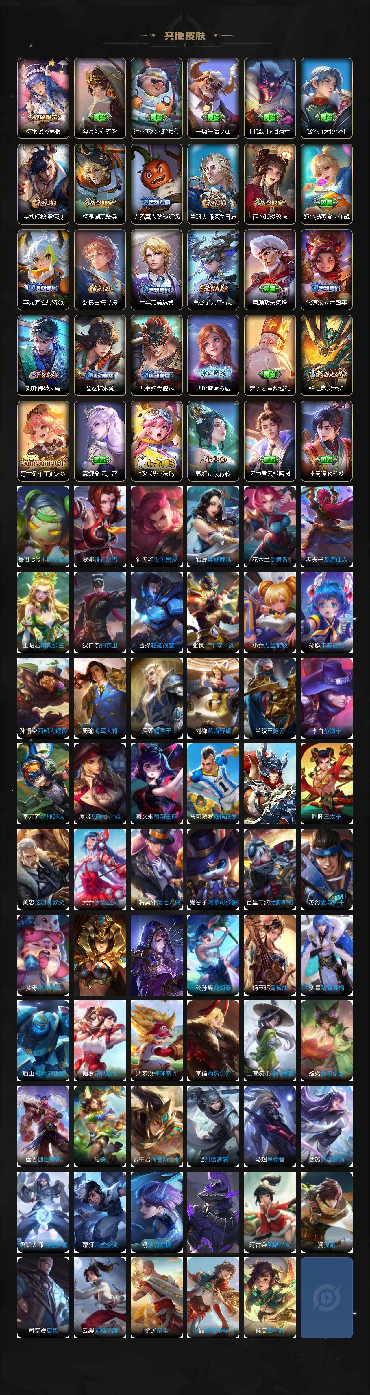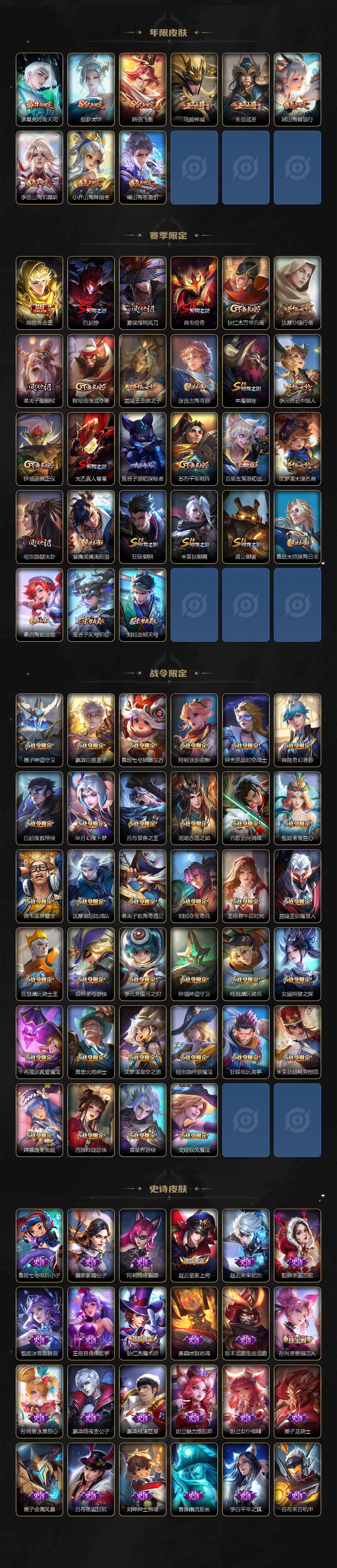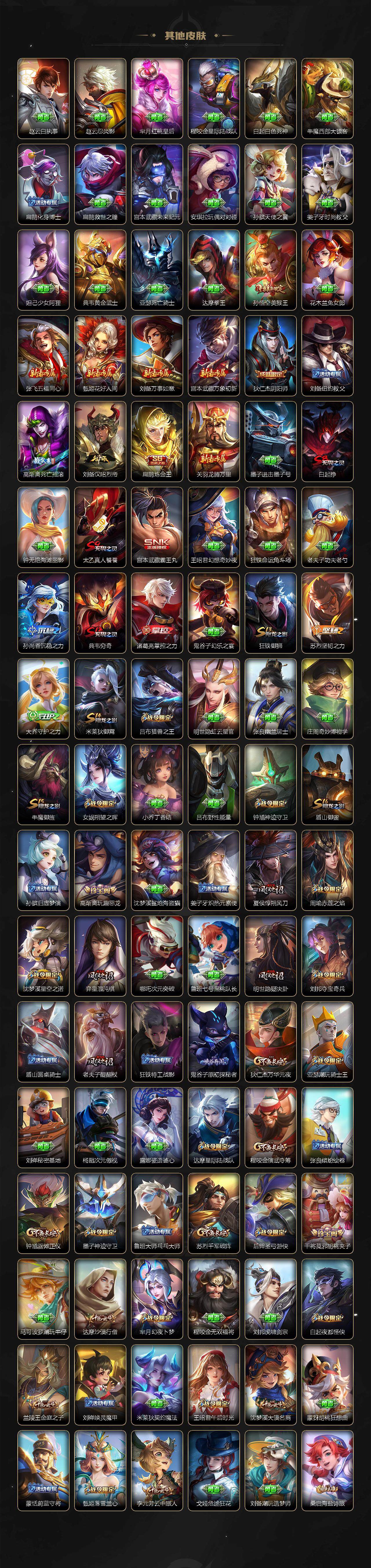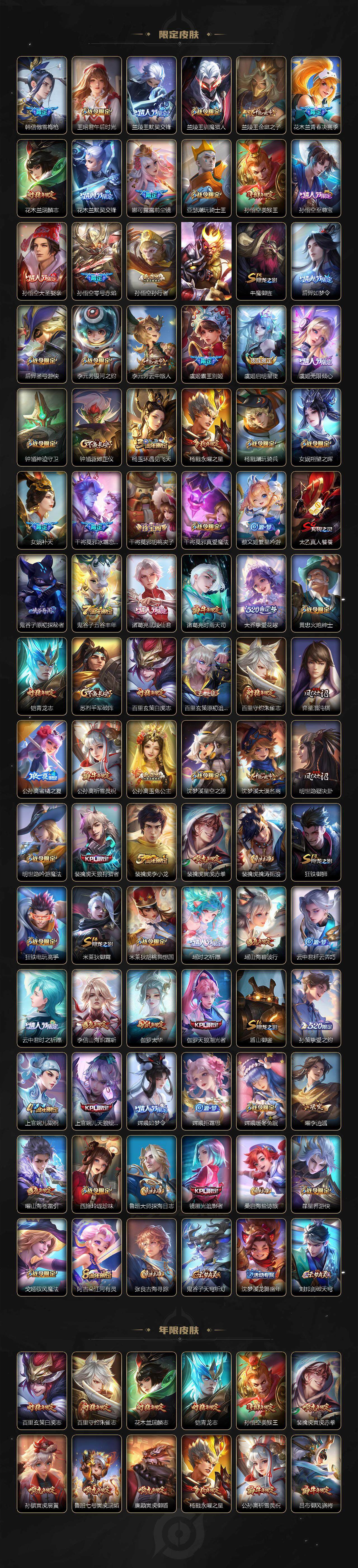 【限定皮肤】:白起狰,狄仁杰阴阳师,廉颇寅虎御盾,小乔山海琳琅生,赵云皇家上将,赵云引擎之心,赵云百木心枪,墨子神迹守卫,妲己热情桑巴,妲己时之彼端,妲己时之奇旅,嬴政白昼王子,孙尚香蔷薇恋人,孙尚香异界灵契,鲁班七号狮舞东方,鲁班七号乒乒小将,鲁班七号寅虎瑞焰,庄周高山流水,高渐离死亡摇滚,高渐离玩趣恶龙,阿轲迷踪丽影,钟无艳超时空战士,孙膑寅虎展翼,扁鹊炼金王,扁鹊奇幻香踪,白起夜都怪侠,芈月幻夜卜梦,吕布猎兽之王,吕布御风骁将,周瑜赤莲之焰,元歌云间偶戏,元歌无心,夏侯惇朔风刀,夏侯惇匿光决锋者,甄姬落雪兰心,曹操天狼征服者,典韦穷奇,典韦蓝屏警告,马可波罗深海之息,狄仁杰魔术师,狄仁杰万华元夜,达摩星际陆战队,达摩沙漠行僧,项羽海滩派对,老夫子醍醐杖,老夫子航海奇遇记,关羽武圣,安琪拉魔法小厨娘,安琪拉追逃游戏,程咬金演武夺筹,露娜一生所爱,露娜启示之音,刘邦夺宝奇兵,韩信飞衡,韩信傲雪梅枪,王昭君午后时光,兰陵王默契交锋,兰陵王驯魔猎人,兰陵王金庭之子,花木兰青春决赛季,花木兰瑞麟志,花木兰默契交锋,娜可露露前尘镜,亚瑟潮玩骑士王,孙悟空美猴王,孙悟空至尊宝,孙悟空大圣娶亲,孙悟空零号赤焰,孙悟空孙行者,孙悟空齐天大圣,牛魔御旌,后羿如梦令,后羿圣弓游侠,李元芳银河之约,李元芳云中旅人,虞姬霸王别姬,虞姬启明星使,虞姬无限倾心,钟馗神迹守卫,钟馗驱傩正仪,杨玉环遇见飞天,杨戬永曜之星,杨戬潮玩骑兵,女娲
