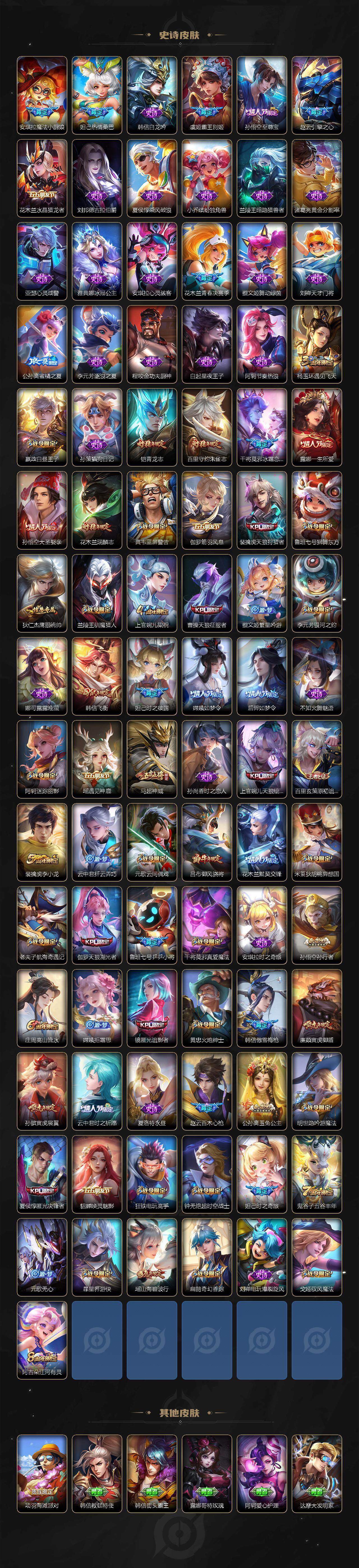 裴擒虎李小龙,上官婉儿梁祝,公孙离祈雪灵祝,吕布御风骁将,诸葛亮时雨天司,关羽武圣,马超神威,韩信飞衡,伽罗太华,曹操天狼征服者,裴擒虎天狼狩猎者,上官婉儿天狼绘梦者,伽罗天狼溯光者,铠青龙志,百里玄策白虎志,花木兰瑞麟志,百里守约朱雀志,虞姬霸王别姬,孙悟空大圣娶亲,露娜一生所爱,花木兰默契交锋,兰陵王默契交锋,后羿如梦令,嫦娥如梦令,孙悟空至尊宝,妲己热情桑巴,干将莫邪冰霜恋舞曲,花木兰青春决赛季,妲己时之彼端,公孙离蜜橘之夏,安琪拉魔法小厨娘,赵云引擎之心,孙悟空美猴王,鲁班七号乒乒小将,廉颇寅虎·御盾,孙尚香异界灵契,孙悟空孙行者,镜匿光追影者,韩信傲雪梅枪,鲁班七号寅虎·瑞焰,孙膑寅虎·展翼,裴擒虎寅虎·赤拳,云中君时之祈愿,瑶时之祈愿,女娲补天,赵云百木心枪,公孙离玉兔公主,露娜启示之音,夏侯惇匿光决锋者,马可波罗深海之息,娜可露露前尘镜,妲己时之奇旅,瑶山海·碧波行