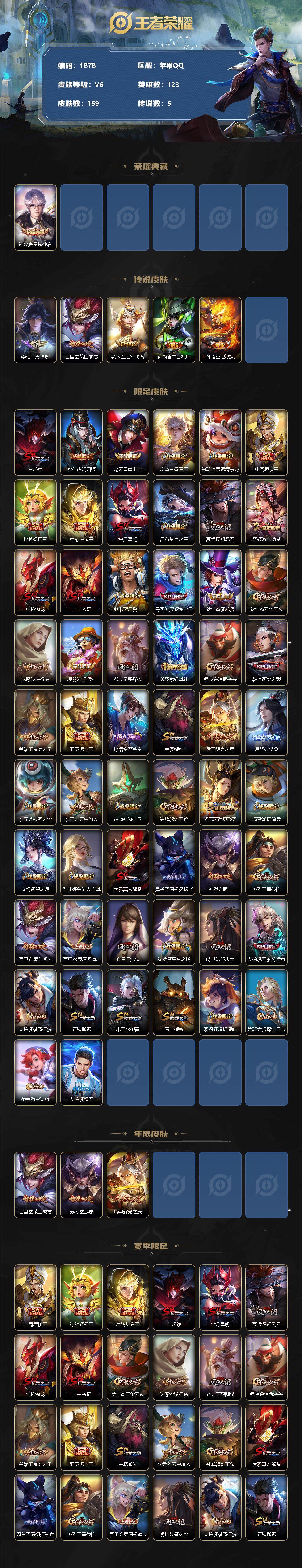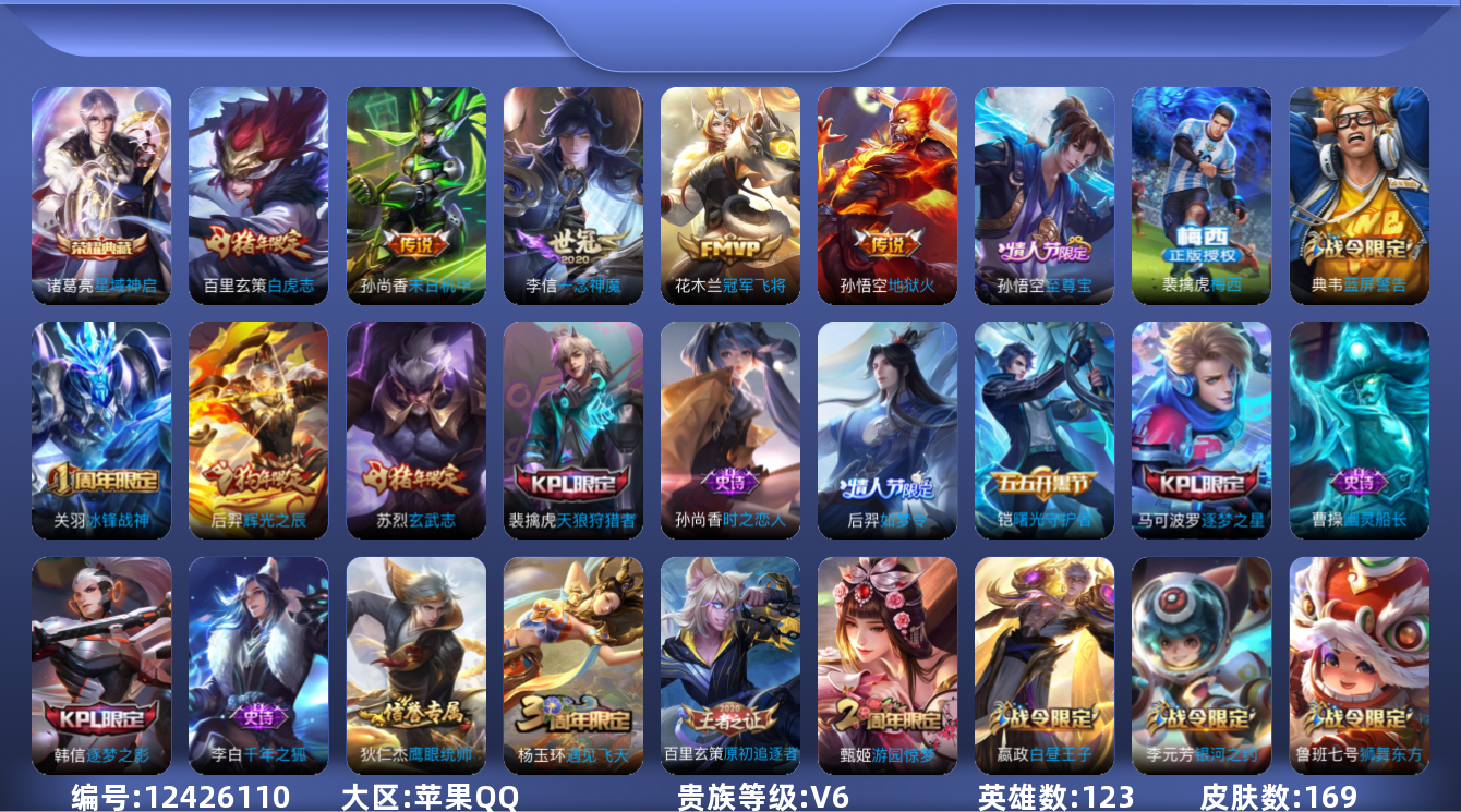 [12426110]【商品标题】:苹果Q-V6-至尊星耀I段位-123英雄-169皮肤-1典藏-0珍品无双-0无双-0珍品传说-5传说-35史诗