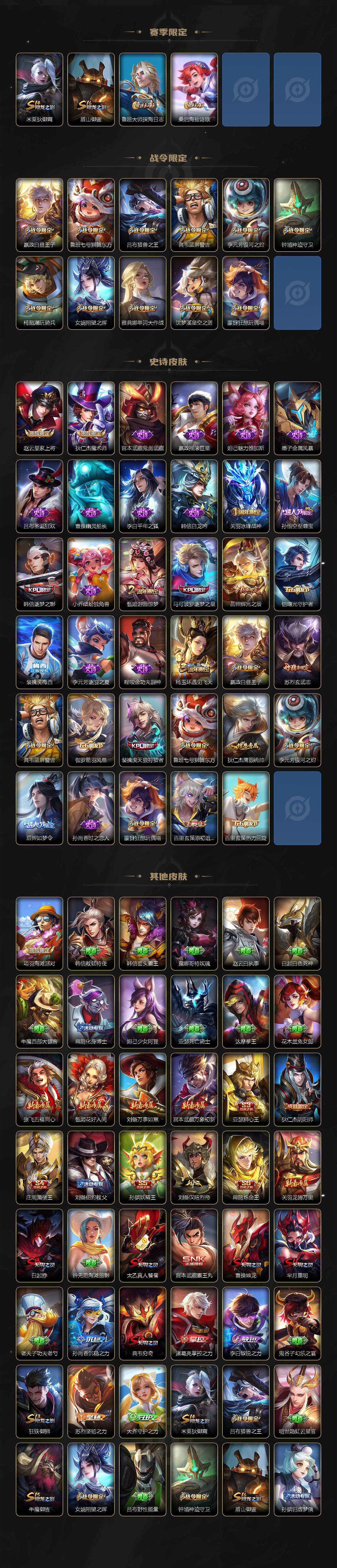 【限定皮肤】:白起狰,狄仁杰阴阳师,赵云皇家上将,嬴政白昼王子,鲁班七号狮舞东方,庄周蜃楼王,孙膑妖精王,扁鹊炼金王,芈月重明,吕布猎兽之王,夏侯惇朔风刀,甄姬游园惊梦,曹操烛龙,典韦穷奇,典韦蓝屏警告,马可波罗逐梦之星,狄仁杰魔术师,狄仁杰万华元夜,达摩沙漠行僧,项羽海滩派对,老夫子醍醐杖,关羽冰锋战神,程咬金演武夺筹,韩信逐梦之影,兰陵王金庭之子,亚瑟狮心王,孙悟空至尊宝,牛魔御旌,后羿辉光之辰,后羿如梦令,李元芳银河之约,李元芳云中旅人,钟馗神迹守卫,钟馗驱傩正仪,杨玉环遇见飞天,杨戬潮玩骑兵,女娲朔望之晖,雅典娜单词大作战,太乙真人饕餮,鬼谷子原初探秘者,苏烈玄武志,苏烈千军破阵,百里玄策白虎志,百里玄策原初追逐者,弈星混沌棋,沈梦溪星空之诺,明世隐疑决卦,裴擒虎天狼狩猎者,裴擒虎擒涛扼浪,狂铁御狮,米莱狄御霄,盾山御銮,蒙犽狂想玩偶喵,鲁班大师探海日志,桑启海盐诗旅,裴擒虎梅西