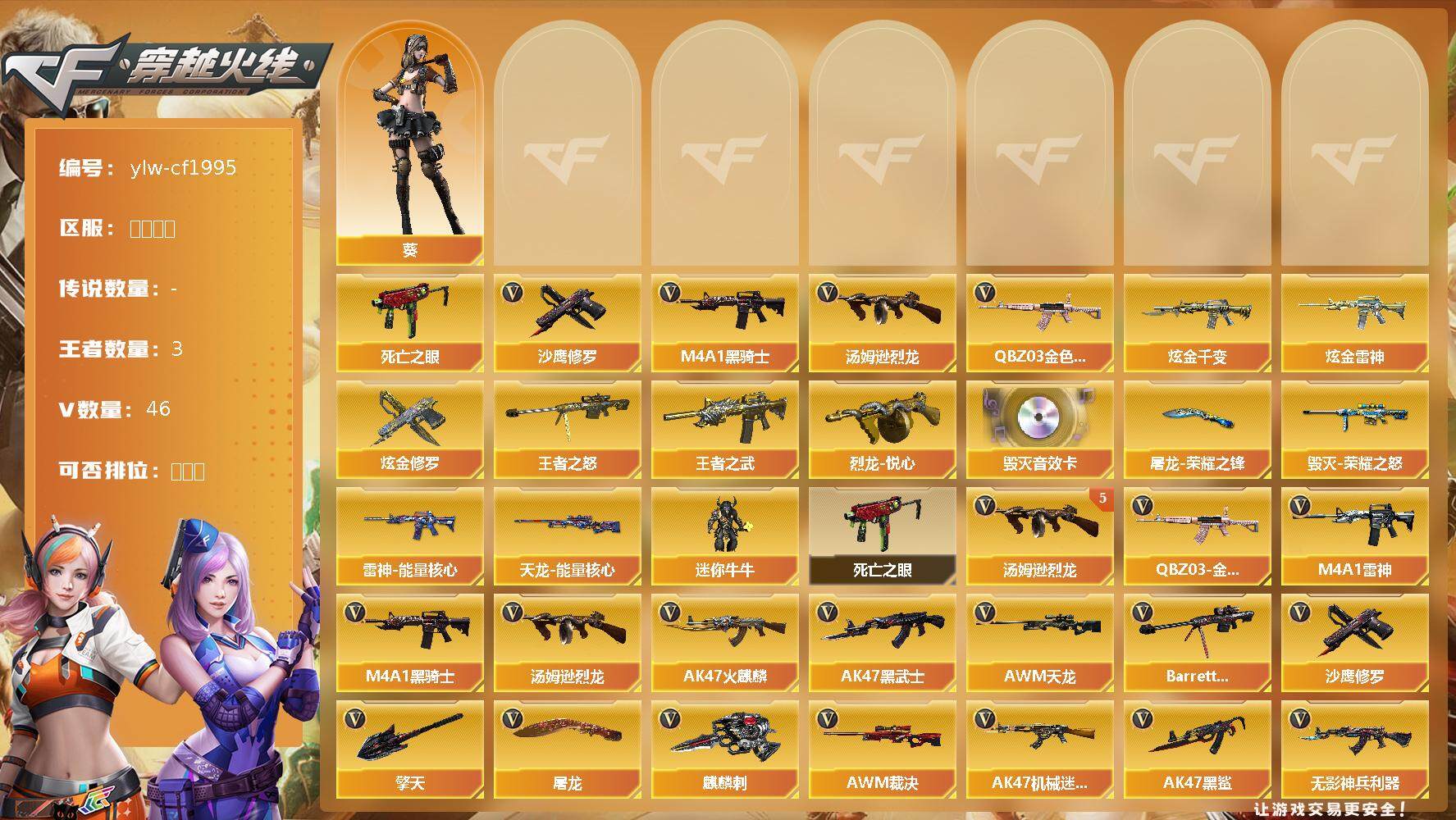[12427327]【商品标题】:四川二区-46V-3王者-4炫金 【热门武器】:QBZ03-金色蔷薇*2,死亡之眼*7,M4A1-黑骑士,汤姆逊-烈龙*5,沙鹰-修罗*5 【王者炫金武器】:炫金千变,炫金雷神*2,炫金修罗,烈龙-悦心,王者之武,王者之怒 【音效卡】:Barrett-毁灭音效卡 【稀有皮肤】:雷神-能量核心,毁灭-荣耀之怒,天龙-能量核心,M200-庆典-CFS 2021*2,屠龙-荣耀之锋 【角色】:葵 【人偶武器】:迷你牛牛 【暴走生化】:死亡之眼*7 【英雄级武器】:QBZ03-金色蔷薇*2,无影-神兵利器,M4A1-雷神*4,M4A1-黑骑士,汤姆逊-烈龙*5,AK47-火麒麟,AK47-黑武士,AWM-天龙,Barrett-毁灭*3,AWM-裁决,AK47-机械迷城,AK47-黑鲨,AK-47-猩红传说,沙鹰-修罗*5,麒麟刺*4,擎天,屠龙*7 【特殊枪械】:,1黑骑士,5烈龙,