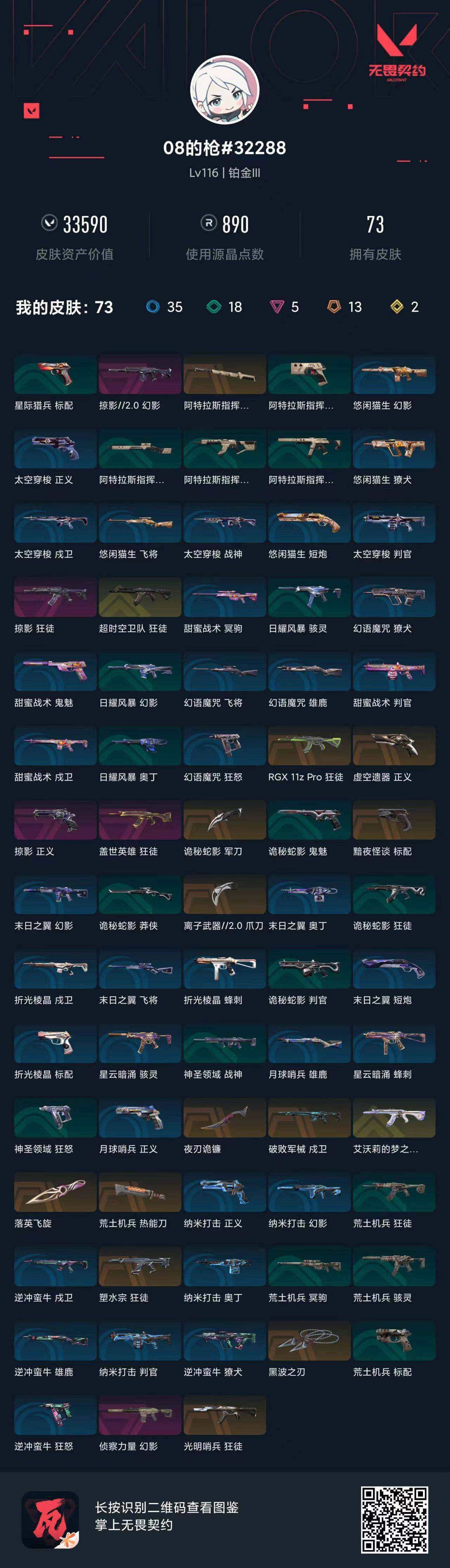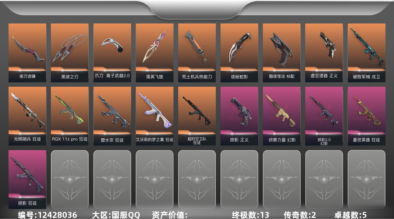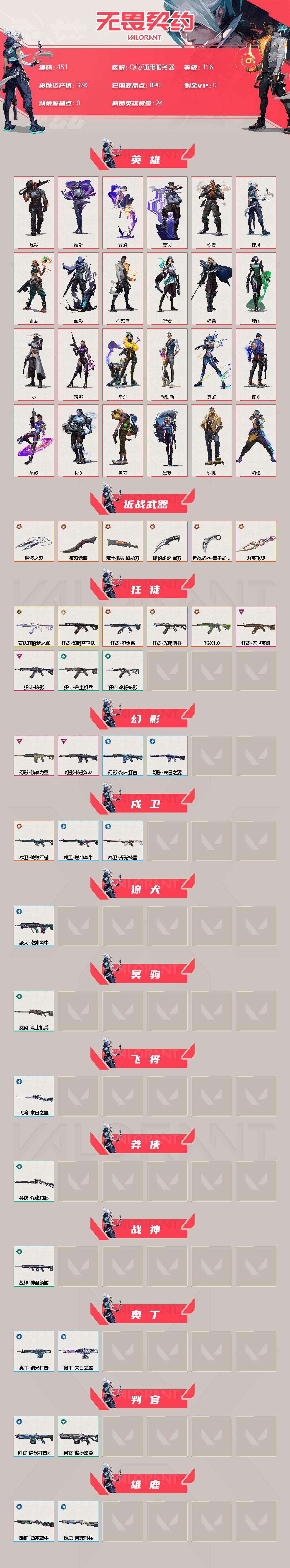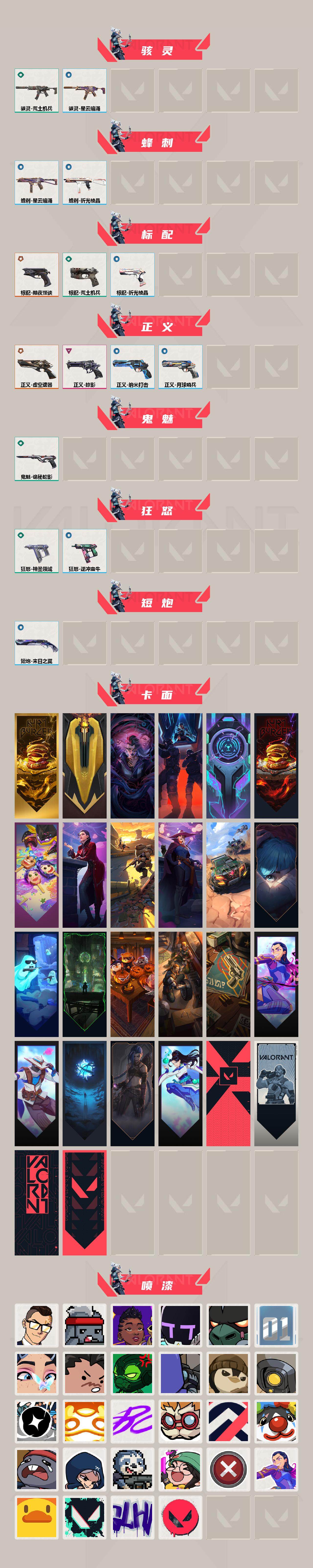 [12428036]【英雄】:幻棱,炼狱,维斯,暮蝶,钛狐,壹决,铁臂,捷风,雷兹,幽影,不死鸟,贤者,猎枭,蝰蛇,零,芮娜,奇乐,尚勃勒,霓虹,夜露,星礈,K/O,盖可,黑梦 【近战 武器】:近战武器-黑波之刃,近战武器-落英飞旋,近战武器-离子武器//2.0 爪刀,近战武器-荒土机兵 热能刀,近战武器-夜刃诡镰,近战武器-诡秘蛇影 军刀 【狂徒】:狂徒-艾沃莉的梦之翼,狂徒-超时空卫队,狂徒-光明哨兵,狂徒-塑水宗,狂徒-RGX 11z Pro,狂徒-掠影,狂徒-盖世英雄,狂徒-荒土机兵,狂徒-诡秘蛇影 【幻影】:幻影-侦察力量,幻影-掠影//2.0,幻影-纳米打击,幻影-末日之翼 【戍卫】:戍卫-破败军械,戍卫-逆冲蛮牛,戍卫-折光棱晶 【獠犬】:獠犬-逆冲蛮牛 【冥驹】:冥驹-荒土机兵 【飞将】:飞将-末日之翼 【莽侠】:莽侠-诡秘蛇影 【战神】:战神-神圣领域 【奥丁】:奥丁-纳米打击,奥丁-末日之翼 【判官】:判官-诡秘蛇影,判官-纳米打击x 【雄鹿】:雄鹿-逆冲蛮牛,雄鹿-月球哨兵 【骇灵】:骇灵-荒土机兵,骇灵-星云暗涌 【蜂刺】:蜂刺-星云暗涌,蜂刺-折光棱晶 【标配】:标配-黯夜怪谈,标配-荒土机兵,标配-折光棱晶 【正义】:正义-虚空遗器,正义-掠影,正义-纳米打击,正义-月球哨兵 【鬼魅】:鬼魅-诡秘蛇影 【狂怒】:狂怒-神圣领域,狂怒-逆冲蛮牛 【短炮】:短炮-末日之翼 【卡面】:终章:激斗汉堡 卡面,进入射程 卡面,分崩离析 卡面,纳米打击 卡面,抑制技术 卡面,激斗汉堡 卡面,瓦娃脸雪糕 P2 卡面,从黄昏到黎明 卡面,荒土机兵 卡面,银弹猎手 卡面,逆冲蛮牛 卡面,《双城之战》拥抱 卡面,精灵大战 卡面,欢迎来到底城 卡面,南瓜盛典 卡面,修车达人 卡面,正义的化身 卡面,无畏契约GO!第一卷:芮娜 卡面,无畏契约GO!第一卷:零 卡面,无垠星环 卡面,《双城之战》金克丝 卡面,无畏契约GO!第一卷:贤者 卡面,代号红色 卡面,新兵报到 卡面,V契约 卡面,无畏契约 卡面 【喷漆】:小小心意 喷漆,战“素”兔 喷漆,宇宙的指引 喷漆,请求重启 喷漆,逆冲蛮牛 喷漆,纳米打击 喷漆,鼻尖上的蝴蝶 喷漆,简笔画黯兽 喷漆,独守蝰腹 喷漆,他们将落荒而逃 喷漆,通缉:战术企鹅 喷漆,荒土机兵 喷漆,别挡我吃球! 喷漆,嗨宝南瓜灯 喷漆,嘭! 喷漆,都算到了