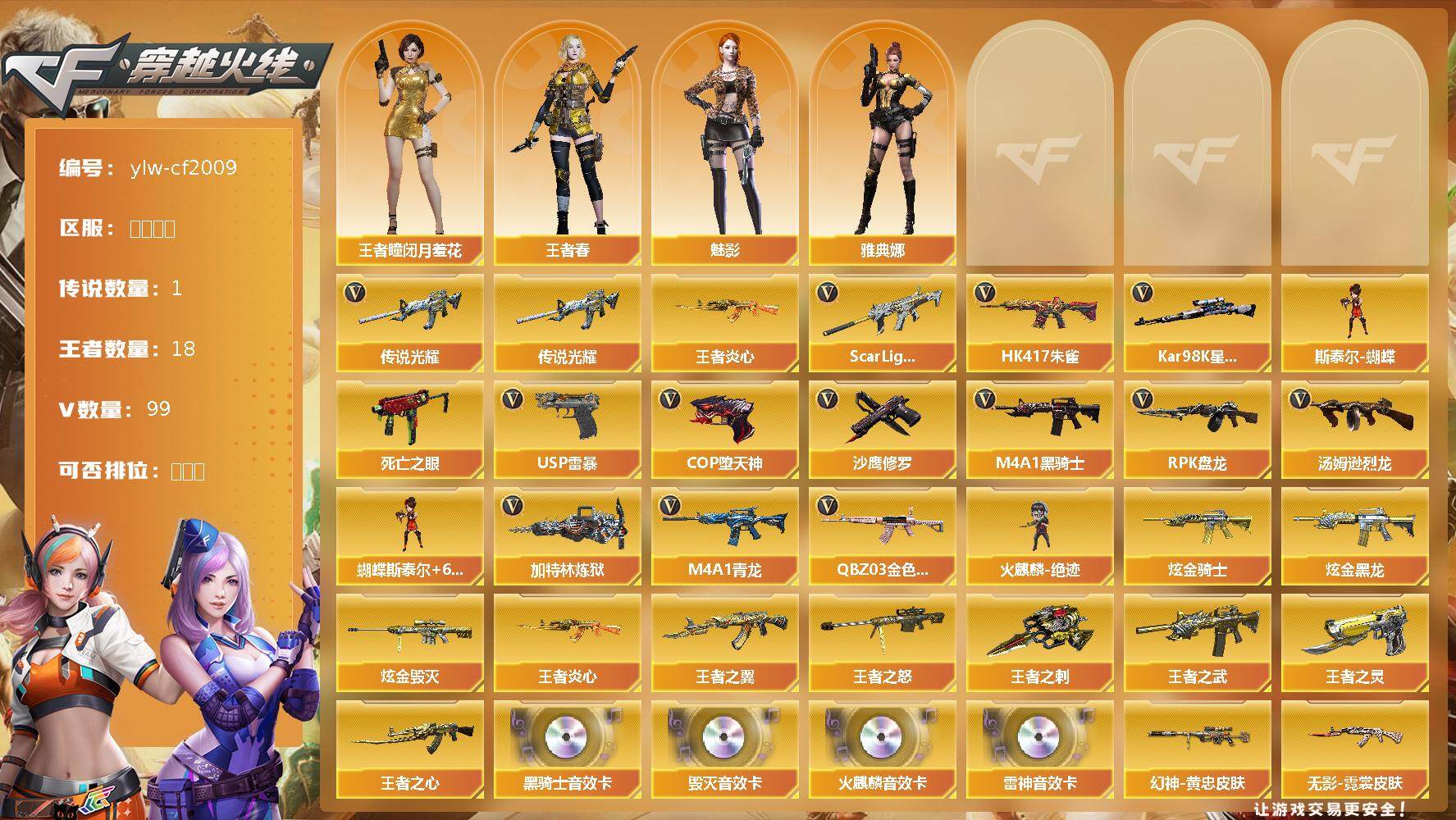 - [11601651]2传说角色 1炫金武器 50V武器 可二次 可修改实名 优质装备:M200-幻神,M200-竞技荣光,QBZ03-金色蔷薇,AK47-火麒麟,AK47-黑武士,M4A1-雷神,M4A1-黑骑士,M4A1-黑龙,M4A1-武圣,Barrett-毁灭,AN94-超新星,沙鹰-修罗,沙鹰-天神,屠龙,柯尔特-竞技荣光,破空枪刃-夜魔,AK47-黑武士-锦绣游龙,Glock18-武圣,无影-神兵利器 排位资格:有 王者武器:王者蔷薇-觉醒版,王者之翼-觉醒版 炫金武器:炫金火麒麟 热门武器:Knife-冠军之刃
