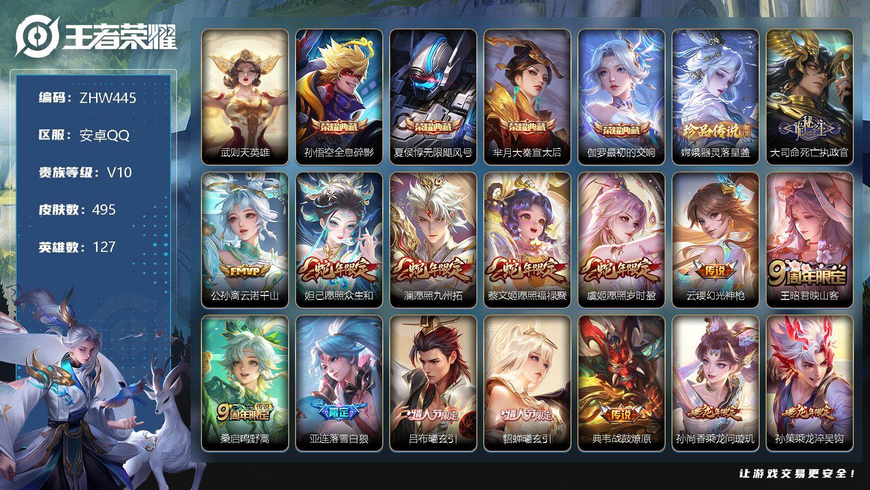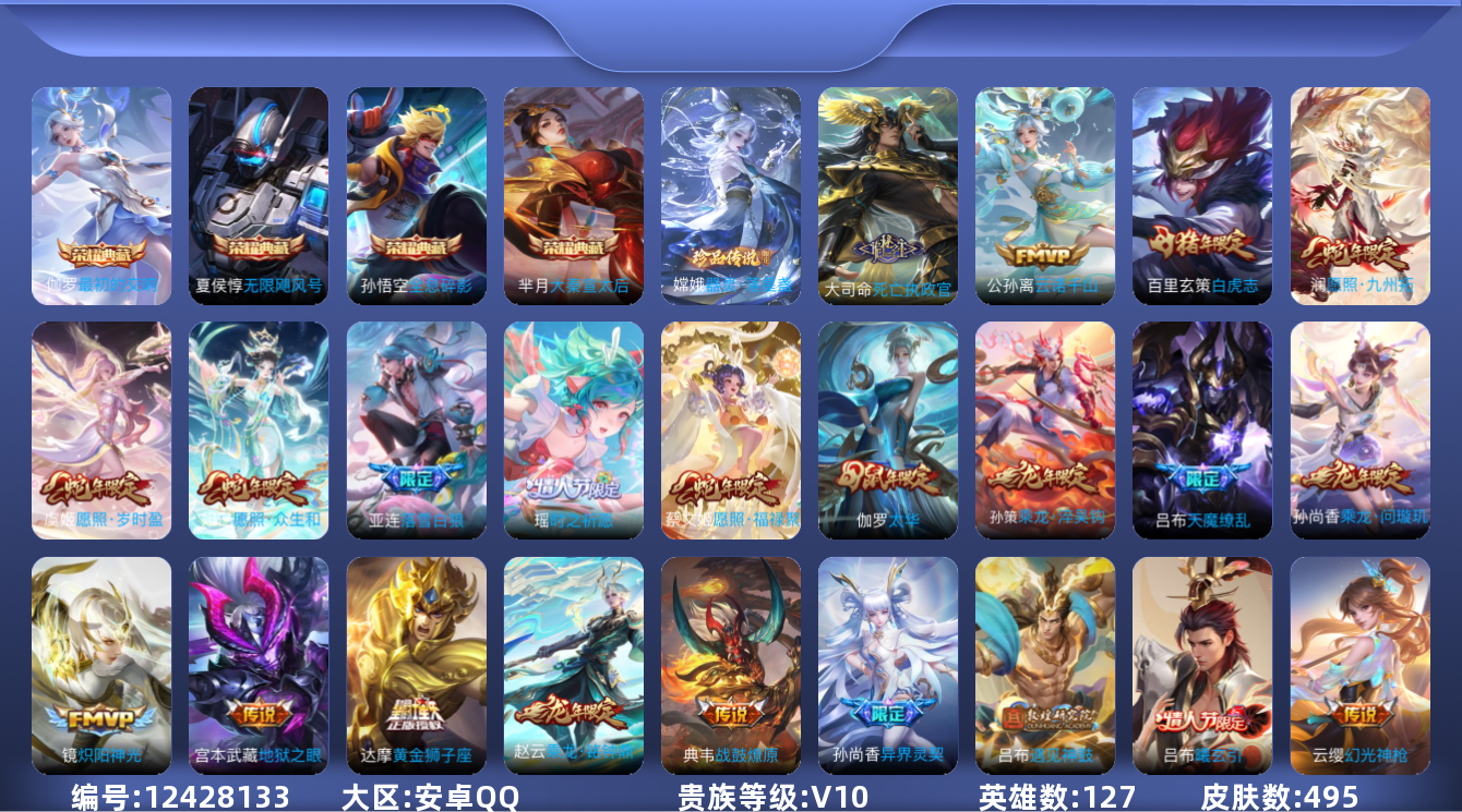 [12428133]【特价急出/详情看图】:安卓Q-V10-永恒钻石I段位-127英雄-495皮肤-4典藏-1珍品传说-45传说-158史诗