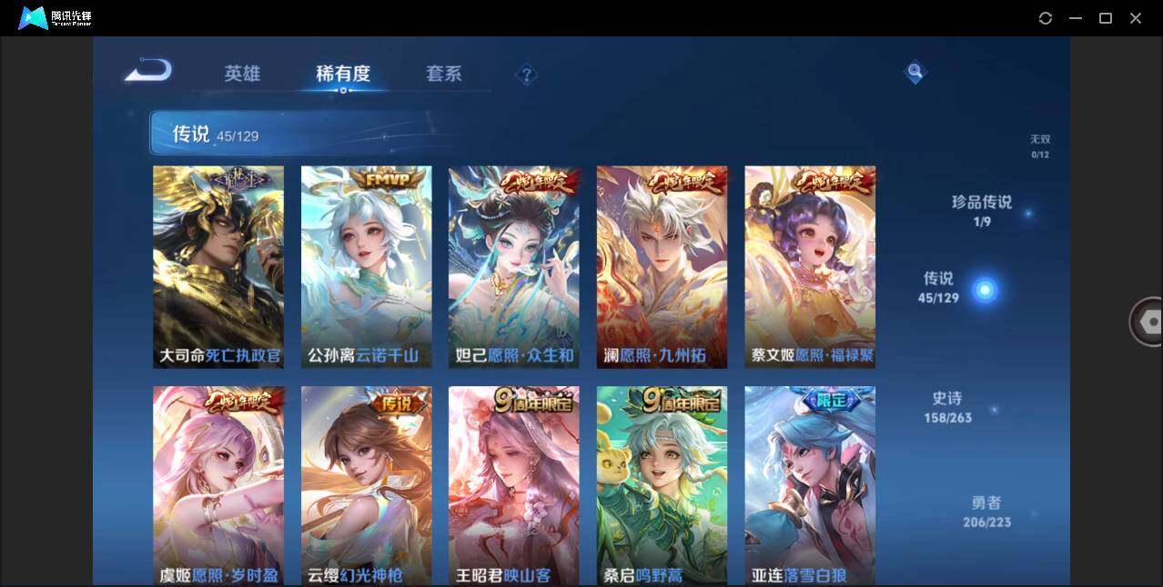 【传说皮肤】:大司命死亡执政官,公孙离云诺千山,妲己愿照众生和,澜愿照九州拓,蔡文姬愿照福禄聚,虞姬愿照岁时盈,云缨幻光神枪,王昭君映山客,桑启鸣野蒿,亚连落雪白狼,吕布曦玄引,貂蝉曦玄引,典韦战鼓燎原,孙尚香乘龙问璇玑,孙策乘龙淬吴钩,赵云乘龙铭钟鼎,艾琳觅芳踪,吕布遇见神鼓,宫本武藏惊梅引,东皇太一灼幽烈阳,公孙离记忆之芯,孙悟空齐天大圣,吕布怒海麟威,狄仁杰神器狴犴令,孙尚香音你闪耀,孙策末日机甲,瑶时之祈愿,孙尚香异界灵契,赵云淬星耀世,王昭君乞巧织情,小乔音你心动,镜炽阳神光,虞姬启明星使,伽罗太华,貂蝉猫影幻舞,虞姬云霓雀翎,达摩黄金狮子座,百里玄策白虎志,后羿黄金射手座,貂蝉仲夏夜之梦,宫本武藏地狱之眼,孙悟空地狱火,吕布天魔缭乱,武则天海洋之心,狄仁杰超时空战士