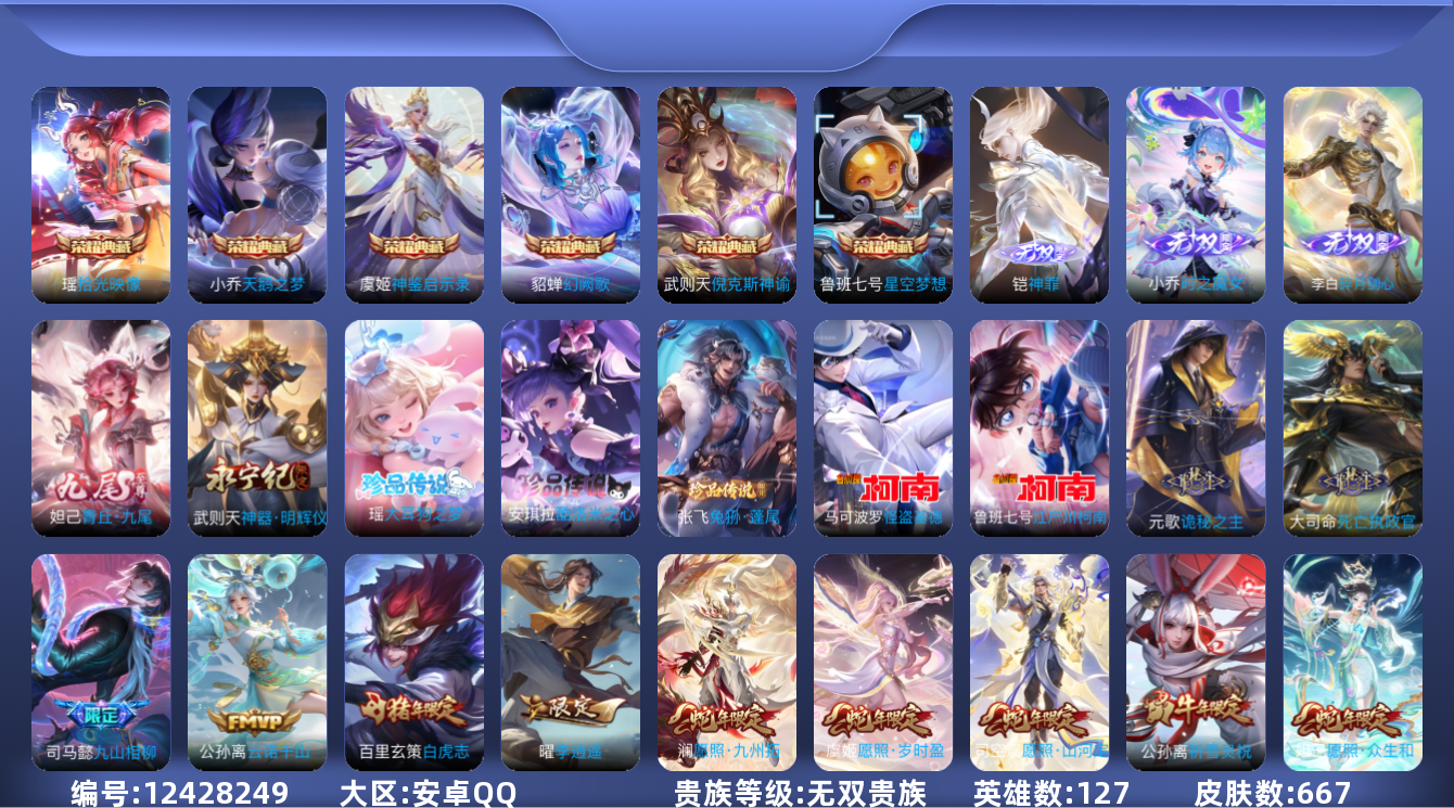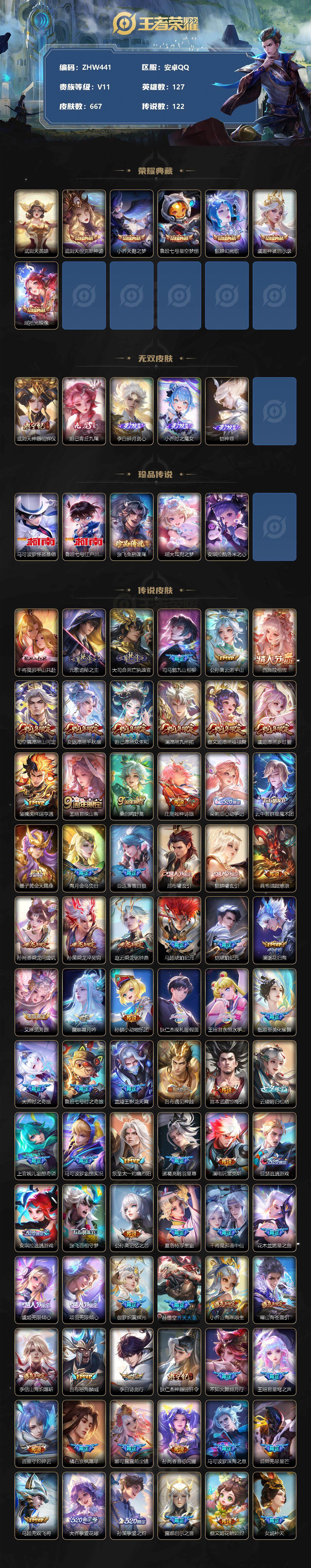 [12428249]【特价急出/详情看图】:安卓Q-V11-至尊星耀II段位-127英雄-667皮肤-6典藏-5无双-5珍品传说-122传说-240史诗