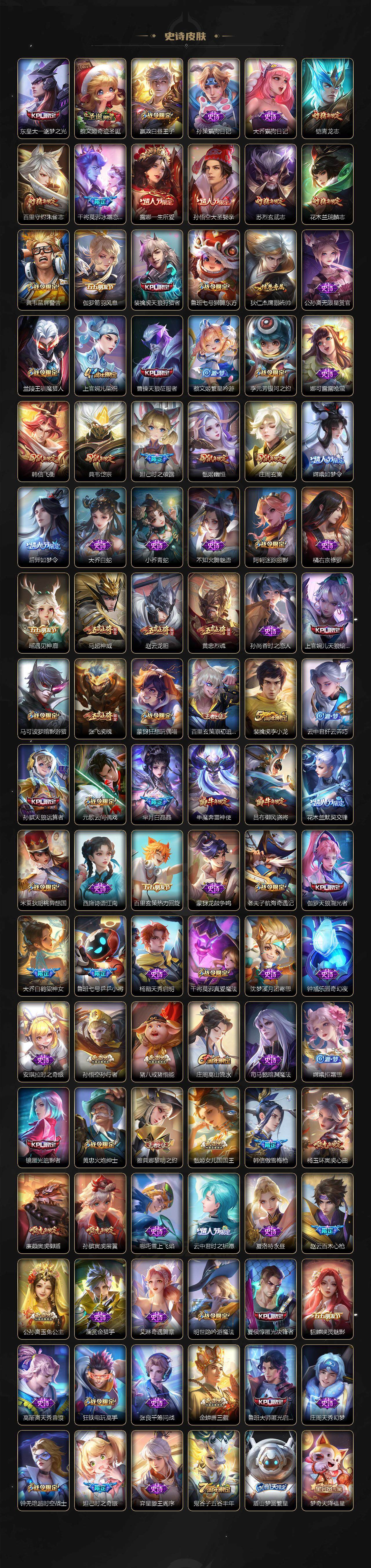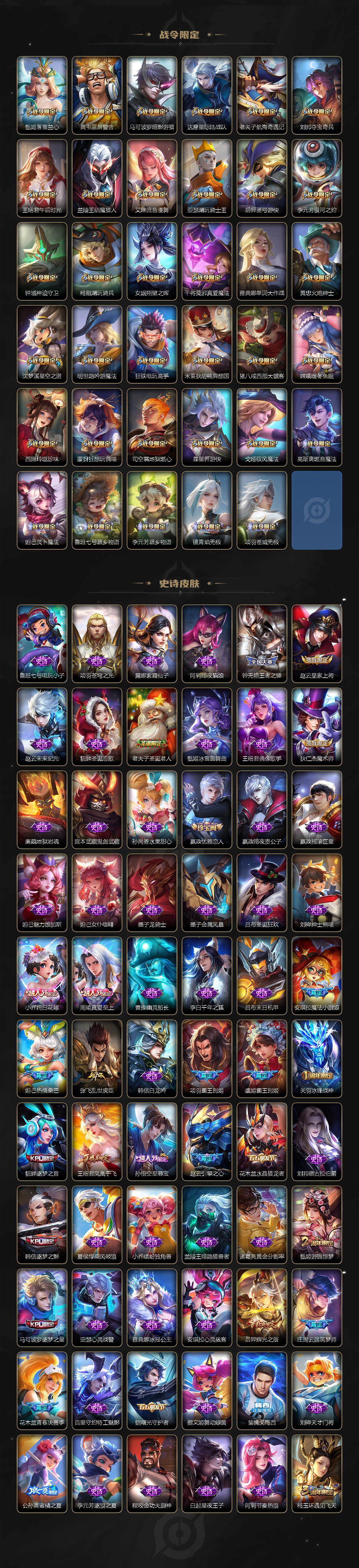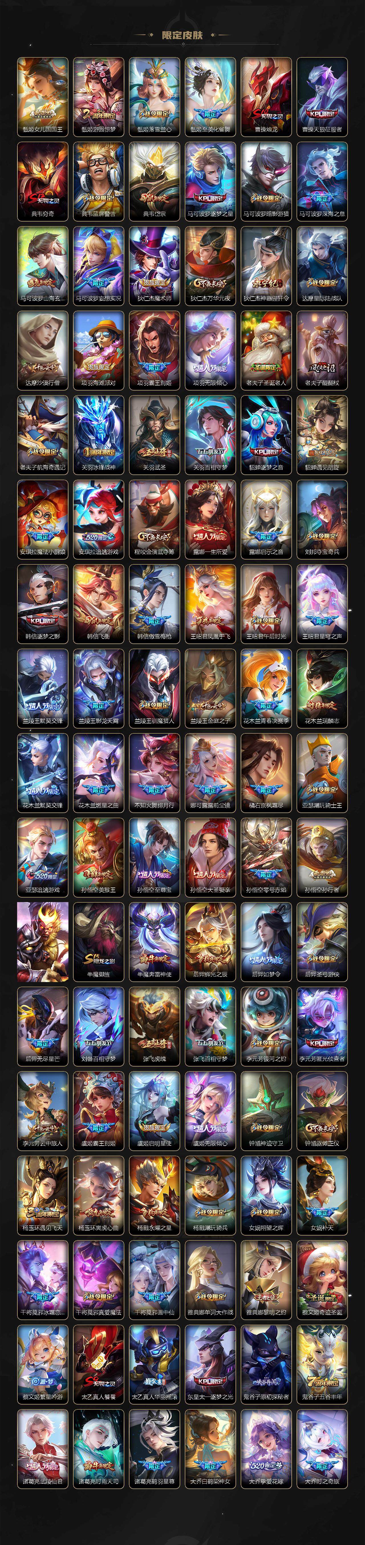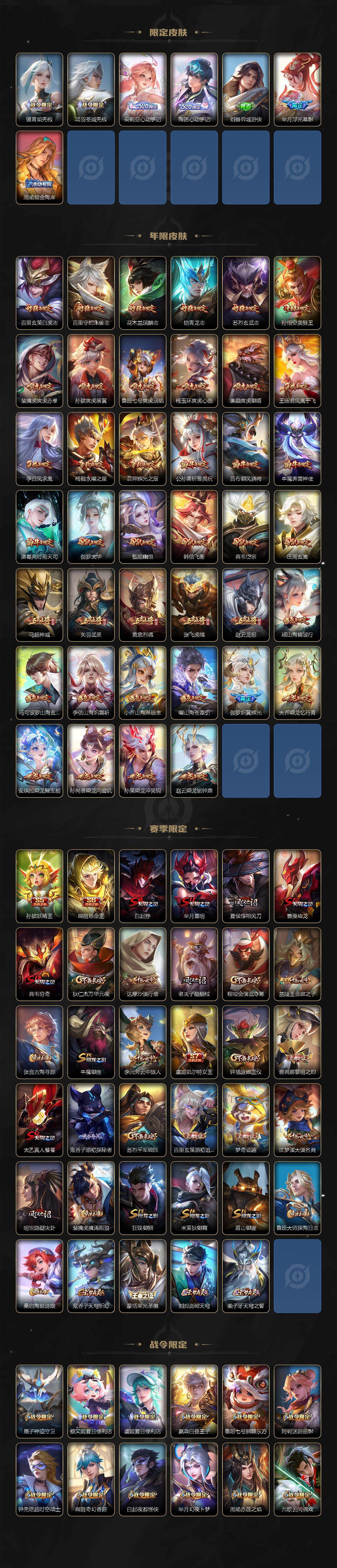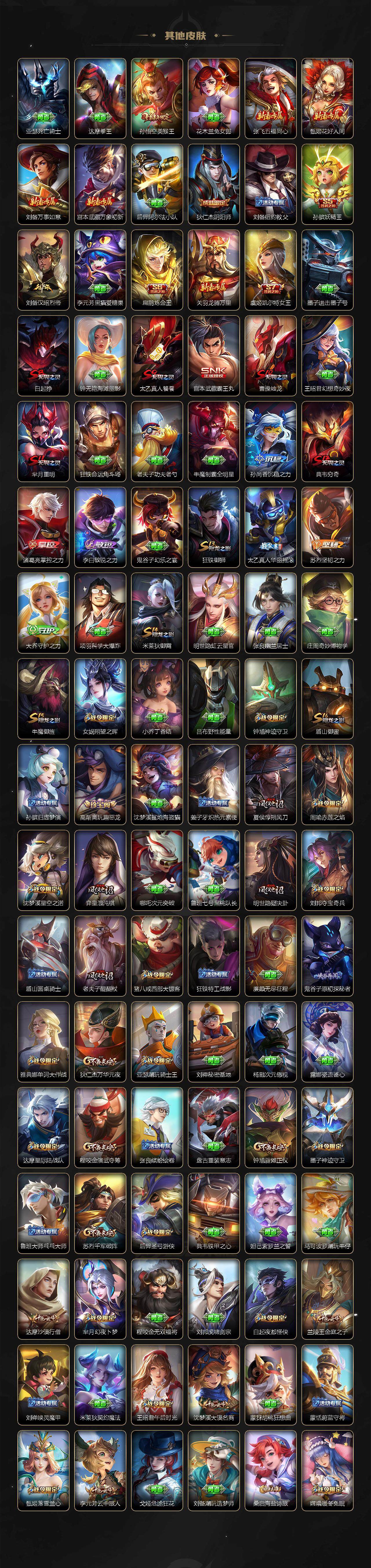关羽冰锋战神,裴擒虎李小龙,上官婉儿梁祝,牛魔奔雷神使,貂蝉逐梦之音,公孙离祈雪灵祝,吕布御风骁将,诸葛亮时雨天司,赵云龙胆,关羽武圣,黄忠烈魂,张飞虎魄,马超神威,后羿辉光之辰,庄周玄嵩,典韦岱宗,甄姬幽恒,韩信飞衡,伽罗太华,曹操天狼征服者,裴擒虎天狼狩猎者,孙膑天狼运算者,上官婉儿天狼绘梦者,伽罗天狼溯光者,马可波罗逐梦之星,韩信逐梦之影,东皇太一逐梦之光,铠青龙志,百里玄策白虎志,花木兰瑞麟志,苏烈玄武志,百里守约朱雀志,王昭君凤凰于飞,项羽霸王别姬,虞姬霸王别姬,小乔纯白花嫁,周瑜真爱至上,孙悟空大圣娶亲,露娜一生所爱,花木兰默契交锋,兰陵王默契交锋,后羿如梦令,嫦娥如梦令,孙悟空至尊宝,裴擒虎梅西,雅典娜神奇女侠,妲己热情桑巴,干将莫邪冰霜恋舞曲,花木兰青春决赛季,蔡文姬奇迹圣诞,妲己时之彼端,公孙离蜜橘之夏,芈月白晶晶,安琪拉魔法小厨娘,赵云引擎之心,孙悟空美猴王,庄周云端筑梦师,鲁班七号乒乒小将,大乔白鹤梁神女,猪八戒猪悟能,廉颇寅虎·御盾,孙尚香异界灵契,老夫子圣诞老人,孙悟空孙行者,甄姬女儿国国王,镜匿光追影者,韩信傲雪梅枪,鲁班七号寅虎·瑞焰,孙膑寅虎·展翼,杨玉环寅虎·心曲,裴擒虎寅虎·赤拳,云中君时之祈愿,瑶时之祈愿,女娲补天,赵云百木心枪,公孙离玉兔公主,露娜启示之音,夏侯惇匿光决锋者,后羿无尽星芒,马可波罗深海之息,金蝉唐三藏,娜可露露前尘镜,橘右京枫霜尽,鲁班大师匿光启智者,妲己时之奇旅,王昭君星穹之声,不知火舞绯月行,上官婉儿神器·万象笔,盾山梦圆繁星,墨子降魔,李白诗剑行,马可波罗山海·玄木吟,盘古冰霜神祇,瑶山海·碧波行,兰陵王影龙天霄,西施至美·乘鲤谣,甄姬至美·化雀舞,桑启鸣野蒿,艾琳陌上桑,王昭君映山客,澜愿照·九州拓,蔡文姬愿照·福禄聚,虞姬愿照·岁时盈,司空震愿照·山河定,妲己愿照·众生和,女娲愿照·千秋盛