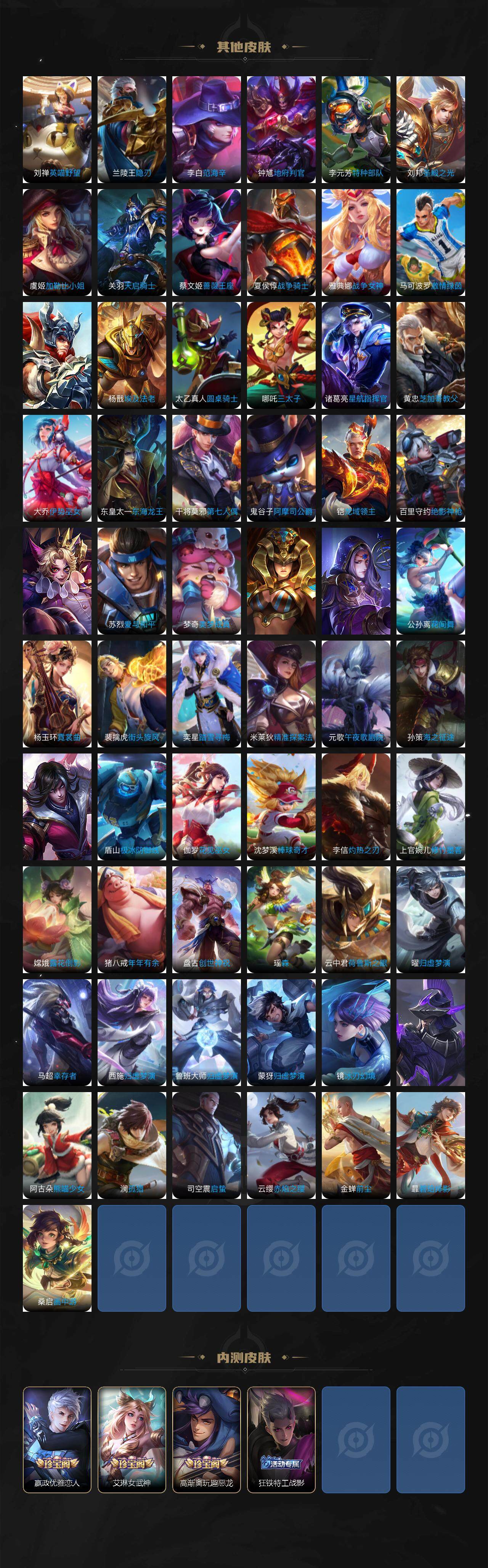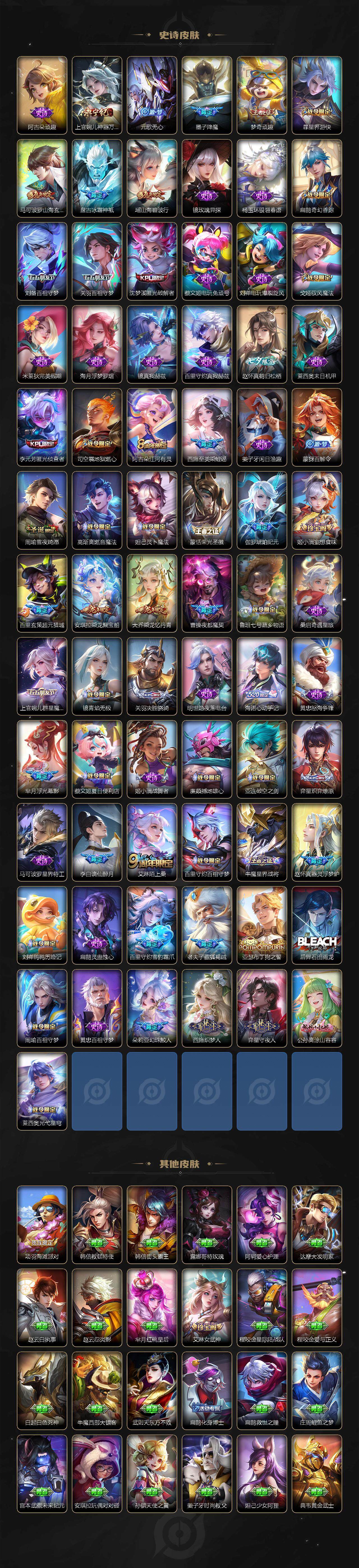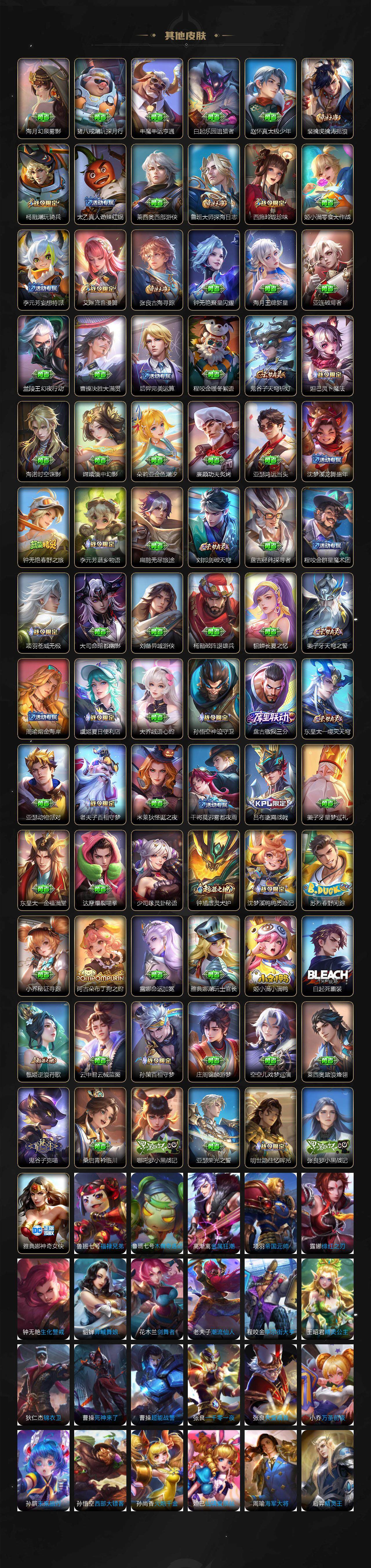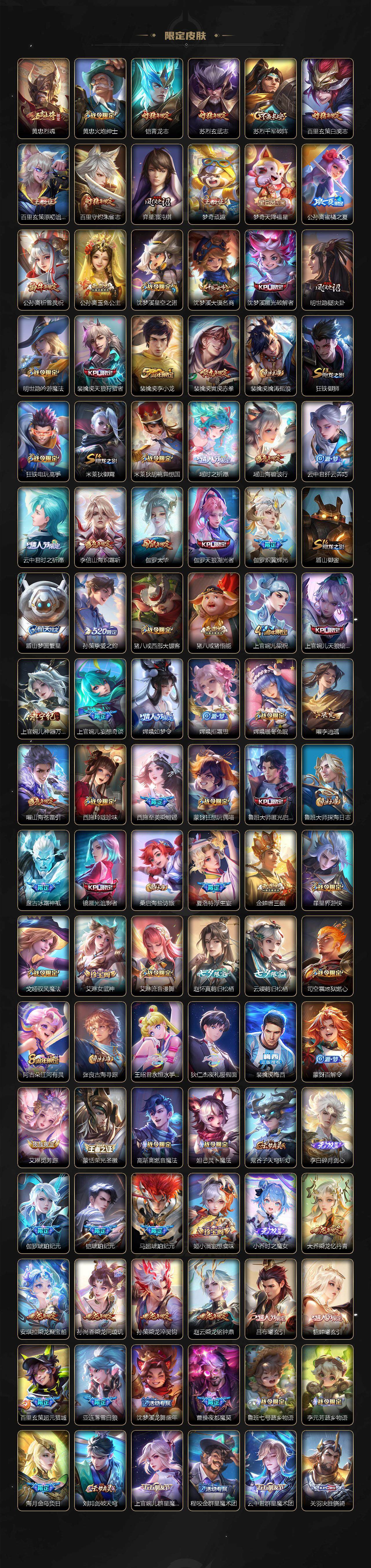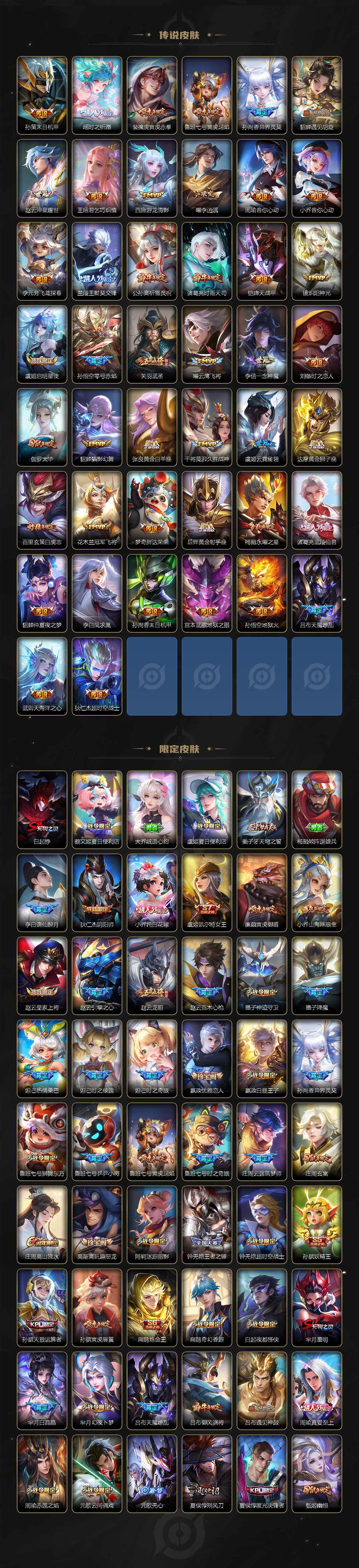 关羽冰锋战神,裴擒虎李小龙,上官婉儿梁祝,牛魔奔雷神使,貂蝉逐梦之音,公孙离祈雪灵祝,吕布御风骁将,诸葛亮时雨天司,赵云龙胆,关羽武圣,黄忠烈魂,张飞虎魄,马超神威,后羿辉光之辰,庄周玄嵩,典韦岱宗,甄姬幽恒,韩信飞衡,伽罗太华,曹操天狼征服者,裴擒虎天狼狩猎者,孙膑天狼运算者,上官婉儿天狼绘梦者,伽罗天狼溯光者,马可波罗逐梦之星,韩信逐梦之影,东皇太一逐梦之光,铠青龙志,百里玄策白虎志,花木兰瑞麟志,苏烈玄武志,百里守约朱雀志,王昭君凤凰于飞,项羽霸王别姬,虞姬霸王别姬,小乔纯白花嫁,周瑜真爱至上,孙悟空大圣娶亲,露娜一生所爱,花木兰默契交锋,兰陵王默契交锋,后羿如梦令,嫦娥如梦令,孙悟空至尊宝,裴擒虎梅西,雅典娜神奇女侠,妲己热情桑巴,干将莫邪冰霜恋舞曲,花木兰青春决赛季,蔡文姬奇迹圣诞,妲己时之彼端,公孙离蜜橘之夏,芈月白晶晶,安琪拉魔法小厨娘,赵云引擎之心,孙悟空美猴王,庄周云端筑梦师,鲁班七号乒乒小将,大乔白鹤梁神女,猪八戒猪悟能,廉颇寅虎·御盾,孙尚香异界灵契,老夫子圣诞老人,孙悟空孙行者,甄姬女儿国国王,镜匿光追影者,韩信傲雪梅枪,鲁班七号寅虎·瑞焰,孙膑寅虎·展翼,杨玉环寅虎·心曲,裴擒虎寅虎·赤拳,云中君时之祈愿,瑶时之祈愿,女娲补天,赵云百木心枪,公孙离玉兔公主,露娜启示之音,夏侯惇匿光决锋者,后羿无尽星芒,马可波罗深海之息,金蝉唐三藏,娜可露露前尘镜,橘右京枫霜尽,鲁班大师匿光启智者,妲己时之奇旅,王昭君星穹之声,不知火舞绯月行,上官婉儿神器·万象笔,盾山梦圆繁星,墨子降魔,李白诗剑行,马可波罗山海·玄木吟,盘古冰霜神祇,瑶山海·碧波行,兰陵王影龙天霄,西施至美·乘鲤谣,甄姬至美·化雀舞,桑启鸣野蒿,艾琳陌上桑,王昭君映山客,澜愿照·九州拓,蔡文姬愿照·福禄聚,虞姬愿照·岁时盈,司空震愿照·山河定,妲己愿照·众生和,女娲愿照·千秋盛