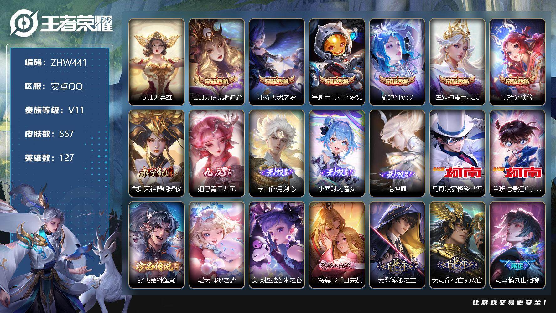 [12428249]【特价急出/详情看图】:安卓Q-V11-至尊星耀II段位-127英雄-667皮肤-6典藏-5无双-5珍品传说-122传说-240史诗 【英雄全皮】:廉颇全皮,小乔全皮,墨子全皮,妲己全皮,鲁班七号全皮,刘禅全皮,扁鹊全皮,周瑜全皮,元歌全皮,马可波罗全皮,达摩全皮,武则天全皮,司马懿全皮,老夫子全皮,露娜全皮,姜子牙全皮,刘邦全皮,王昭君全皮,艾琳全皮,朵莉亚全皮,娜可露露全皮,橘右京全皮,张飞全皮,李元芳全皮,虞姬全皮,钟馗全皮,杨戬全皮,女娲全皮,雅典娜全皮,蔡文姬全皮,东皇太一全皮,鬼谷子全皮,大乔全皮,黄忠全皮,苏烈全皮,百里守约全皮,梦奇全皮,沈梦溪全皮,裴擒虎全皮,米莱狄全皮,云中君全皮,李信全皮,盾山全皮,猪八戒全皮,上官婉儿全皮,海月全皮,鲁班大师全皮,蒙恬全皮,澜全皮,盘古全皮,镜全皮,阿古朵全皮,桑启全皮,夏洛特全皮,司空震全皮,金蝉全皮,赵怀真全皮,莱西奥全皮,空空儿全皮,海诺全皮 【荣耀典藏】:武则天英雄,武则天倪克斯神谕,小乔天鹅之梦,鲁班七号星空梦想,貂蝉幻阙歌,虞姬神鉴启示录,瑶拾光映像 【无双皮肤】:武则天神器明辉仪,妲己青丘九尾,李白碎月剑心,小乔时之魔女,铠神罪 【珍品传说】:马可波罗怪盗基德,鲁班七号江户川柯南,张飞兔狲蓬尾,瑶大耳狗之梦,安琪拉酷洛米之心 【传说皮肤】:干将莫邪千山共赴,元歌诡秘之主,大司命死亡执政官,司马懿九山相柳,公孙离云诺千山,西施续相思,司空震愿照山河定,女娲愿照千秋盛,妲己愿照众生和,澜愿照九州拓,蔡文姬愿照福禄聚,虞姬愿照岁时盈,裴擒虎祥瑞亨通,王昭君映山客,桑启鸣野蒿,庄周牧神诗旅,朵莉亚心动手记,云中君群星魔术团,墨子黄金天蝎座,海月金乌负日,亚连落雪白狼,吕布曦玄引,貂蝉曦玄引,典韦战鼓燎原,孙尚香乘龙问璇玑,孙策乘龙淬吴钩,赵云乘龙铭钟鼎,马超琥珀纪元,铠琥珀纪元,澜逐花归海,艾琳觅芳踪,露娜霜月吟,孙膑小动物乐团,狄仁杰夜礼服假面,王昭君永恒水手月亮,甄姬至美化雀舞,大乔时之奇旅,鲁班七号时之奇旅,兰陵王影龙天霄,吕布遇见神鼓,宫本武藏惊梅引,云缨鹤归松栖,上官婉儿妄想奇谈,马可波罗妄想实况,东皇太一灼幽烈阳,诸葛亮鹤羽星尊,澜电玩雷克斯,亚瑟追逃游戏,安琪拉追逃游戏,张飞百相守梦,公孙离记忆之芯,夏洛特浮生妄,干将莫邪画中仙,花木兰燃星之曲,虞姬无限倾心,项羽无限倾心,伽罗炽翼辉光,孙