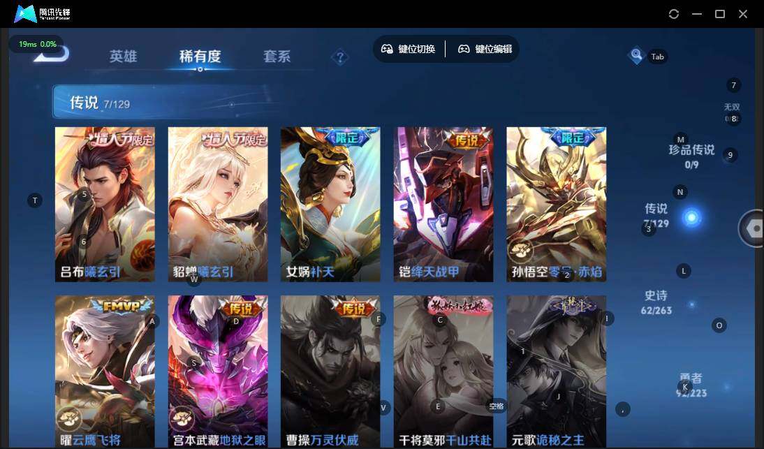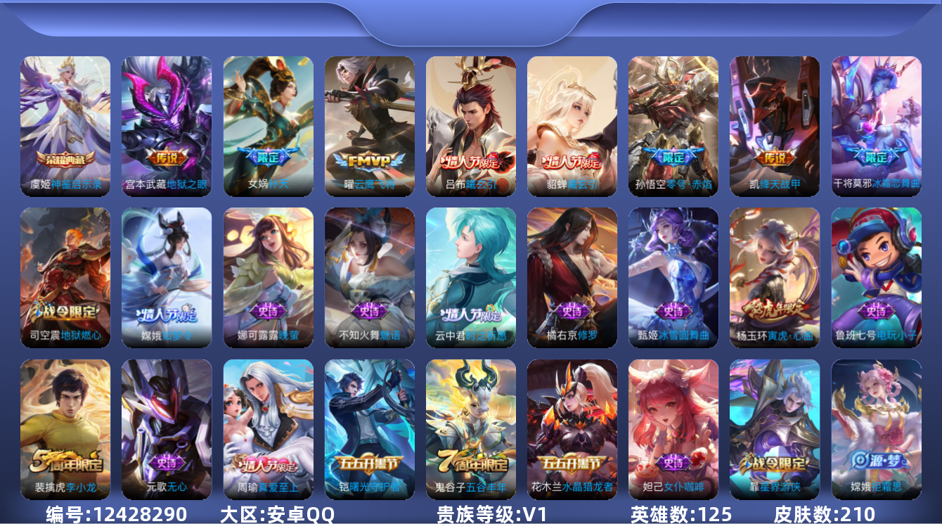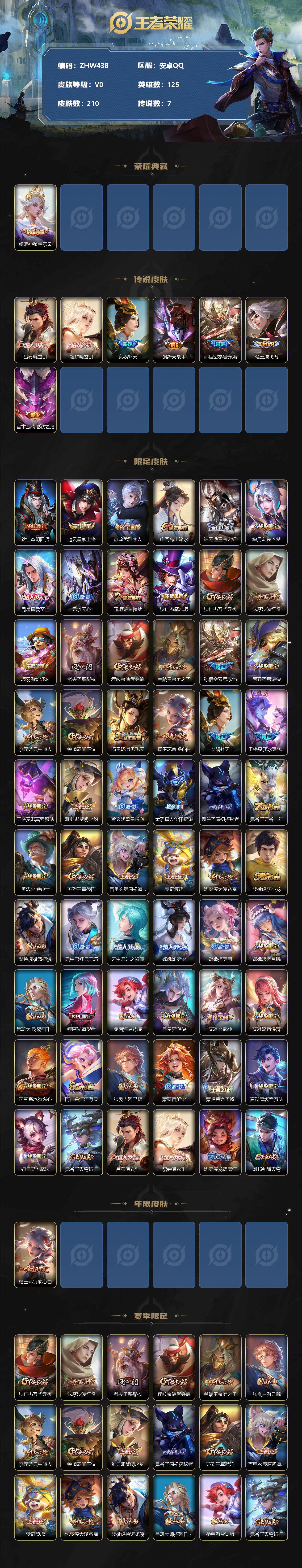 - [11688170]V7 1典藏 9传说 125英雄 235皮肤 可修改实名 优质装备:神鉴启示录,冠军飞将,炽阳神光,音你心动-小乔,胖达荣荣,大乔-时之奇旅 珍宝阁皮:蔷薇恋人,女武神 限定皮:凤凰于飞,星穹之声,白鹤梁神女,山海·碧波行(瑶年限),遇见飞天,诗剑行,无限倾心-虞姬,五谷丰年,梁祝,孙行者,乒乒小将,女儿国国王,时之祈愿-瑶(瑶传限),匿光启智者,时之奇旅-妲己,山海·玄木吟(马可年限) 史诗皮:化蝶舞,琥珀纪元伽罗,遇见神鹿,紫霞仙子,苍穹之光,黄金分割率,江河有灵,匿光侦查者,雪夜绮愿(周瑜),百解令(蒙犽),高渐离燃音魔法,蒙恬荣光圣徽,无限星赏官,匿光破解者,青蛇,晚萤,电玩·爆裂旋风,猫狗日记-孙策,时之恋人-孙尚香,乱世虎臣,女仆咖啡,水果甜心,天才门将,时之奇旅-安琪拉,功夫厨神,暗隐猎兽者,幽灵船长,鬼剑武藏,地狱岩魂,纤云弄巧,繁星吟游(呼啦呼啦),拒霜思,逐浪之夏,水晶猎龙者,曙光守护者,箭羽风息,金属风暴,圣诞狂欢,圣诞恋歌,鹰眼统帅,暗夜贵公子,魅力维加斯,奇遇舞章,天秀·音浪,无心