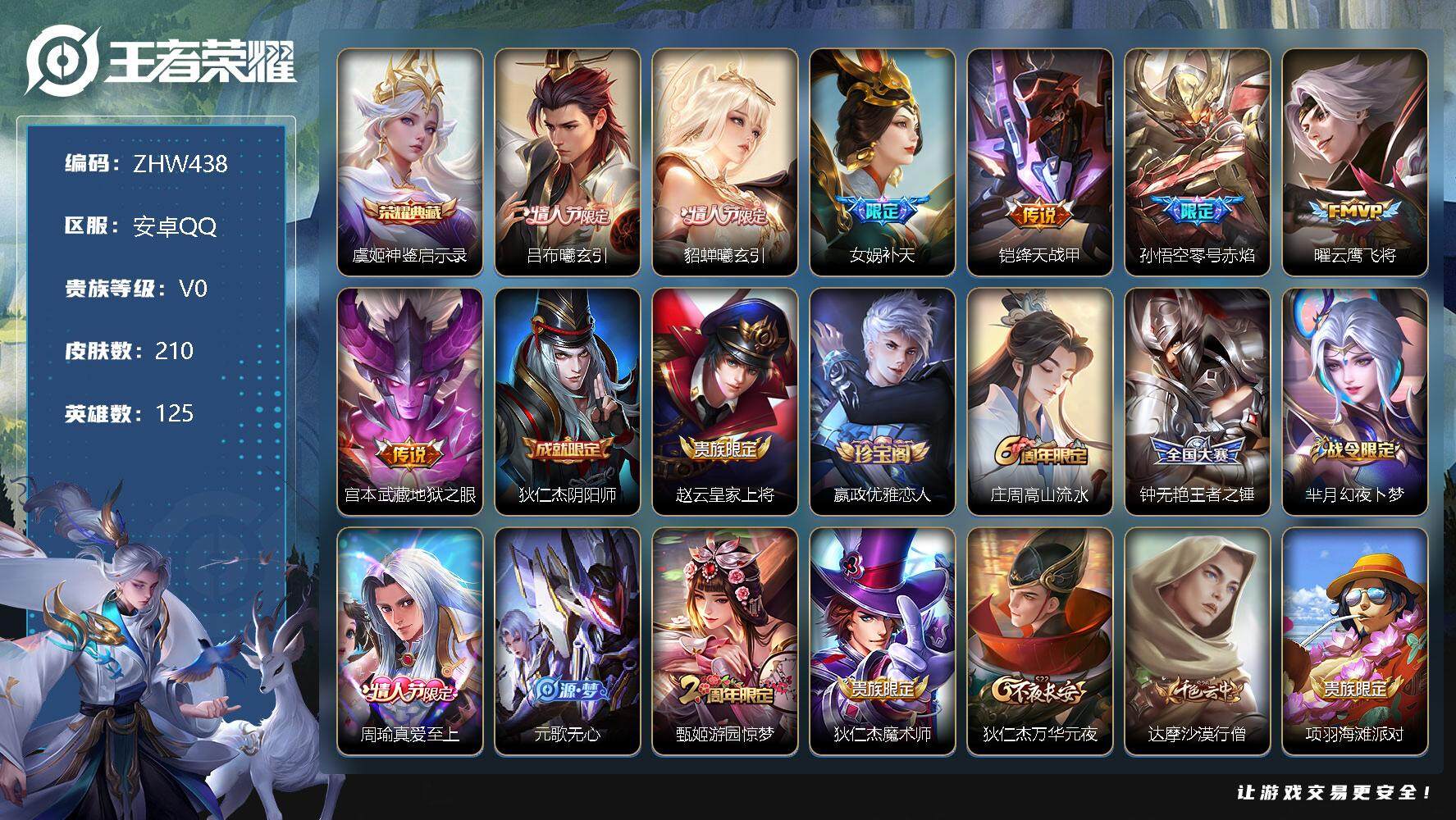 - [11297169]V8 1典藏 13传说 125英雄 305皮肤 可修改实名 优质装备:神鉴启示录,炽阳神光,末日机甲-孙尚香(绿蚂蚱),地狱火,记忆之芯(机甲兔),妄想实况,琥珀纪元马超 传说皮:幻光神枪 珍宝阁皮:优雅恋人,蔷薇恋人,女武神 限定皮:鸣野蒿,至尊宝,白虎志(电光耗子),凤求凰(白切鸡),时雨天司(水龙头),神威(电光马子),飞衡(韩信年限),遇见飞天,五谷丰年,冰锋战神,游园惊梦,梁祝,御风骁将(吕布年限),逐梦之星,天狼溯光者,逐梦之音,李小龙,逐梦之影,默契交锋-花木兰,一生所爱,大圣娶亲,青春决赛季,冰霜恋舞曲,深海之息(深海大菠萝),山海·玄木吟(马可年限) 史诗皮:化蝶舞,星界战将,石田雨龙,紫霞仙子,电玩小子(小书包),白龙吟,黄金分割率,特工魅影,千年之狐,末日机甲-莱西奥,江河有灵,百解令(蒙犽),蒙恬荣光圣徽,偶像歌手,龙骑士(小龙虾),魅语,无限星赏官,晚萤,末日机甲-吕布,猫狗日记-孙策,猫狗日记-大乔,乱世虎臣,节奏热浪,修罗,女仆咖啡,水果甜心,天才门将,星夜王子,功夫厨神,德古拉伯爵,暗隐猎兽者,幽灵船长,鬼剑武藏,天秀·启明,舞动绿茵,地狱岩魂,纤云弄巧,繁星吟游(呼啦呼啦),拒霜思,缤纷独角兽,乘风破浪,逐浪之夏,龙鼓争鸣,水晶猎龙者,曙光守护者,金属风暴,原初追逐者,圣诞狂欢,圣诞恋歌,鹰眼统帅,魅力维加斯,黎明之约,赏金猎手,无心