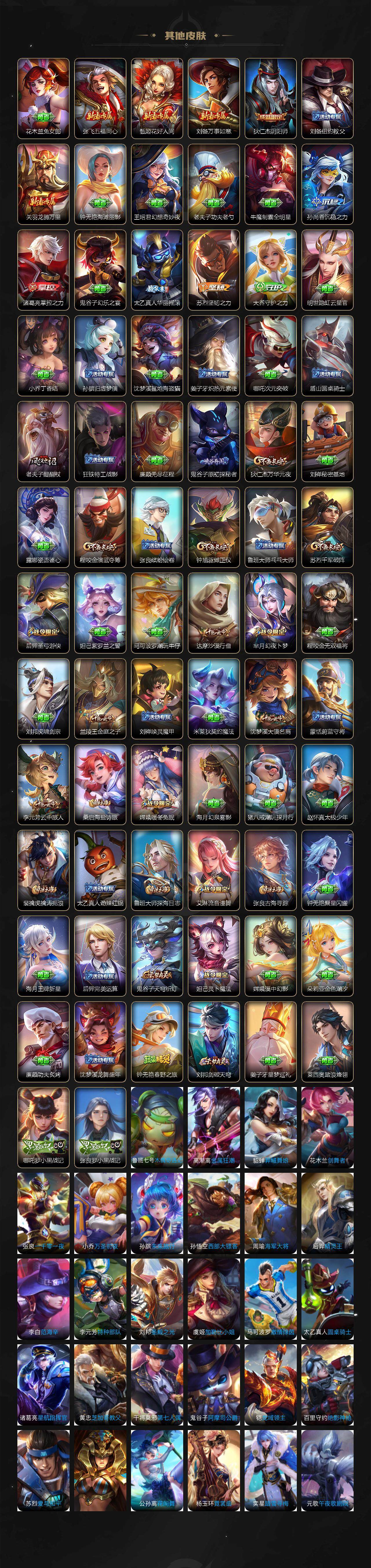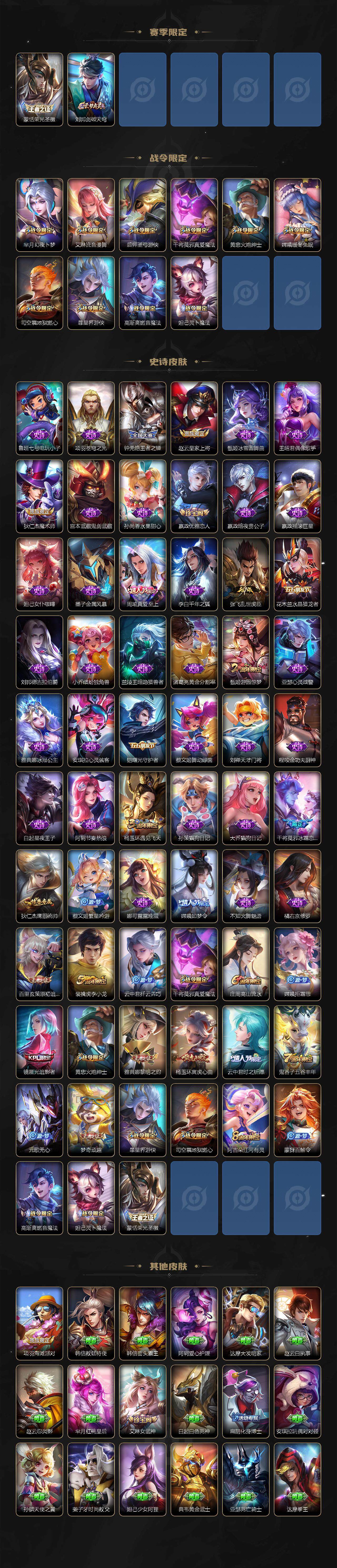 【限定皮肤】:狄仁杰阴阳师,赵云皇家上将,嬴政优雅恋人,庄周高山流水,钟无艳王者之锤,芈月幻夜卜梦,周瑜真爱至上,元歌无心,甄姬游园惊梦,狄仁杰魔术师,狄仁杰万华元夜,达摩沙漠行僧,项羽海滩派对,老夫子醍醐杖,程咬金演武夺筹,兰陵王金庭之子,孙悟空零号赤焰,后羿圣弓游侠,李元芳云中旅人,钟馗驱傩正仪,杨玉环遇见飞天,杨玉环寅虎心曲,女娲补天,干将莫邪冰霜恋舞曲,干将莫邪真爱魔法,雅典娜黎明之约,蔡文姬繁星吟游,太乙真人华丽摇滚,鬼谷子原初探秘者,鬼谷子五谷丰年,黄忠火炮绅士,苏烈千军破阵,百里玄策原初追逐者,梦奇顽趣,沈梦溪大漠名商,裴擒虎李小龙,裴擒虎擒涛扼浪,云中君纤云弄巧,云中君时之祈愿,嫦娥如梦令,嫦娥拒霜思,嫦娥暖冬兔眠,鲁班大师探海日志,镜匿光追影者,桑启海盐诗旅,暃星界游侠,艾琳女武神,艾琳流音漫舞,司空震地狱燃心,阿古朵江河有灵,张良古海寻踪,蒙犽百解令,蒙恬荣光圣徽,高渐离燃音魔法,妲己灵卜魔法,鬼谷子天穹祈灯,吕布曦玄引,貂蝉曦玄引,沈梦溪龙舞盛年,刘邦剑破天穹