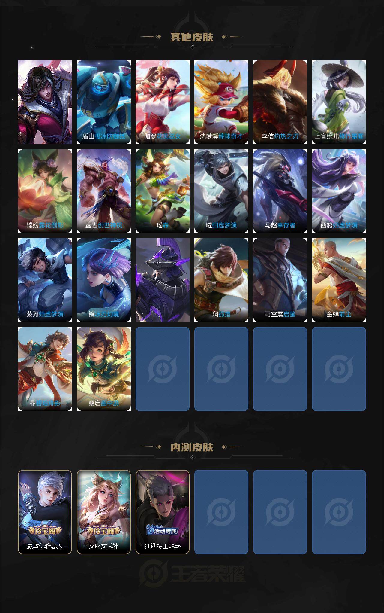 【史诗皮肤】:鲁班七号电玩小子,项羽苍穹之光,钟无艳王者之锤,赵云皇家上将,甄姬冰雪圆舞曲,王昭君偶像歌手,狄仁杰魔术师,宫本武藏鬼剑武藏,孙尚香水果甜心,嬴政优雅恋人,嬴政暗夜贵公子,嬴政摇滚巨星,妲己女仆咖啡,墨子金属风暴,周瑜真爱至上,李白千年之狐,张飞乱世虎臣,花木兰水晶猎龙者,刘邦德古拉伯爵,