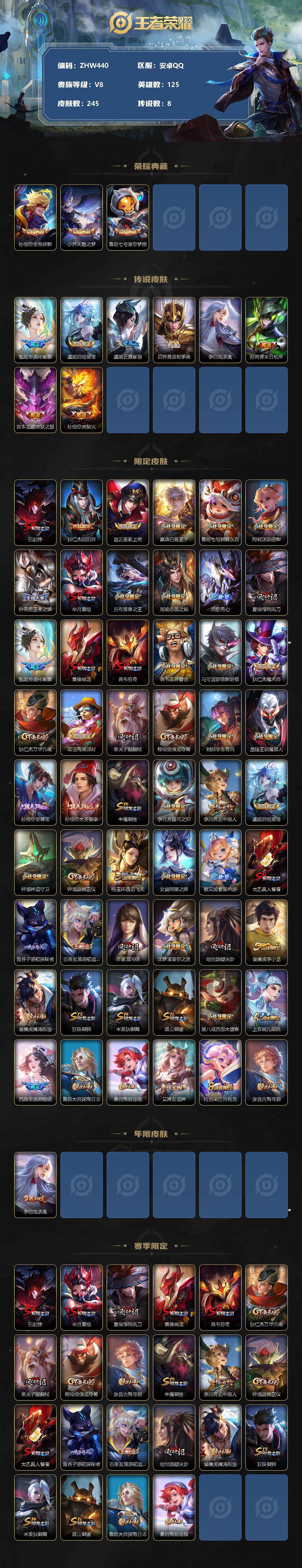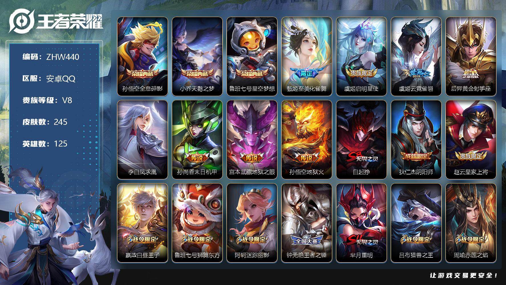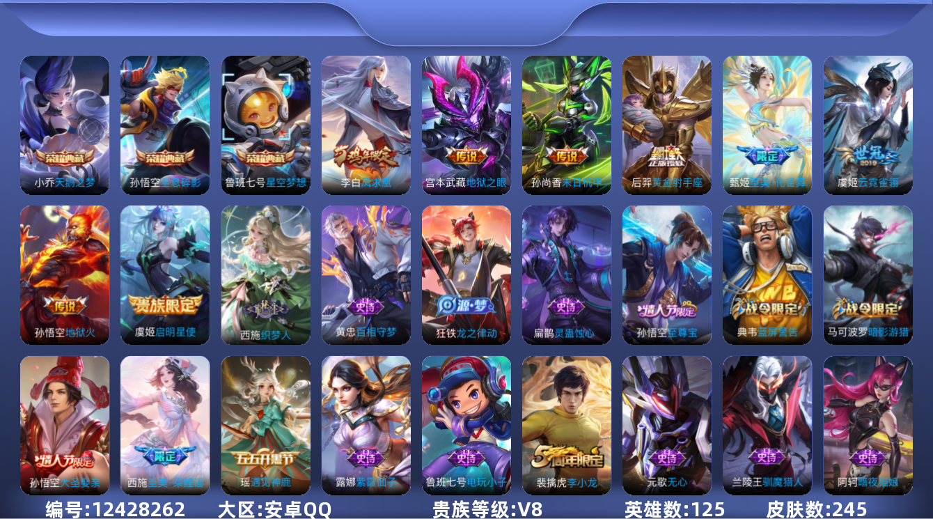[12428262]【特价急出/详情看图】:安卓Q-V8-最强王者段位-125英雄-245皮肤-3典藏-8传说-53史诗
