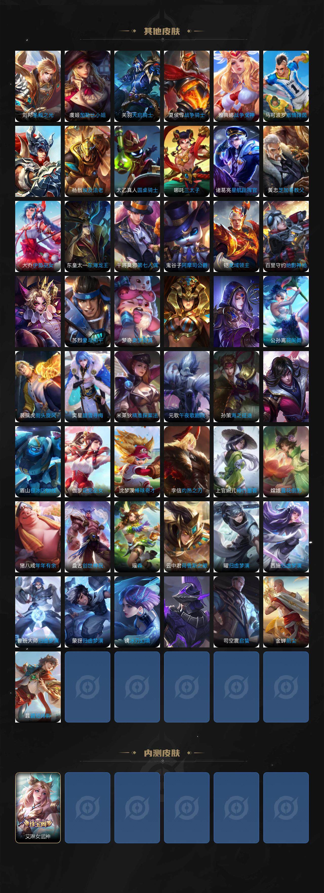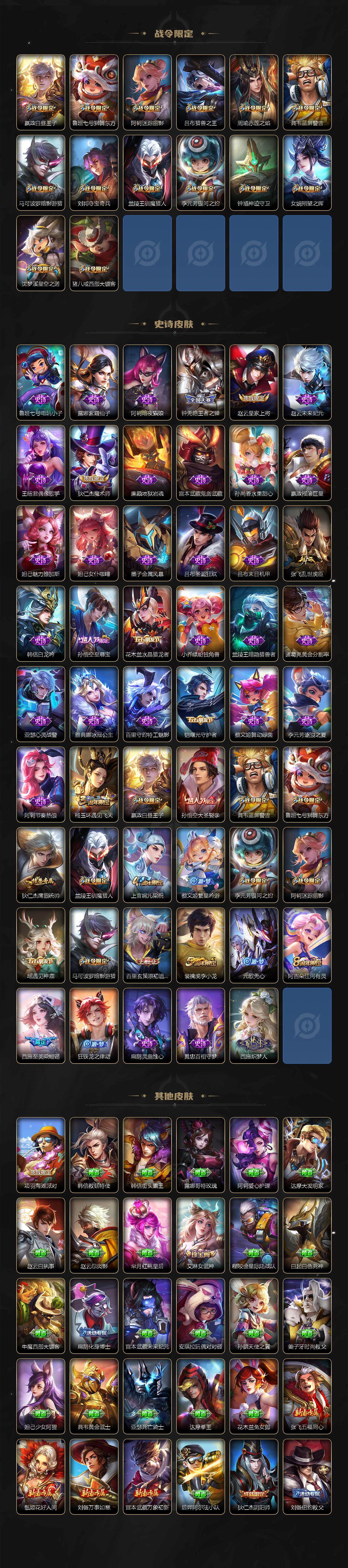 【限定皮肤】:白起狰,狄仁杰阴阳师,赵云皇家上将,嬴政白昼王子,鲁班七号狮舞东方,阿轲迷踪丽影,钟无艳王者之锤,芈月重明,吕布猎兽之王,周瑜赤莲之焰,元歌无心,夏侯惇朔风刀,甄姬至美化雀舞,曹操烛龙,典韦穷奇,典韦蓝屏警告,马可波罗暗影游猎,狄仁杰魔术师,狄仁杰万华元夜,项羽海滩派对,老夫子醍醐杖,程咬金演武夺筹,刘邦夺宝奇兵,兰陵王驯魔猎人,孙悟空至尊宝,孙悟空大圣娶亲,牛魔御旌,李元芳银河之约,李元芳云中旅人,虞姬启明星使,钟馗神迹守卫,钟馗驱傩正仪,杨玉环遇见飞天,女娲朔望之晖,蔡文姬繁星吟游,太乙真人饕餮,鬼谷子原初探秘者,百里玄策原初追逐者,弈星混沌棋,沈梦溪星空之诺,明世隐疑决卦,裴擒虎李小龙,裴擒虎擒涛扼浪,狂铁御狮,米莱狄御霄,盾山御銮,猪八戒西部大镖客,上官婉儿梁祝,西施至美乘鲤谣,鲁班大师探海日志,桑启海盐诗旅,艾琳女武神,阿古朵江河有灵,张良古海寻踪