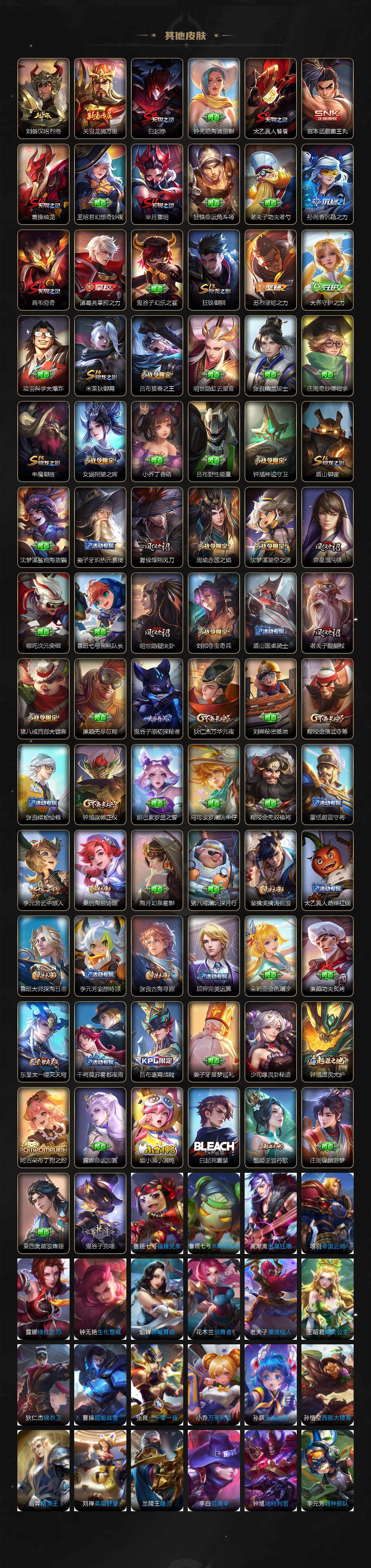 白起狰,太乙真人饕餮,曹操烛龙,芈月重明,典韦穷奇,狂铁御狮,米莱狄御霄,牛魔御旌,盾山御銮,夏侯惇朔风刀,明世隐疑决卦,老夫子醍醐杖,鬼谷子原初探秘者,狄仁杰万华元夜,程咬金演武夺筹,钟馗驱傩正仪,吕布猎兽之王,嬴政白昼王子,女娲朔望之晖,典韦蓝屏警告,钟馗神迹守卫,鲁班七号狮舞东方,沈梦溪星空之诺,李元芳银河之约,刘邦夺宝奇兵,马可波罗暗影游猎,弈星混沌棋,李元芳云中旅人,桑启海盐诗旅,裴擒虎擒涛扼浪,鲁班大师探海日志,张良古海寻踪