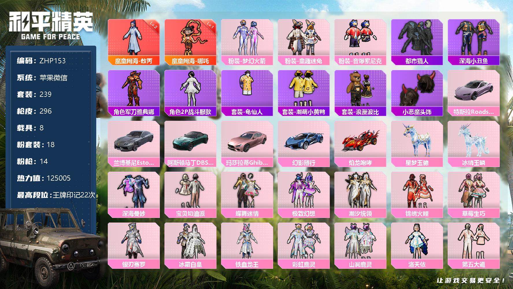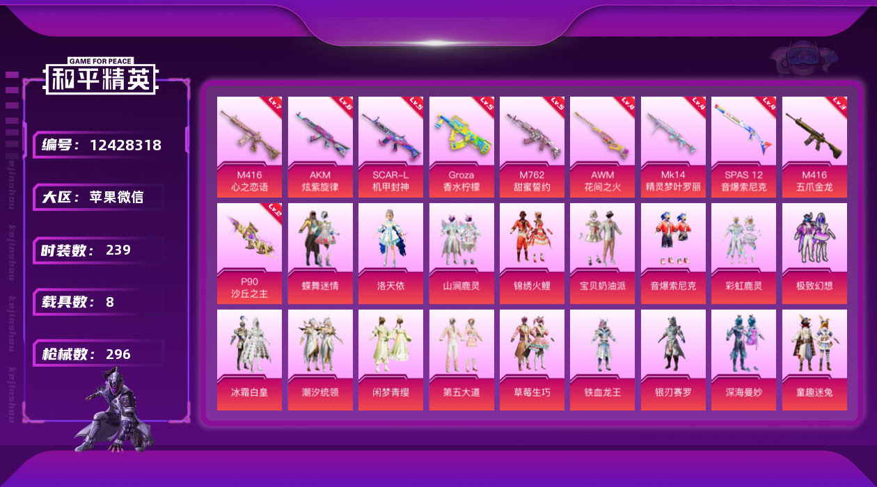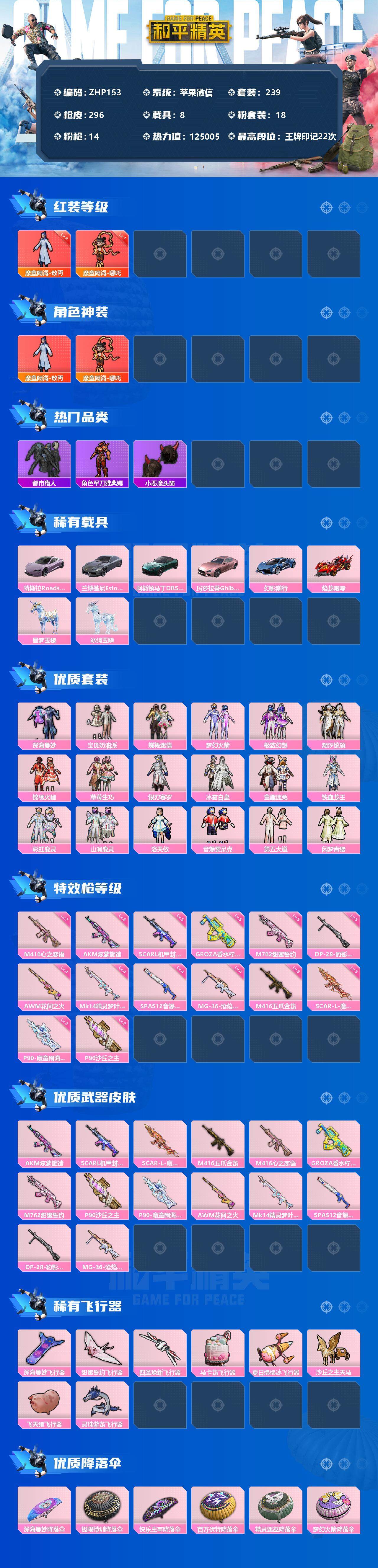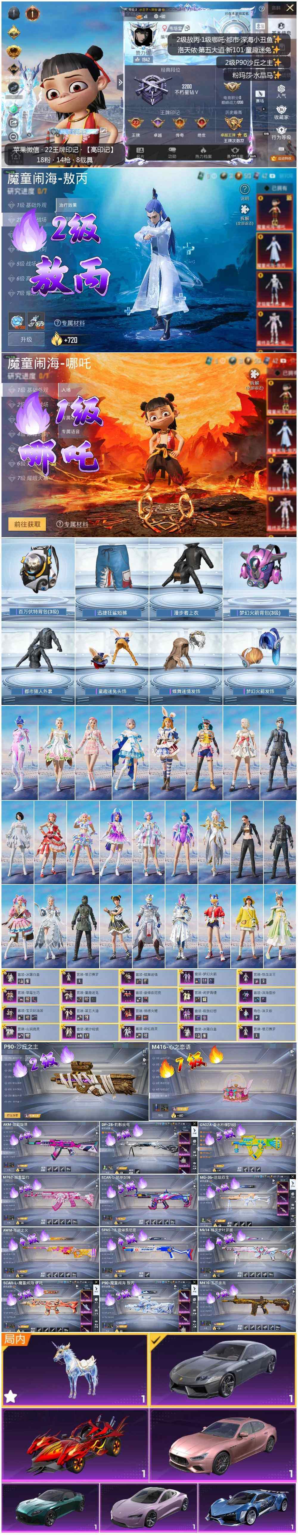 [12428318]【商品标题】:苹果2级敖丙1级哪吒新101都市深海! 微信-2神装-18粉装-14特效枪-8载具-8粉色飞行器-125005热力值-22王牌印记-239套装-296枪皮