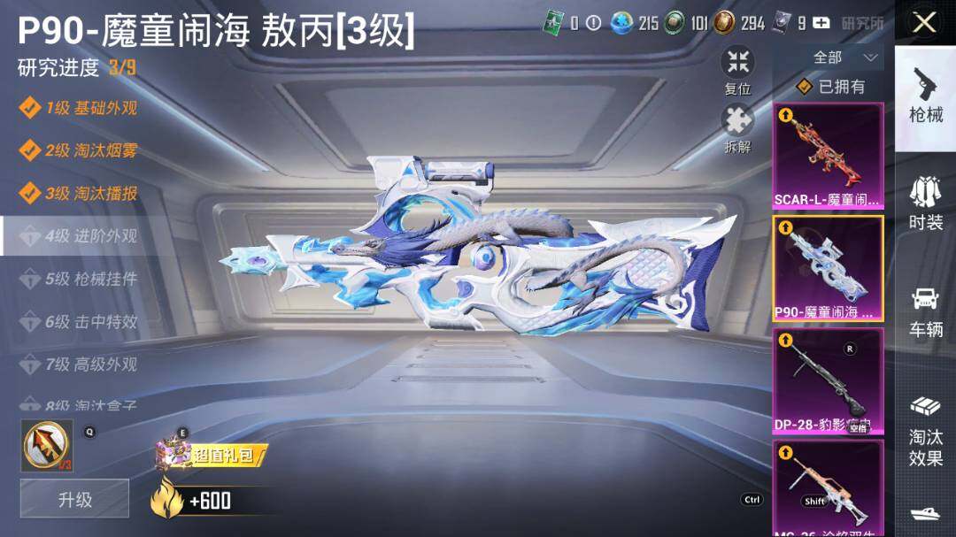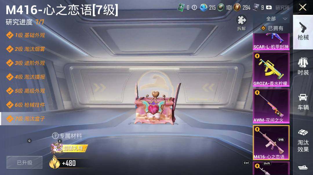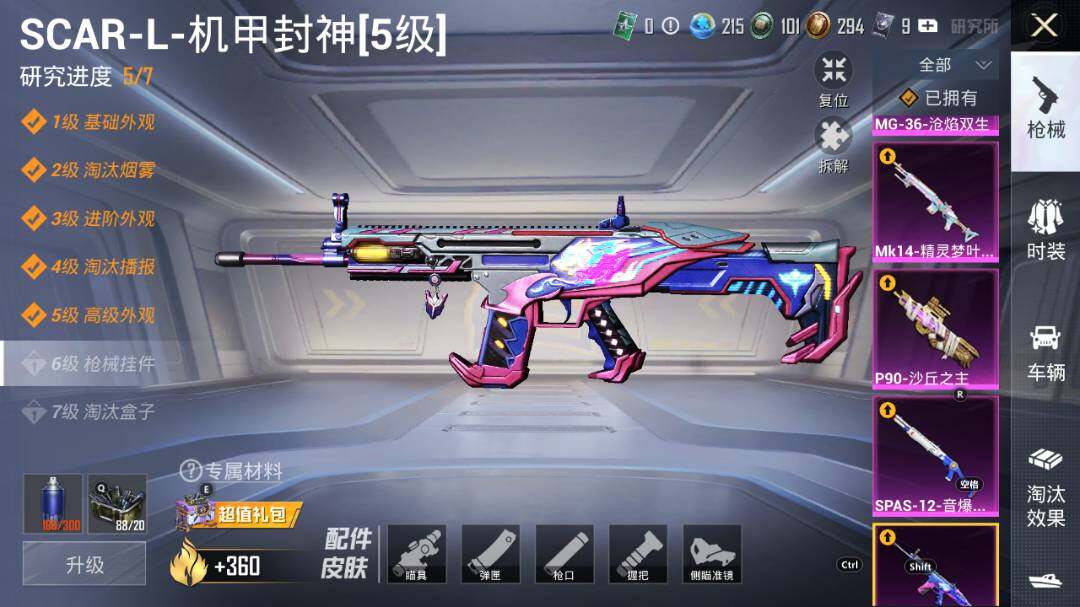 【粉色枪皮等级】:AKM-炫紫旋律(六级),SCAR-L-机甲封神(五级),SCAR-L-魔童闹海 哪吒(三级),M416-五爪金龙(三级),M416-心之恋语(七级),GROZA-香水柠檬(五级),M762-甜蜜誓约(五级),P90-沙丘之主(二级),P90-魔童闹海 敖丙(三级),AWM-花间之火(四级),Mk14-精灵梦叶罗丽(四级),SPAS-12-音爆索尼克(四级),DP-28-豹影疾电(五级),MG-36-沧焰双生(四级)