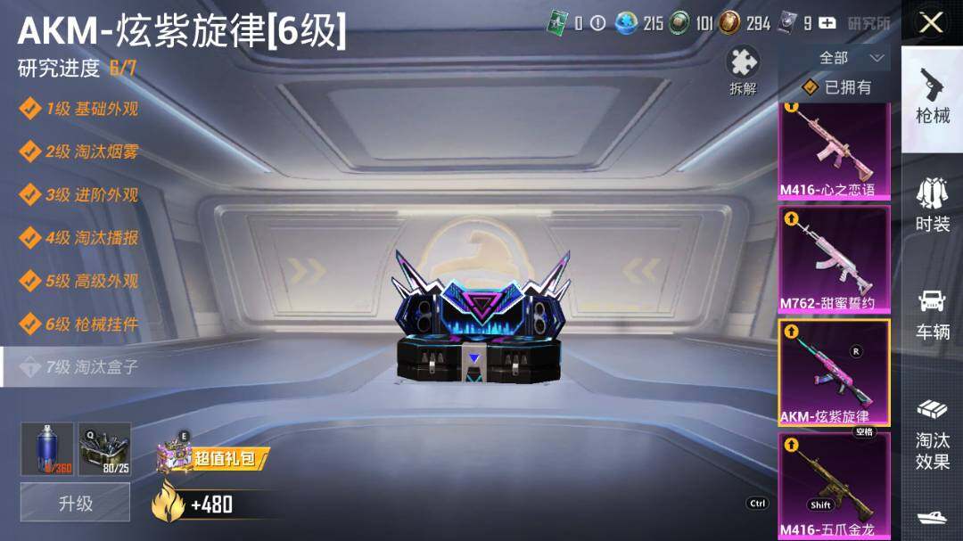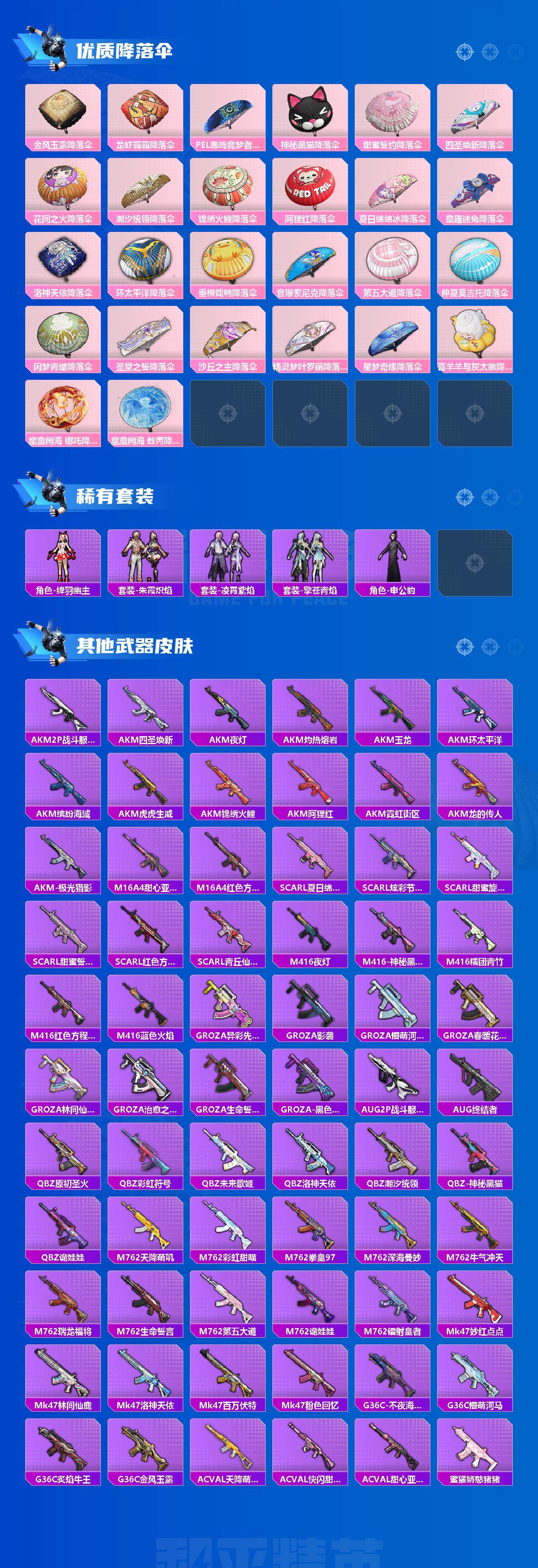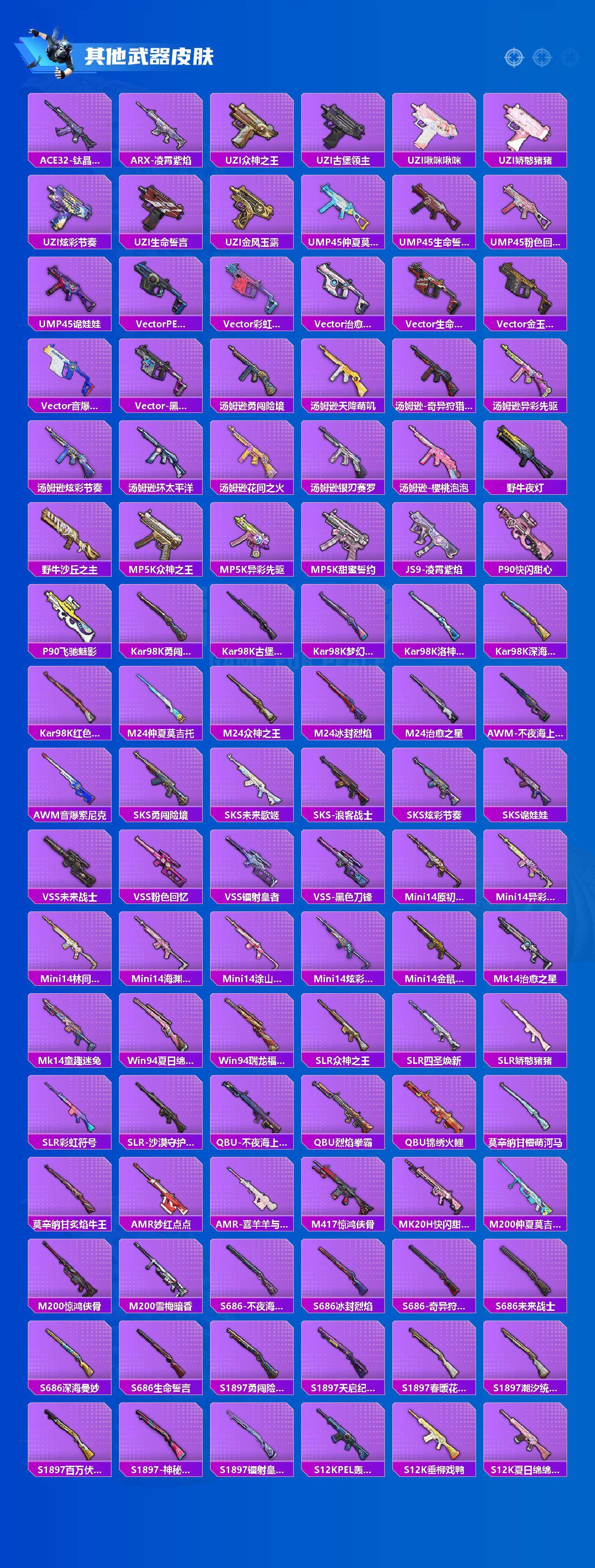 AKM-炫紫旋律,SCAR-L-机甲封神,M416-五爪金龙,M416-心之恋语,GROZA-香水柠檬,M762-甜蜜誓约,P90-沙丘之主,AWM-花间之火,Mk14-精灵梦叶罗丽,SPAS-12-音爆索尼克