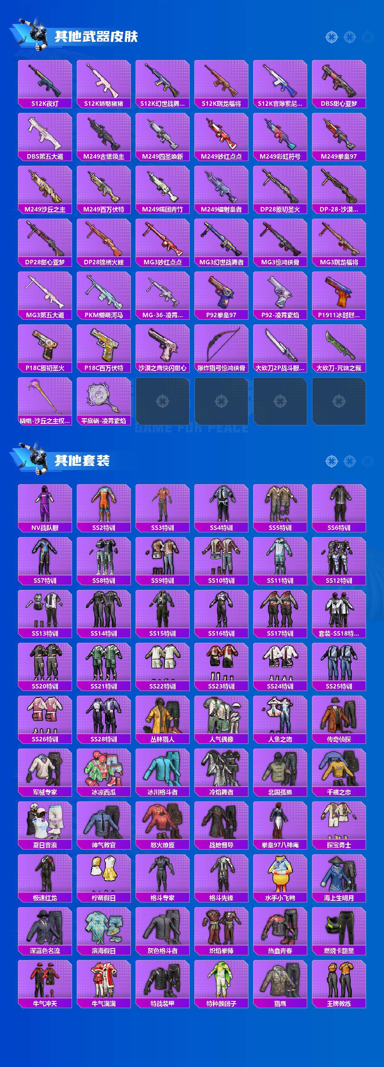 - PX_2101107-??/枪械5/装备247/载具1/战备124/王牌印记1/热力值62571/七级SCAR-L-青春物语/五级GROZA-镜光银凌/五级AUG-暖羊咩咩/五级Kar98K-巳巳如意/七级VSS-烈焰拳霸/特斯拉R沁心粉/宝贝奶油派/天使彩虹糖/冰霜白皇/王牌四分卫/橘柚倾心/赤焰黑爵/紫电风暴/未来歌姬/角色-女娲灵识/套装-龟仙人/套装-巳巳如意/套装-蜜露汐语/SCAR-L