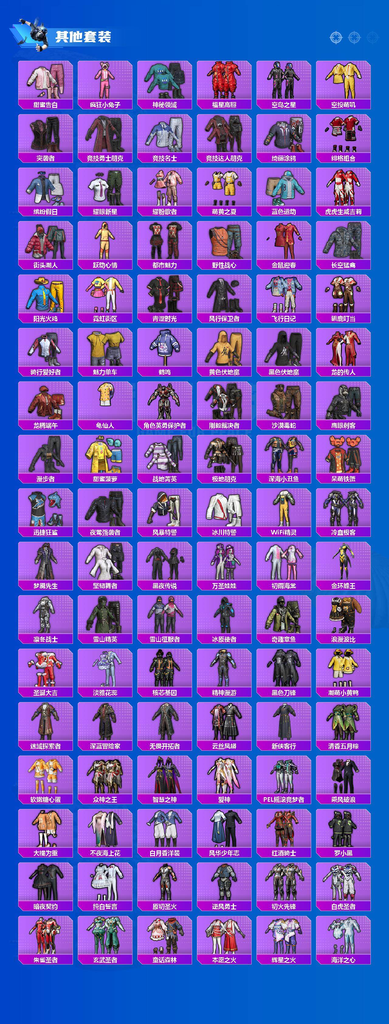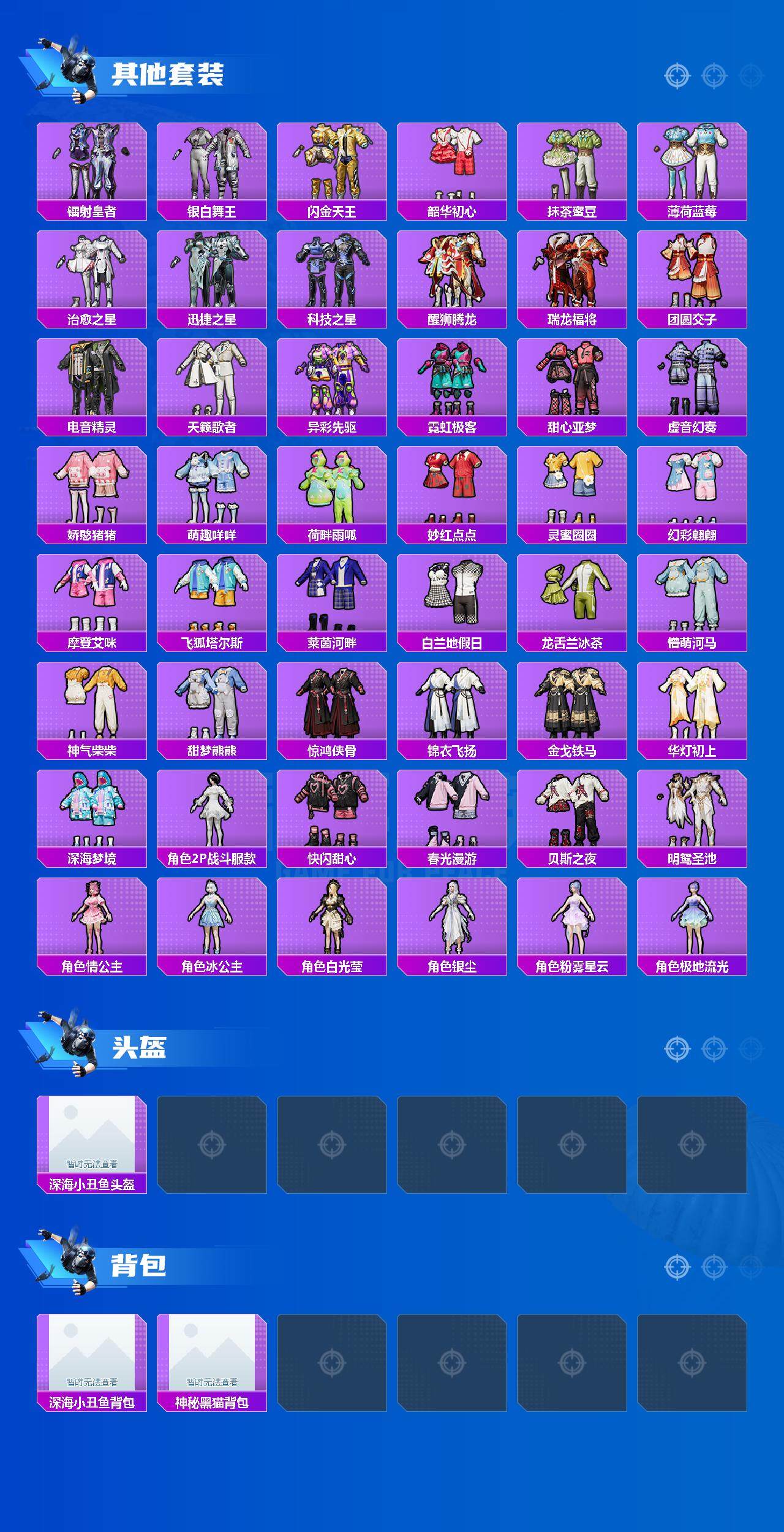 【粉色套装】:粉装-深海曼妙,粉装-宝贝奶油派,粉装-蝶舞迷情,粉装-梦幻火箭,粉装-极致幻想,粉装-潮汐统领,粉装-锦绣火鲤,粉装-草莓生巧,粉装-银刃赛罗,粉装-冰霜白皇,粉装-童趣迷兔,粉装-铁血龙王,粉装-彩虹鹿灵,粉装-山涧鹿灵,角色-洛天依,粉装-音爆索尼克,粉装-第五大道,粉装-闲梦青缨