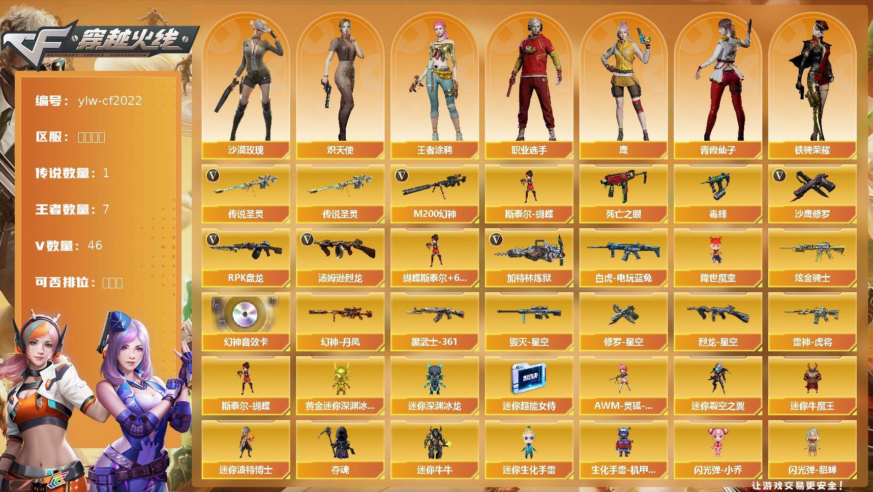 [12428701]【商品标题】:湖北一区-46V-7王者-1炫金 【传说武器】:传说圣灵 【热门武器】:传说圣灵,M200-幻神,死亡之眼,白虎-电玩蓝兔,毒蜂,汤姆逊-烈龙*6,RPK-盘龙*6,加特林-炼狱*2,斯泰尔-蝴蝶,降世魔童,沙鹰-修罗 【王者炫金武器】:炫金骑士 【音效卡】:M200-幻神音效卡 【稀有皮肤】:幻神-丹凤,雷神-虎将,毁灭-星空,AK47-黑武士-361,烈龙-星空,M200-庆典-CFS 2021,AWM-CFS 2020*2,修罗-星空 【角色】:王者涂鸦,鹰,炽天使,新灵狐者,铁骑荣耀,沙漠玫瑰,职业选手,青霞仙子,战地猎狐 【人偶武器】:降世魔童,斯泰尔-蝴蝶,AWM-灵狐-15周年嘉年华,黄金迷你深渊冰龙,迷你深渊冰龙,迷你超能女侍,迷你裂空之翼,迷你牛魔王,迷你波特博士,夺魂,迷你牛牛,迷你生化手雷*5,生化手雷-机甲核心,闪光弹-小乔,闪光弹-貂蝉,高爆手雷-大乔 【暴走生化】:斯泰尔-蝴蝶,毒蜂,死亡之眼,双面神,超级对讲机 【挑战大师】:机甲撕裂者III,神圣爆裂者-末日III*2,激光毁灭者III*2,AK47-冰龙粉碎者,冰龙粉碎者-白马银枪 【英雄级武器】:烟雾弹-竞技荣光,M4A1-幻灵,幻灵之锋,白虎-电玩蓝兔,无影-神兵利器,M4A1-雷神,M4A1-玫瑰精灵,RPK-盘龙*6,加特林-炼狱*2,汤姆逊-烈龙*6,AK47-火麒麟,Barrett-毁灭,AWM-裁决,Barrett-朱雀,M200-幻神,AK-47-猩红传说,AK47-B-常胜将军,M4A1-赤狱骑士,沙鹰-修罗,麒麟刺,屠龙 【特殊枪械】:蝴蝶斯泰尔+6烈龙,0白虎,0黑骑士,6烈龙,6盘龙,2炼狱,1蝴蝶斯泰尔