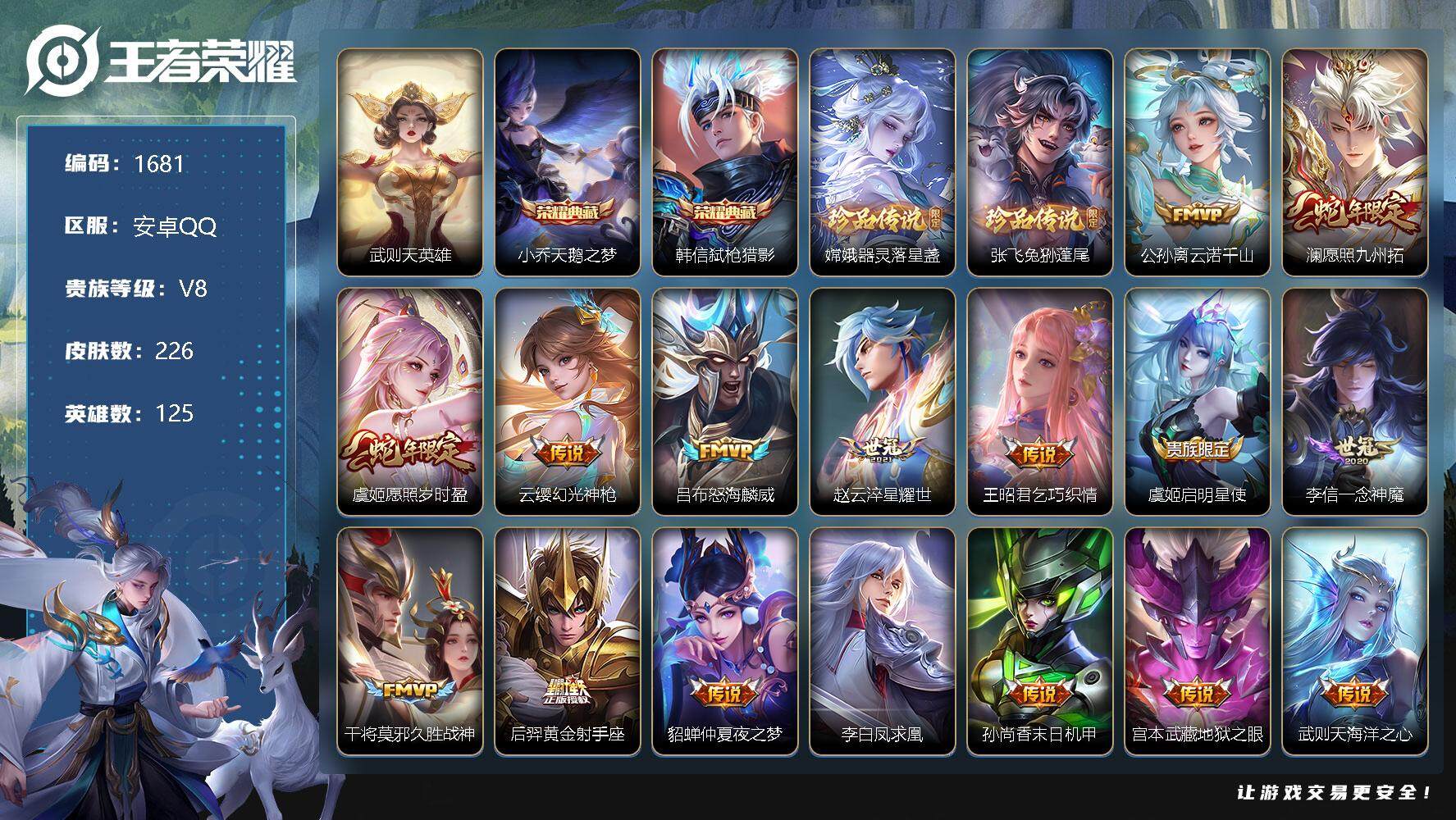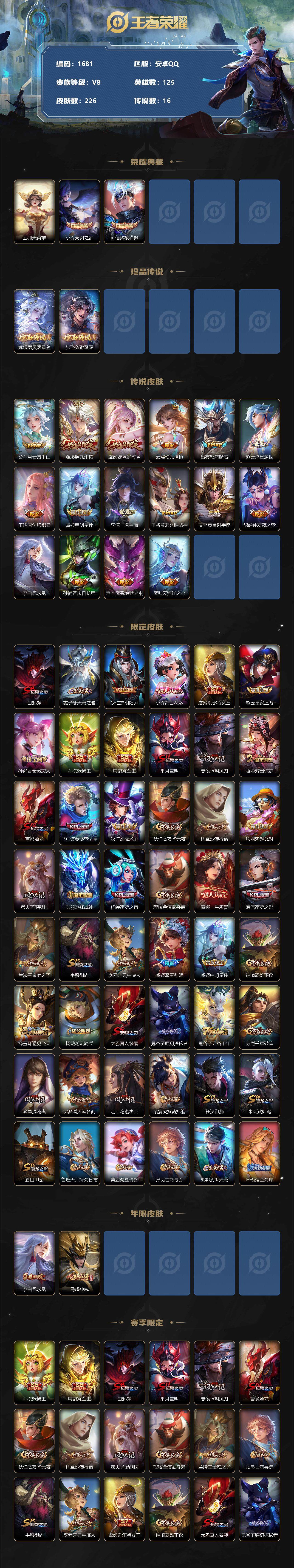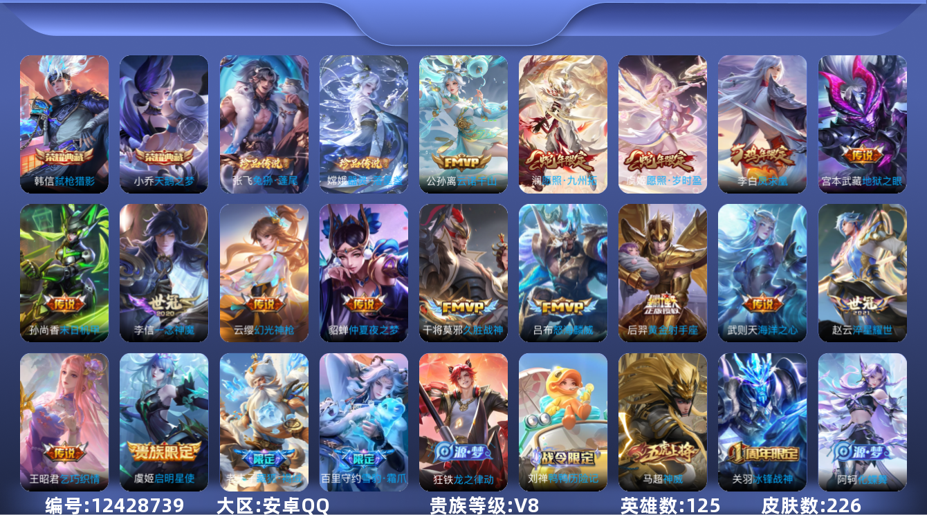 [12428739]【商品标题】:安卓Q-V4-最强王者段位-125英雄-226皮肤-2典藏-0珍品无双-0无双-2珍品传说-16传说-51史诗