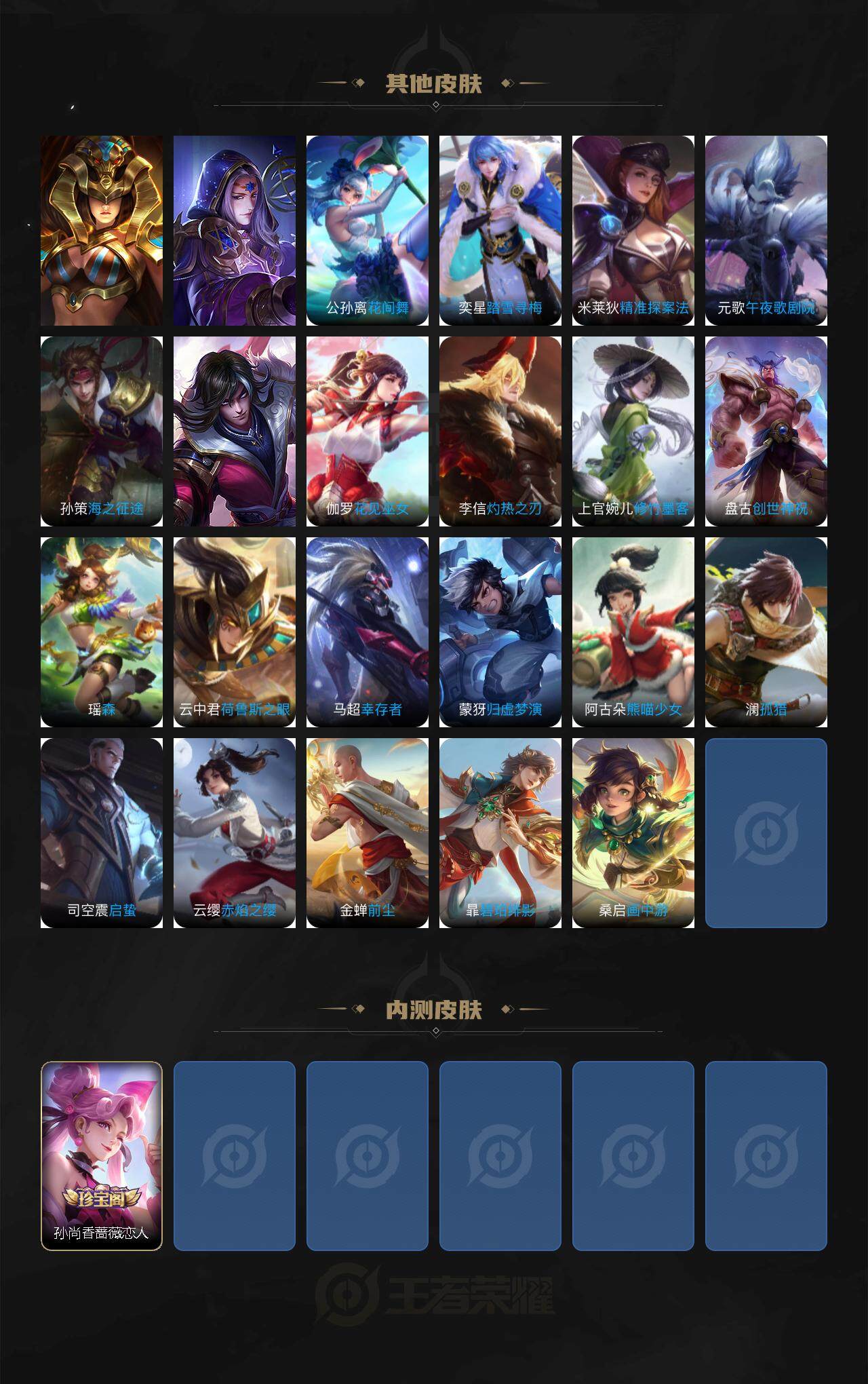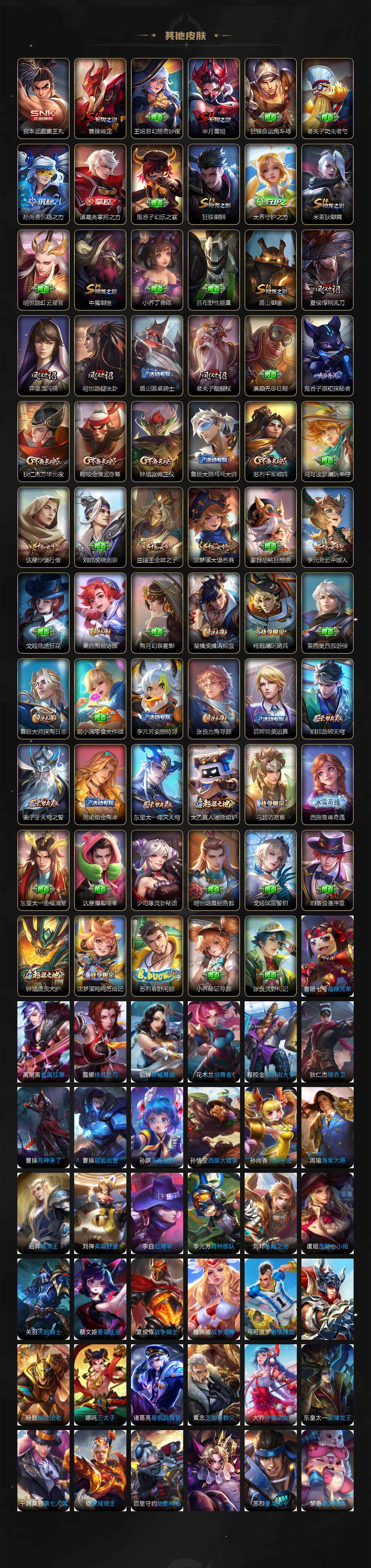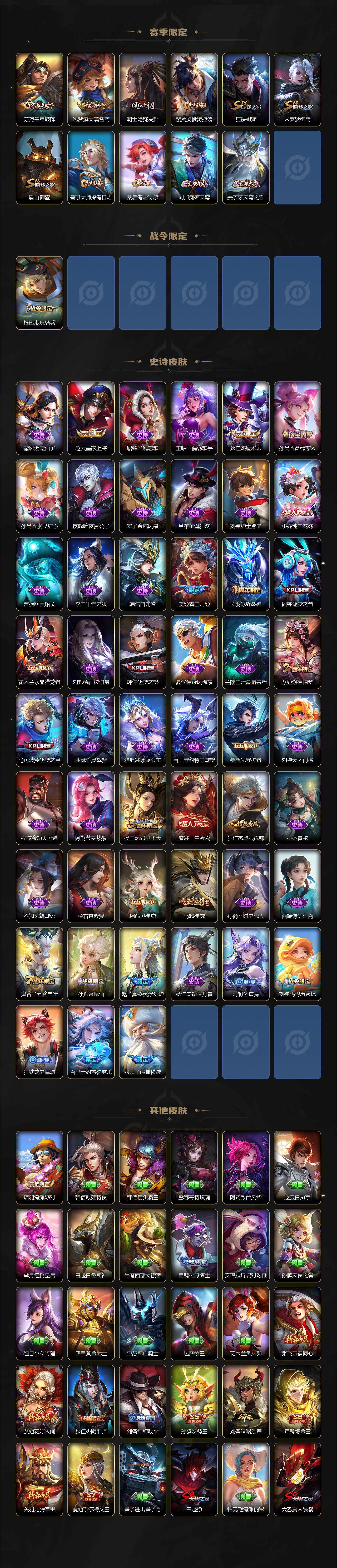 【赛季限定】:孙膑妖精王,扁鹊炼金王,白起狰,芈月重明,夏侯惇朔风刀,曹操烛龙,狄仁杰万华元夜,达摩沙漠行僧,老夫子醍醐杖,程咬金演武夺筹,兰陵王金庭之子,张良古海寻踪,牛魔御旌,李元芳云中旅人,虞姬凯尔特女王,钟馗驱傩正仪,太乙真人饕餮,鬼谷子原初探秘者,苏烈千军破阵,弈星混沌棋,沈梦溪大漠名商,明世隐疑决卦,裴擒虎擒涛扼浪,狂铁御狮,米莱狄御霄,盾山御銮,鲁班大师探海日志,桑启海盐诗旅,刘邦剑破天穹,姜子牙天穹之誓